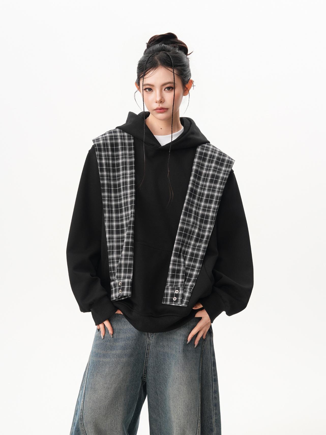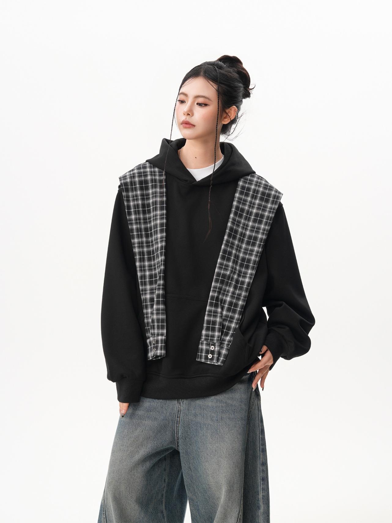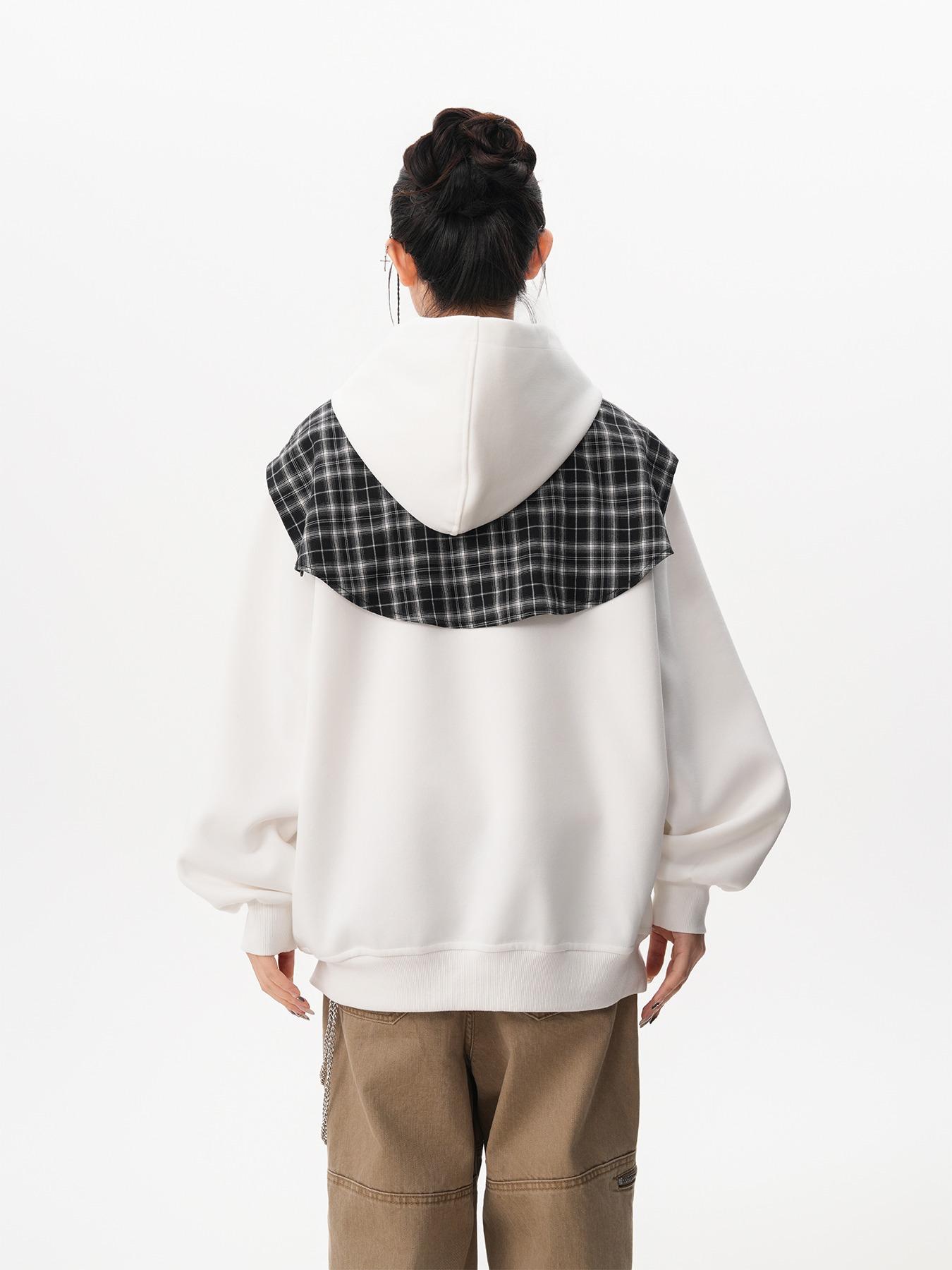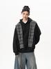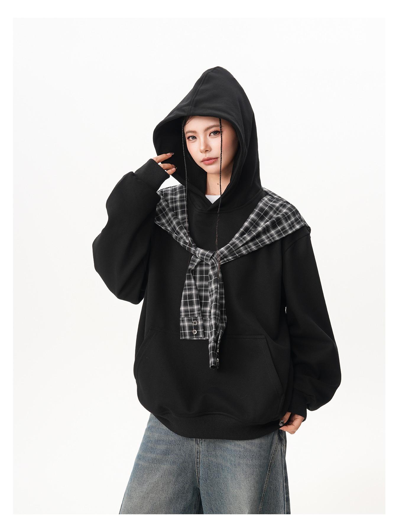 Chal de cuadros con bloques de color Sudadera con capucha de dos piezas falsas Mujer Hombre Otoño Sentido del diseño de minoría Perezoso Versátil Top para pareja