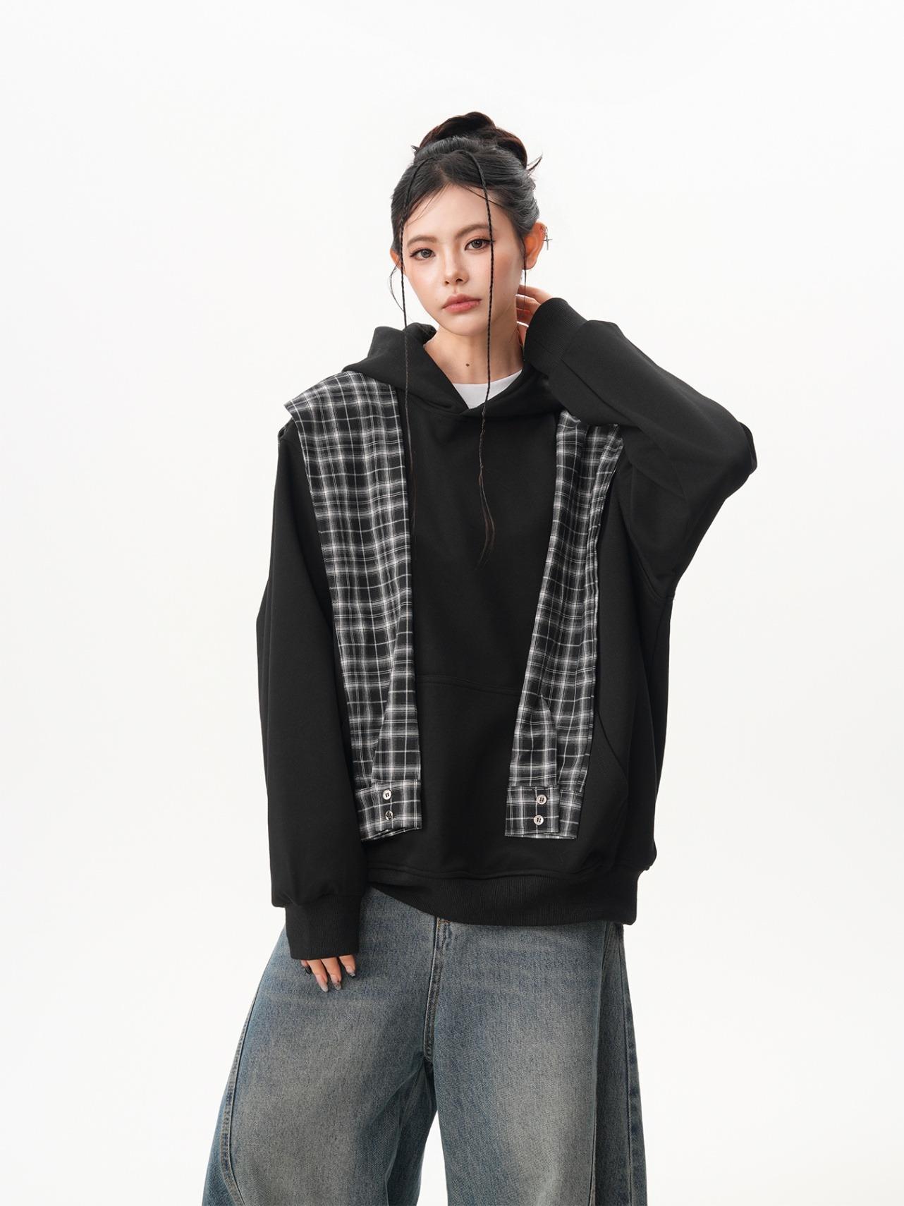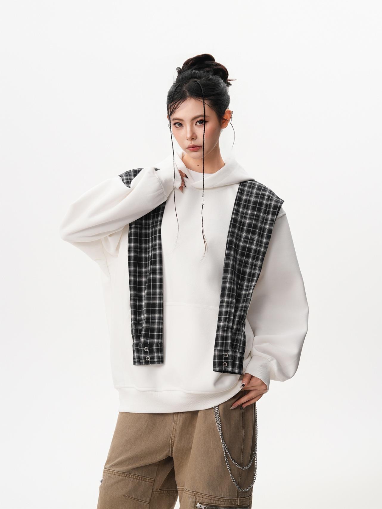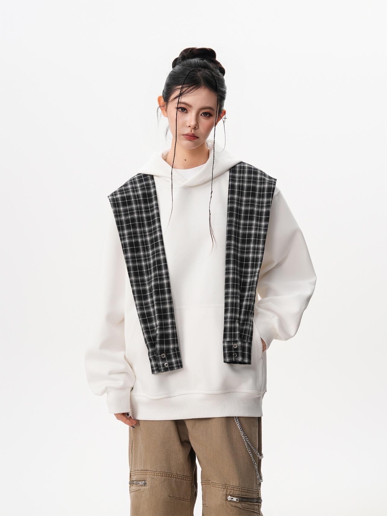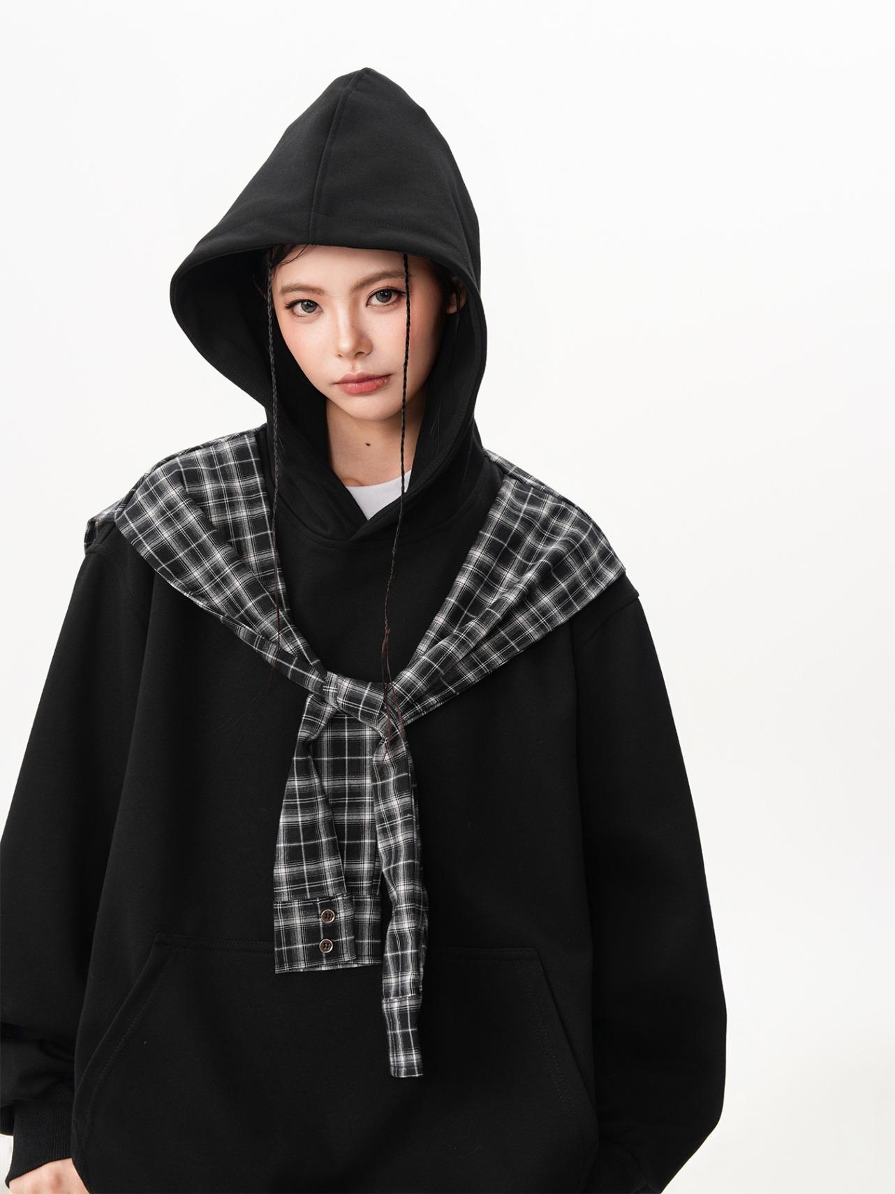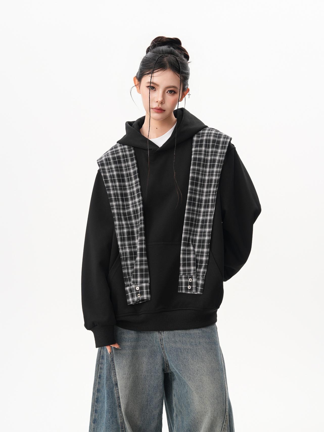 Chal de cuadros con bloques de color Sudadera con capucha de dos piezas falsas Mujer Hombre Otoño Sentido del diseño de minoría Perezoso Versátil Top para pareja