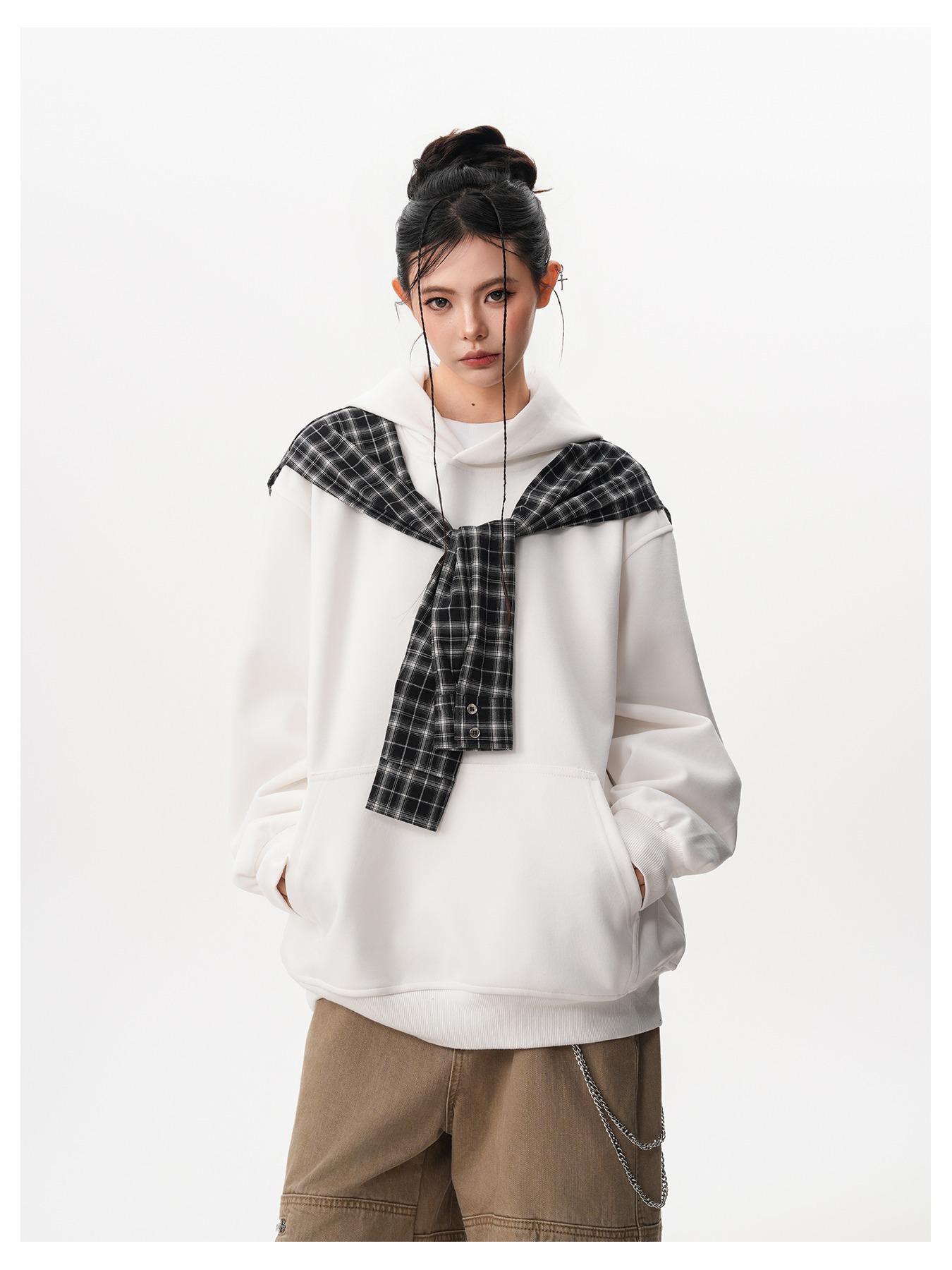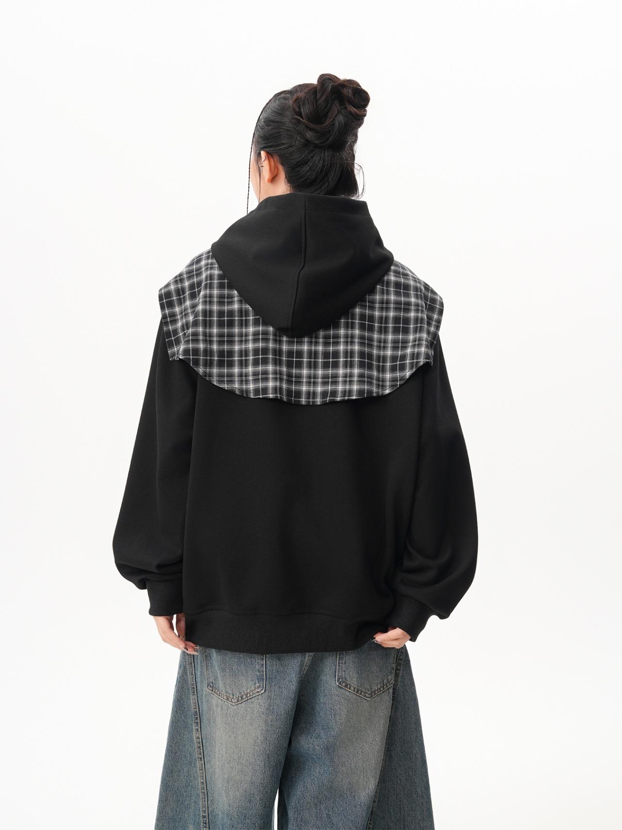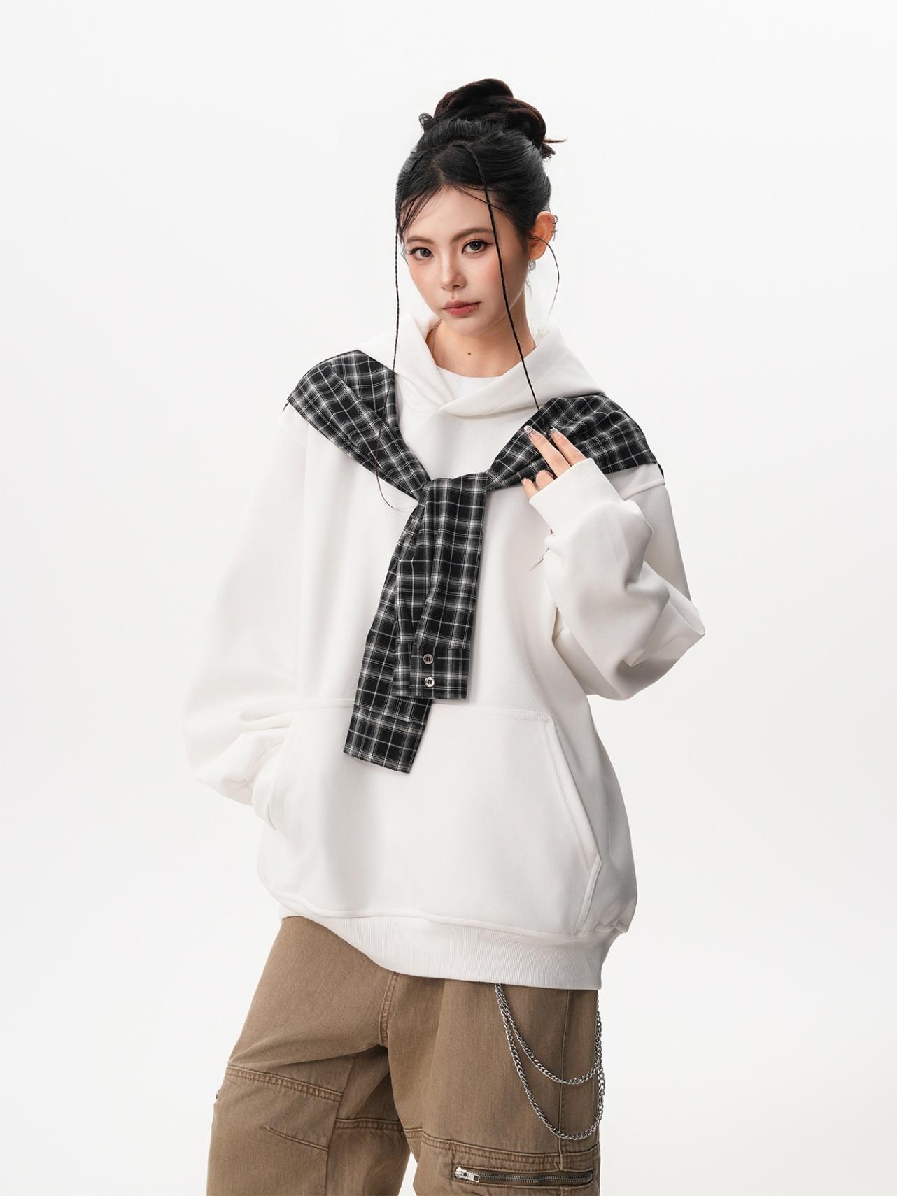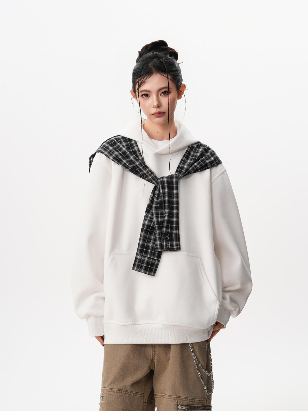 Chal de cuadros con bloques de color Sudadera con capucha de dos piezas falsas Mujer Hombre Otoño Sentido del diseño de minoría Perezoso Versátil Top para pareja