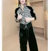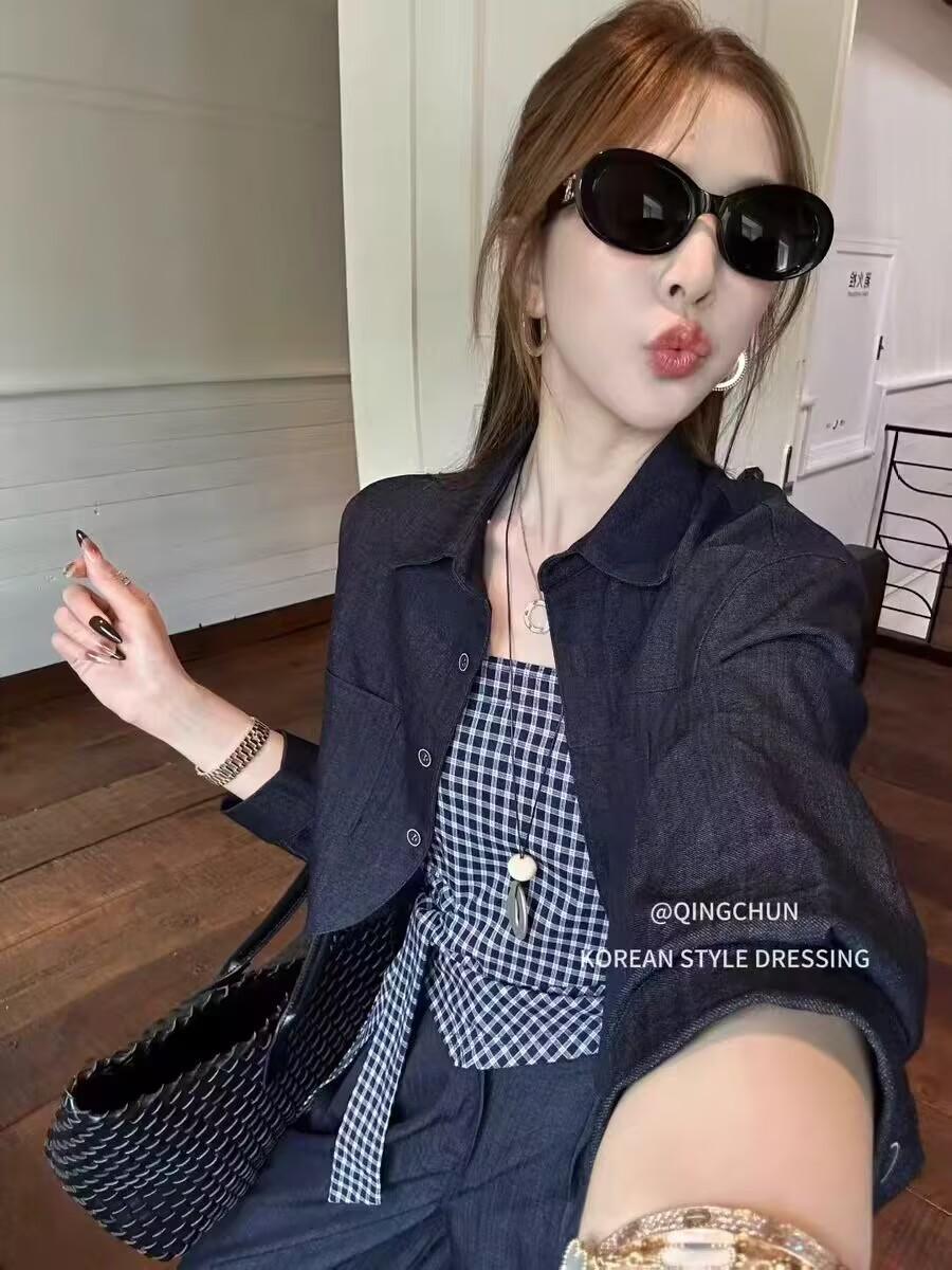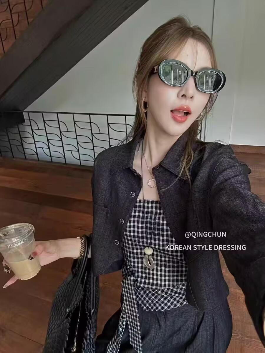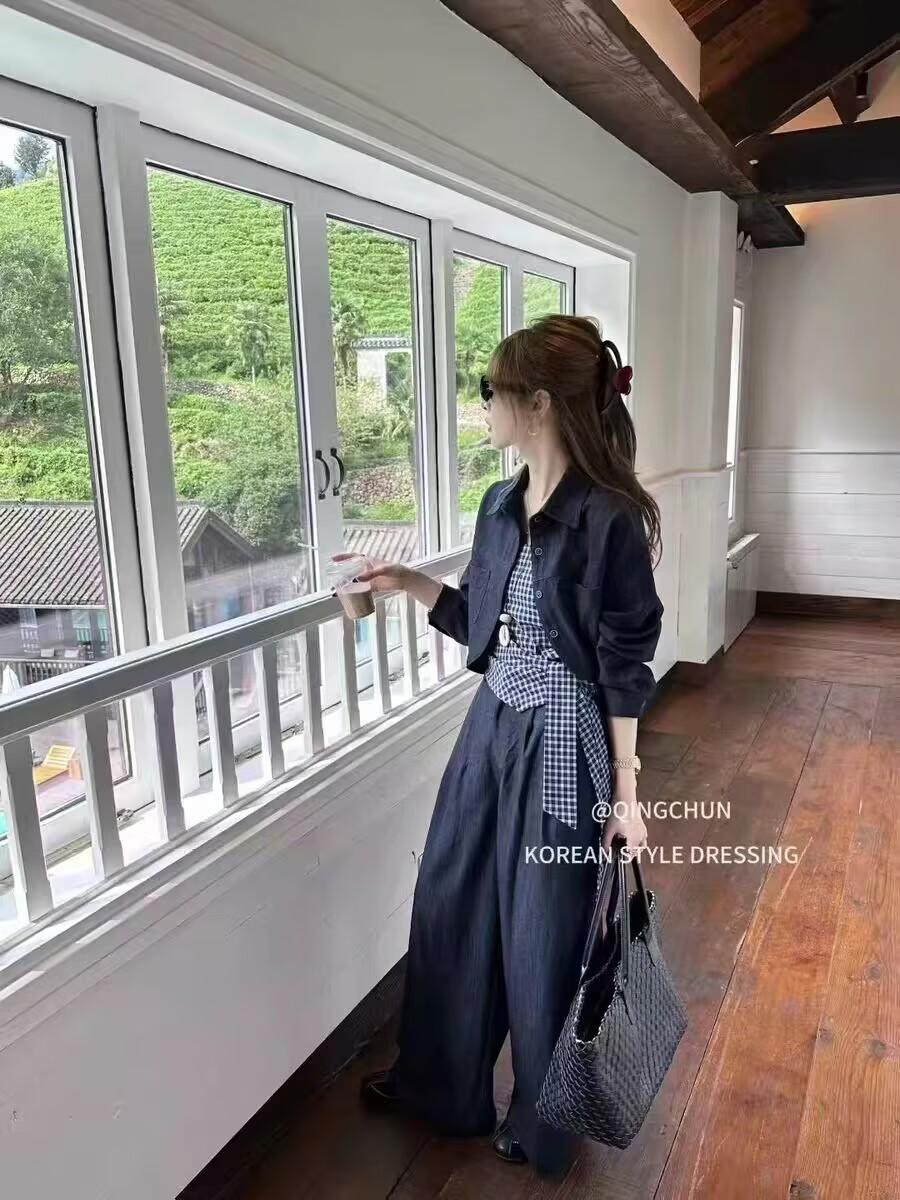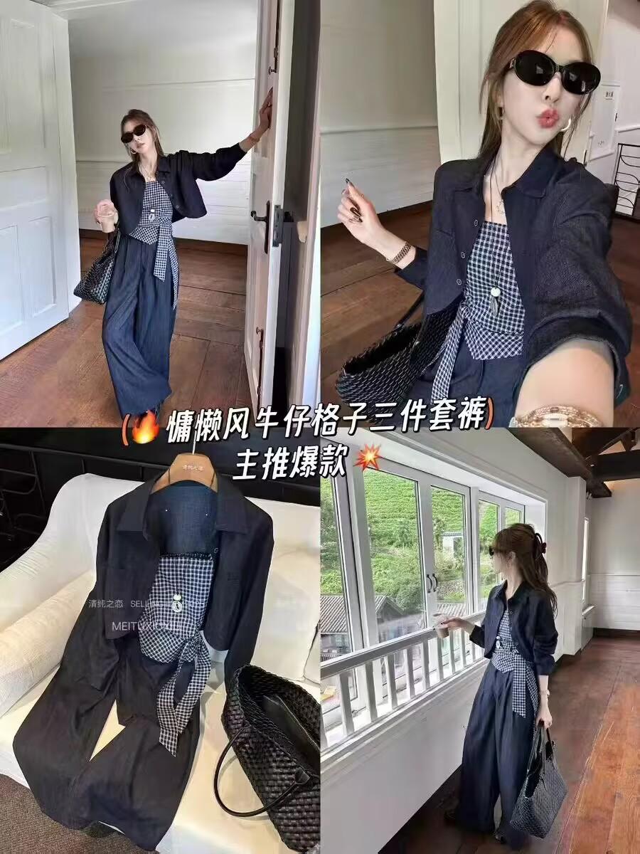 Otoño 2025 Nueva Moda Versátil Retro Shorts Chaqueta Ropa Interior Chaleco a Cuadros + Pantalones de Pierna Ancha Conjunto de Tres Piezas Tendencia
