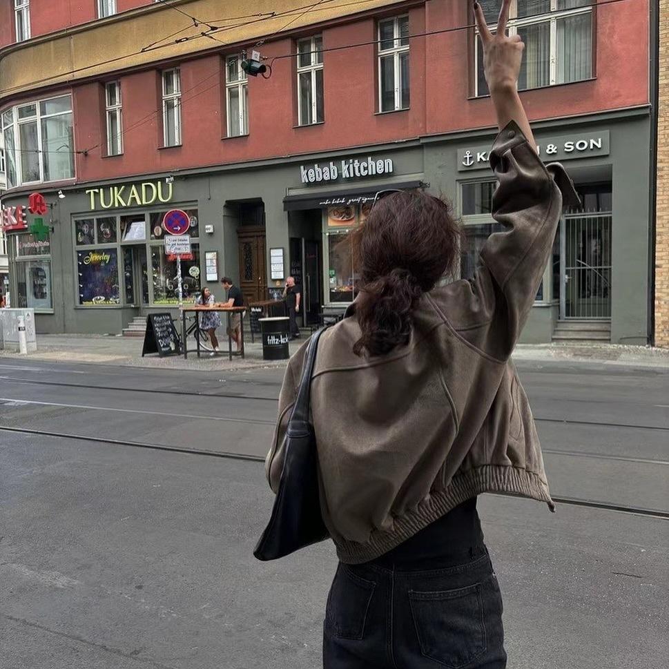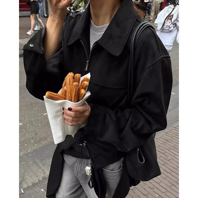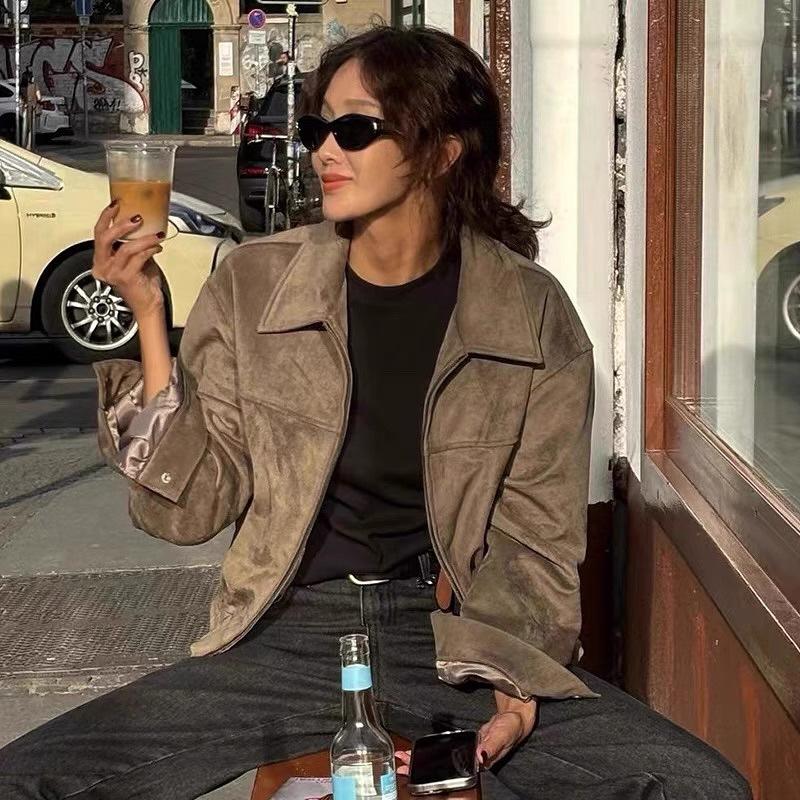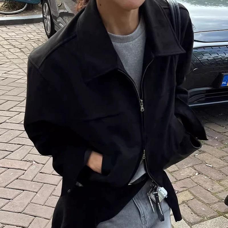 Chaqueta biker coreana chic de otoño de gamuza de manga larga con doble cremallera para mujer, chaqueta corta