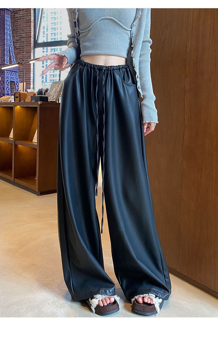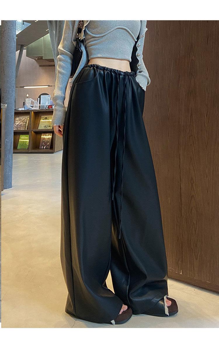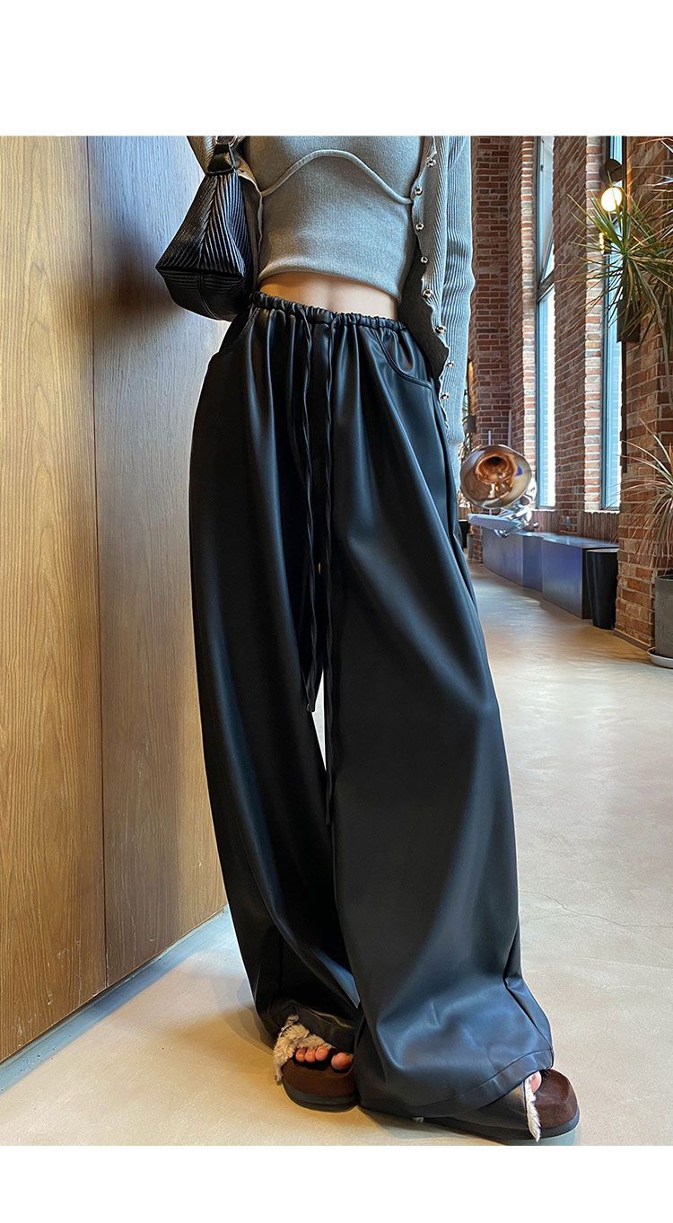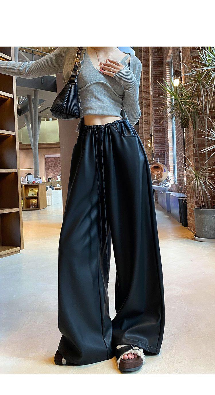 Pantalones de Cuero Negros de Pierna Ancha para Mujer Otoño e Invierno 2025 Nuevo Cuero Pu Mate Pantalones Casuales Sueltos Adelgazantes de Pierna Recta Largos hasta el Piso