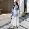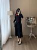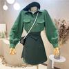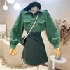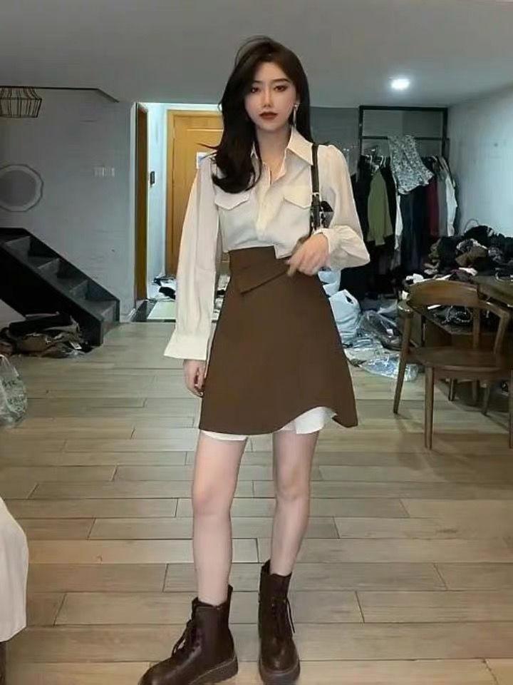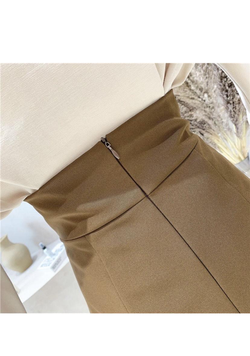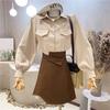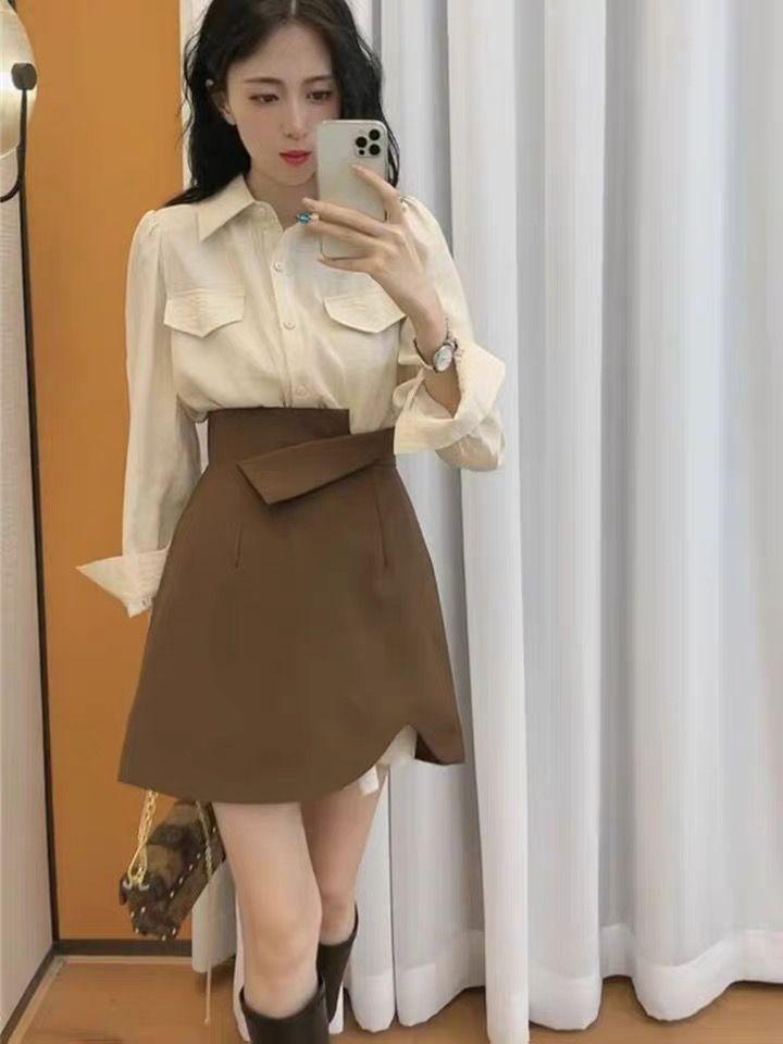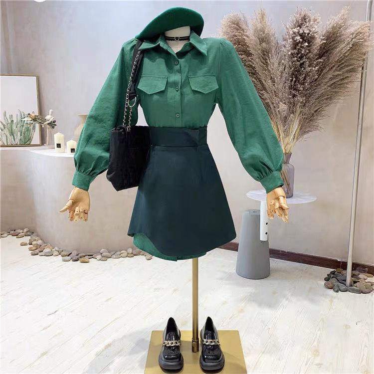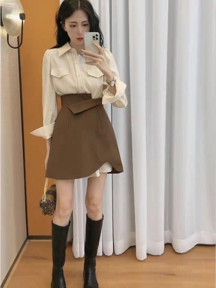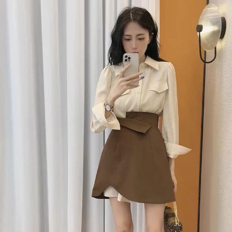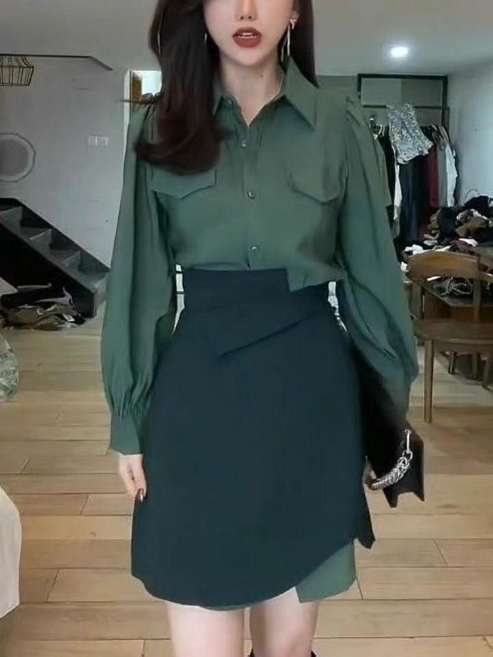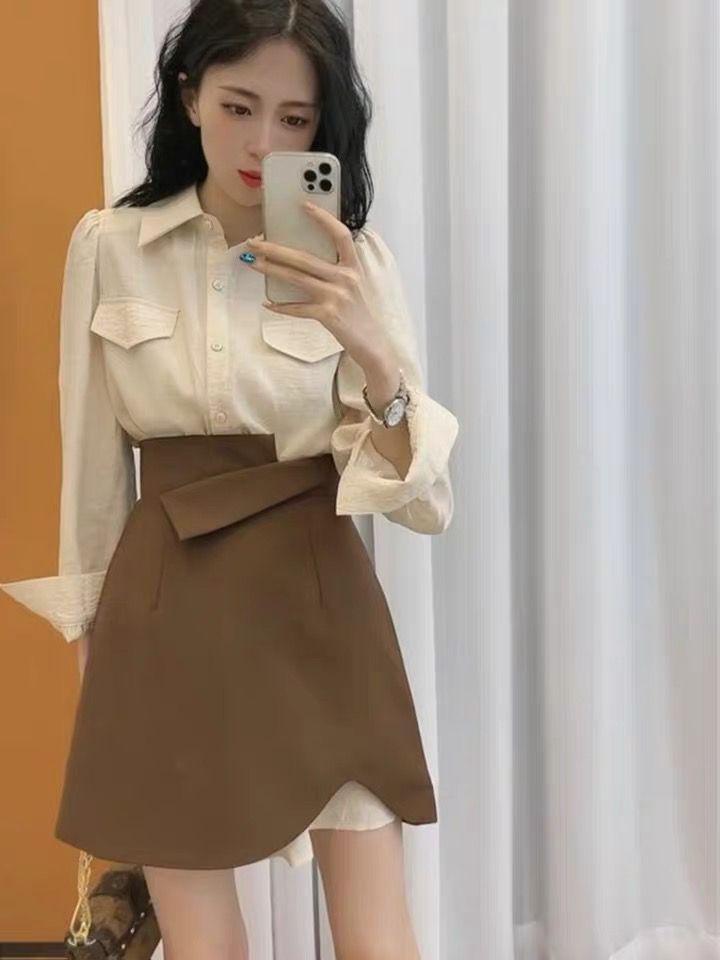 2025 Otoño Nuevo Color Sólido Vestido Camisero Midi + Falda Midi Irregular Adelgazante de Cintura Alta Conjunto de Dos Piezas