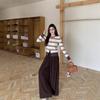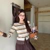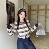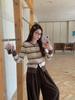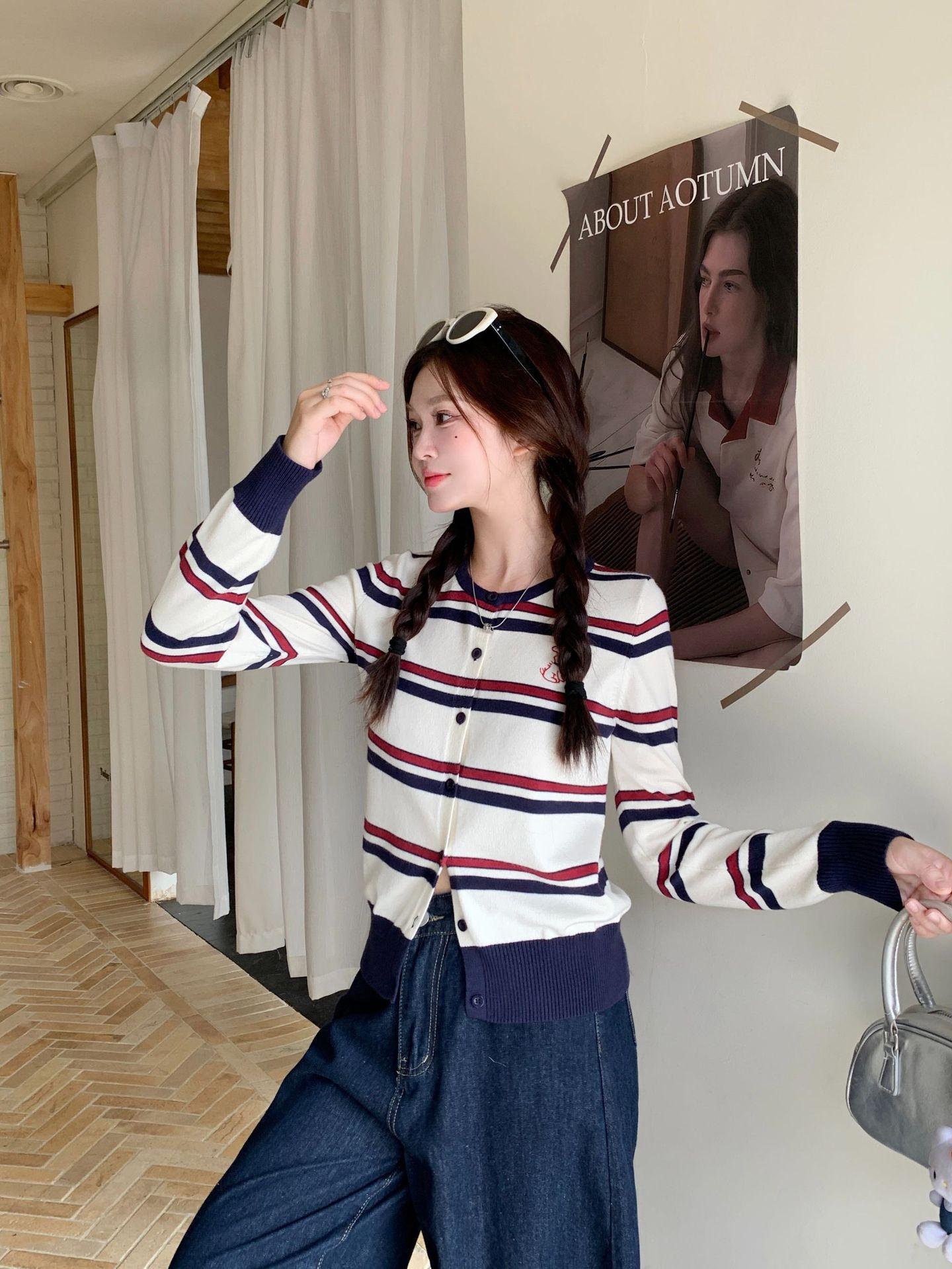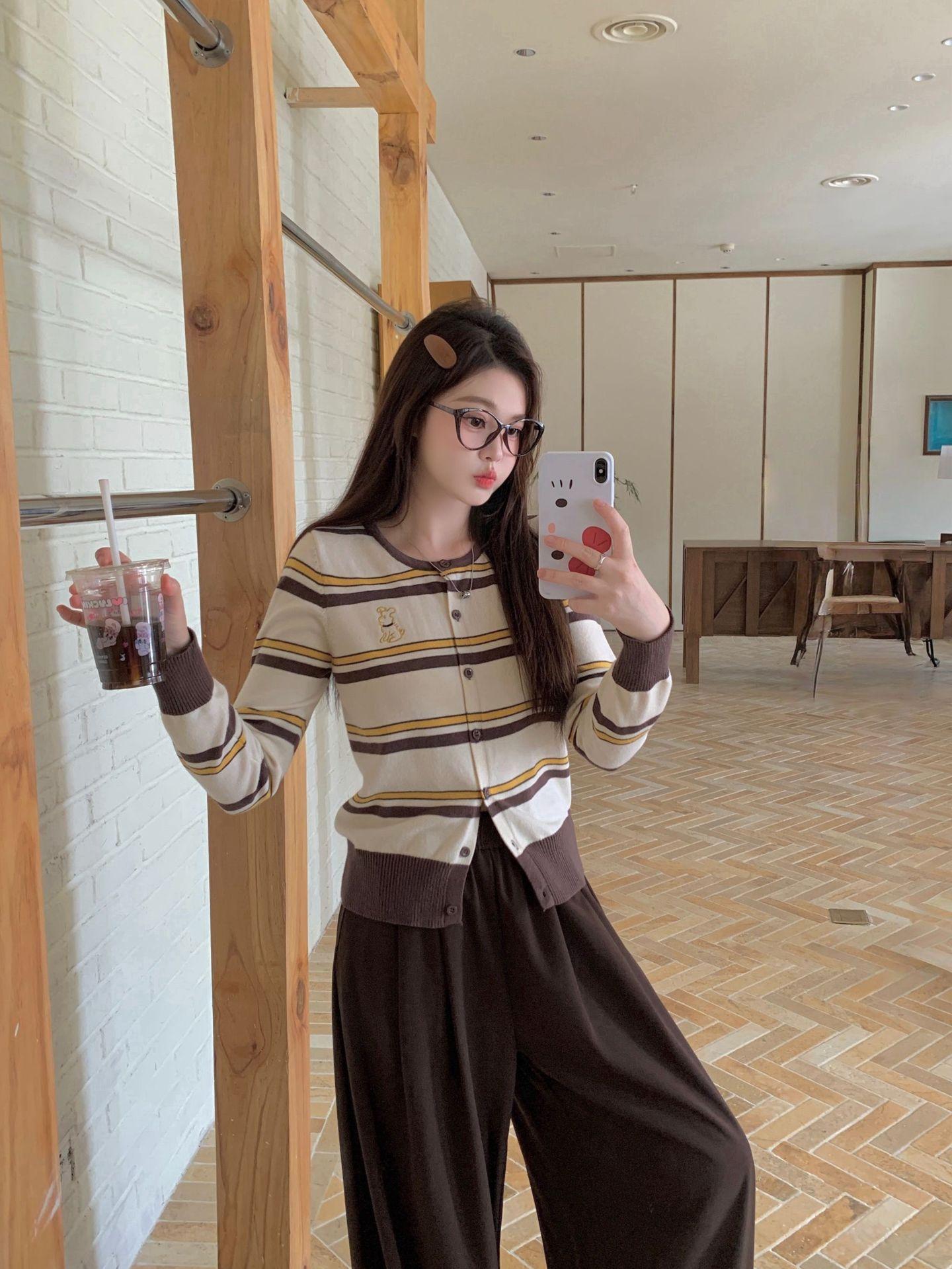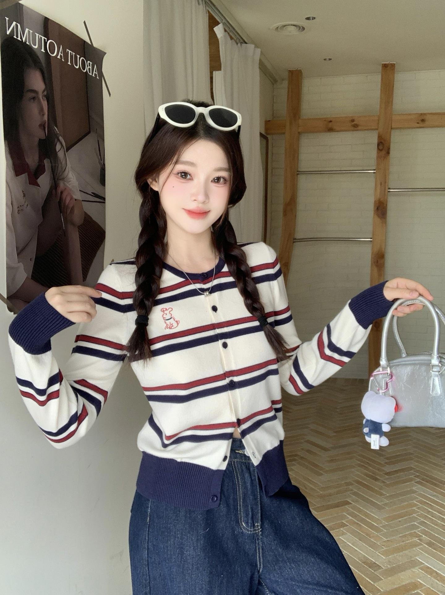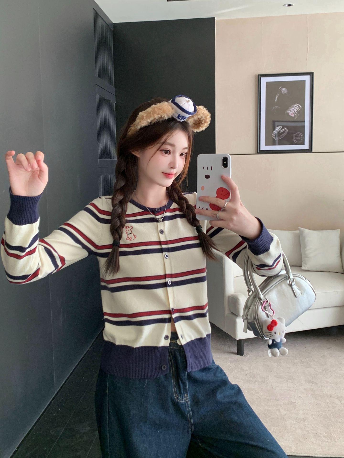 Cárdigan de punto fino para mujer de alta gama con bordado de cachorro a rayas en bloques de color, otoño temprano 2025, top cárdigan casual holgado