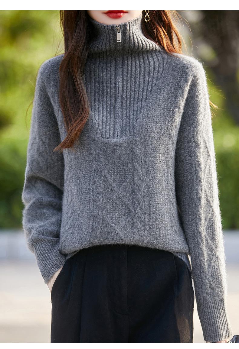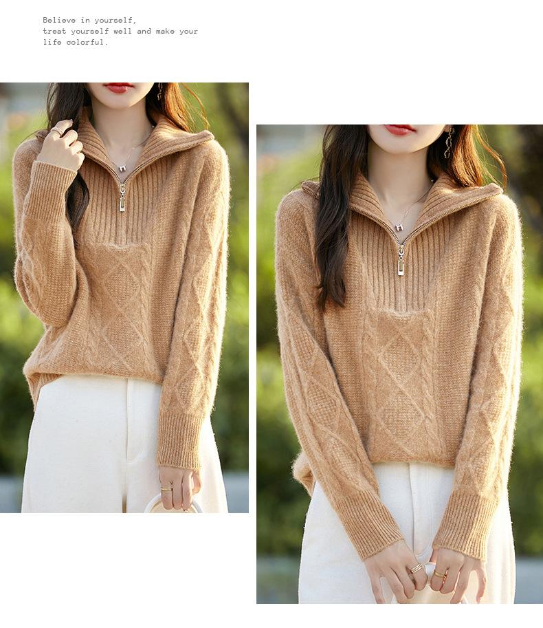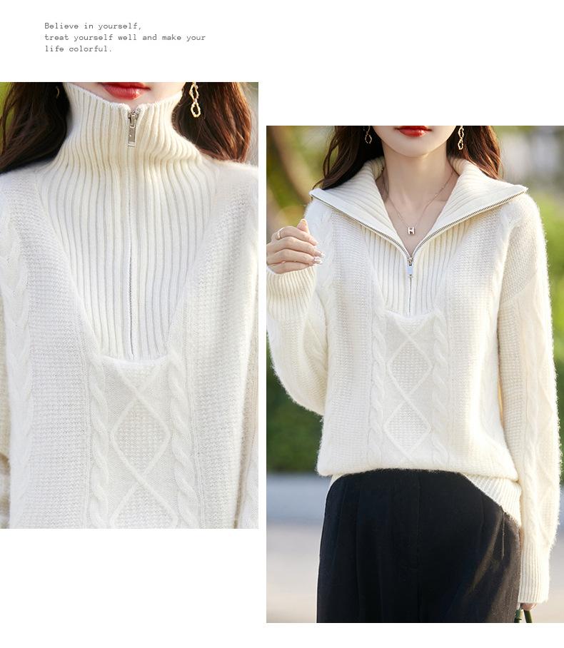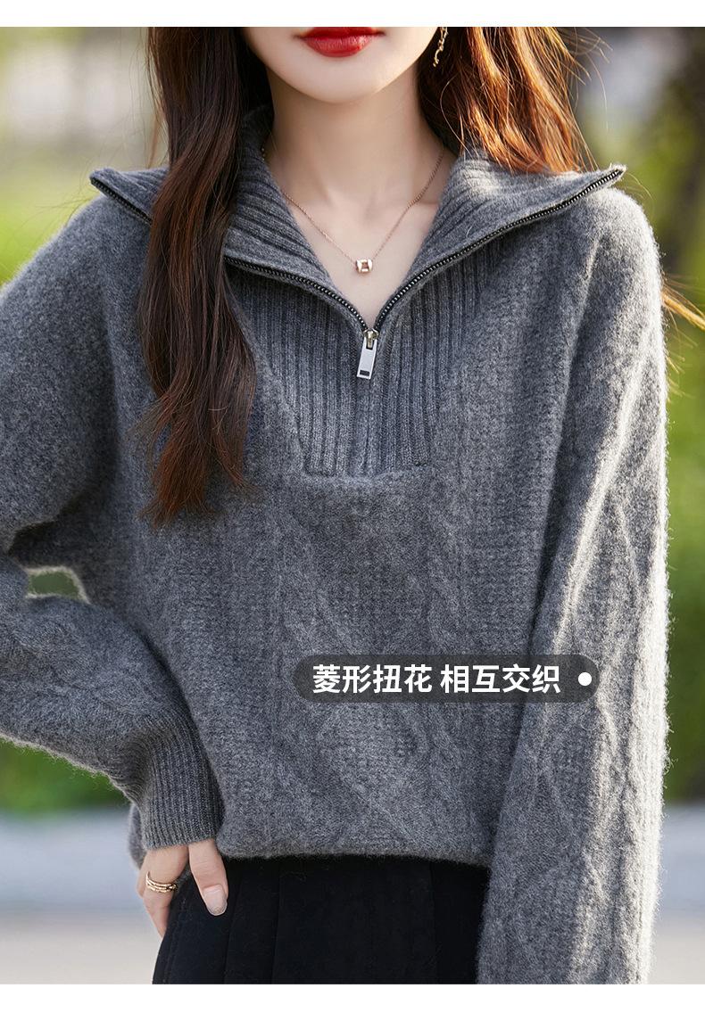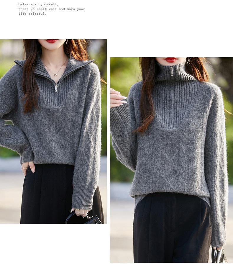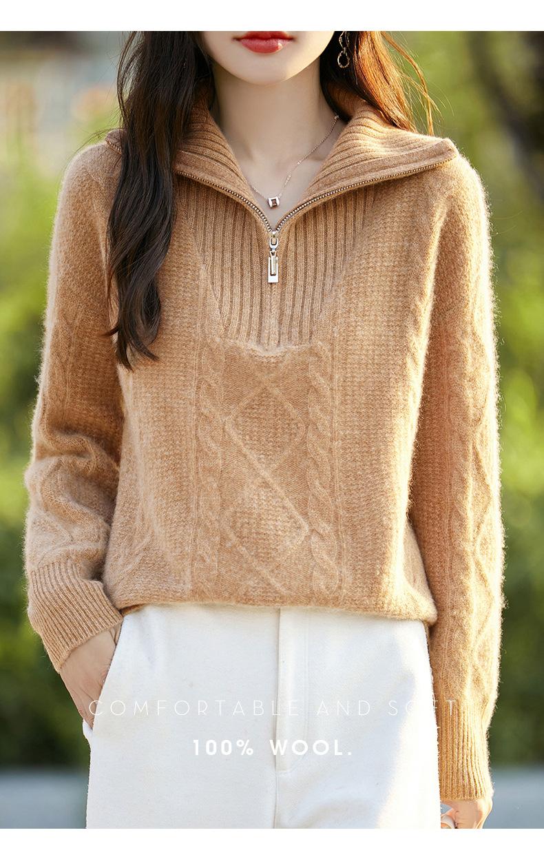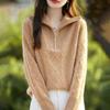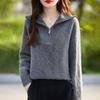 2025 nuevo suéter de punto de lana pura minimalista casual de temperamento de color sólido para mujer con solapa y media cremallera, holgado y perezoso