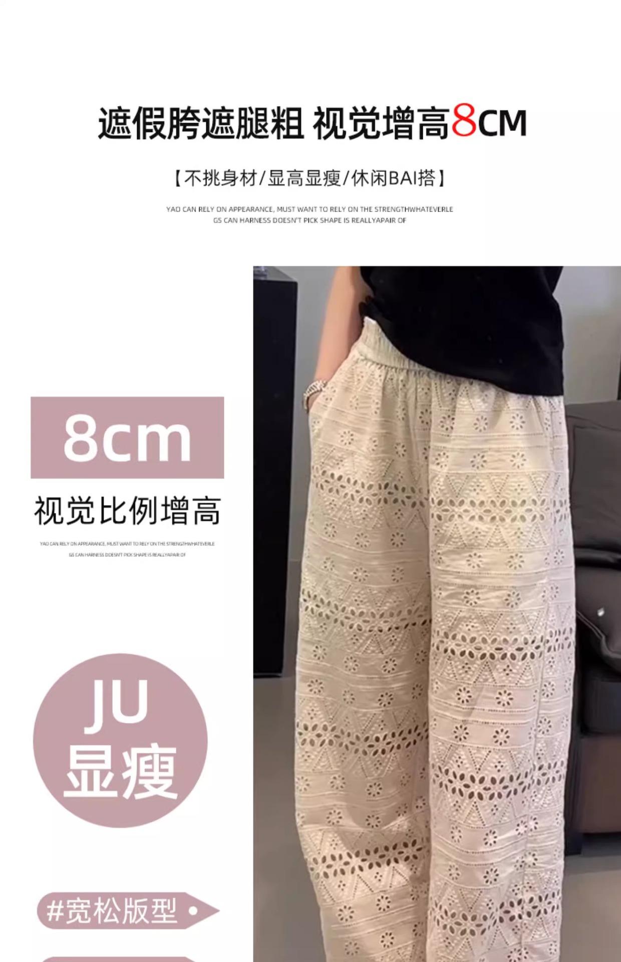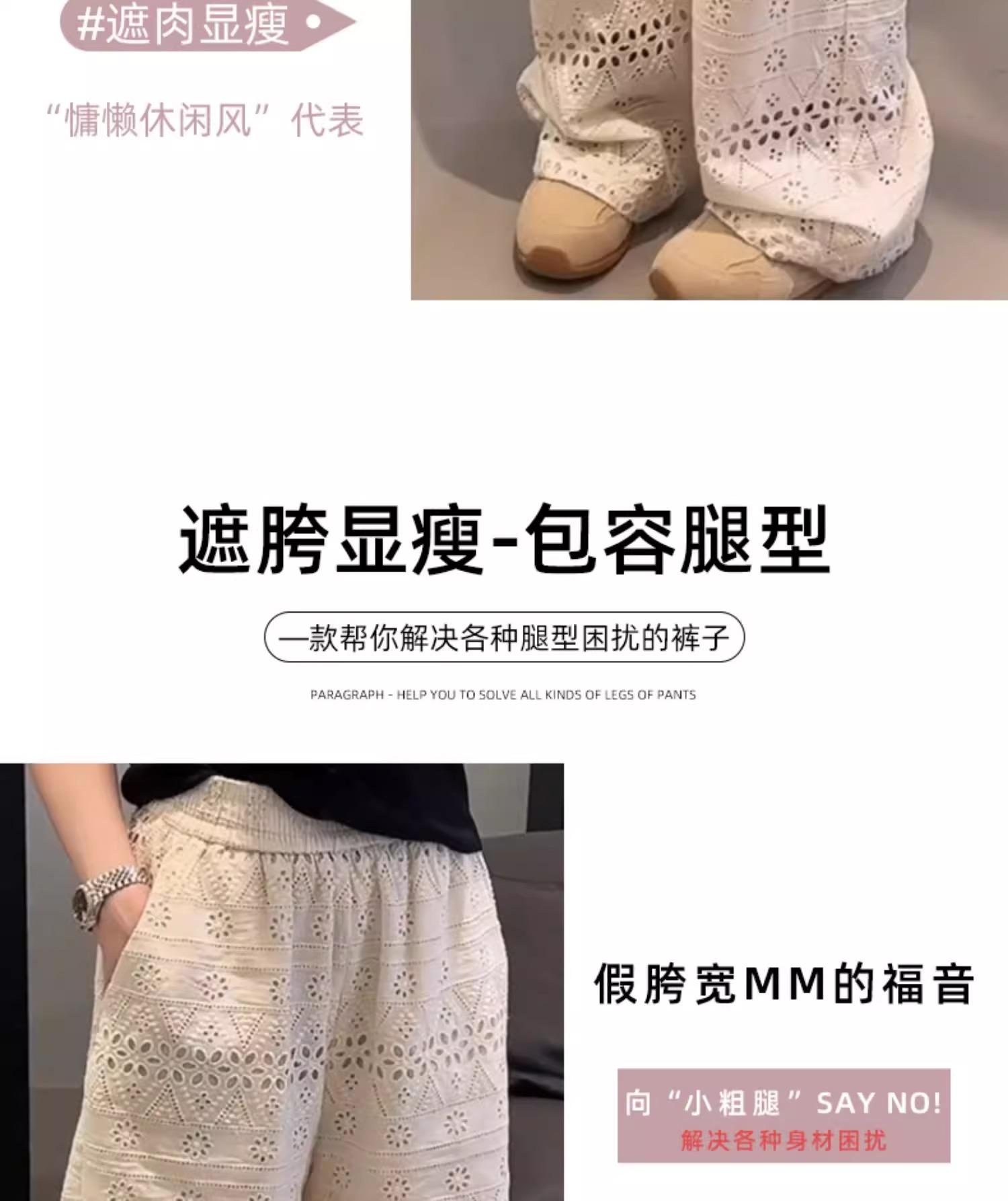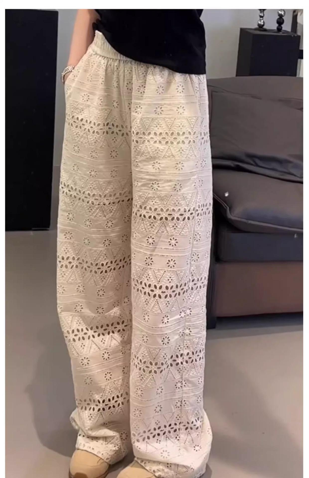 Pantalones de Encaje Calados de Pierna Ancha para Mujer Verano 2025 Nuevo Cintura Alta Rectos Casuales Pequeños Hielo Seda Frescos