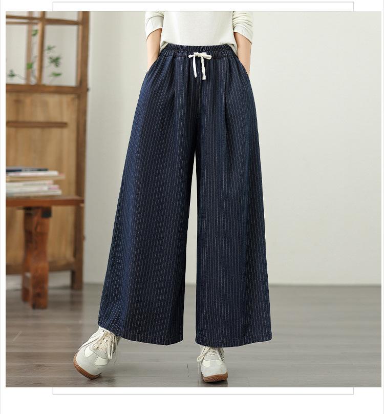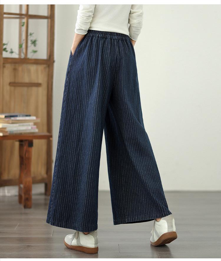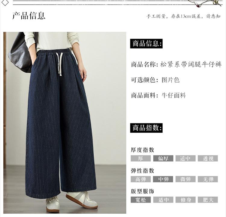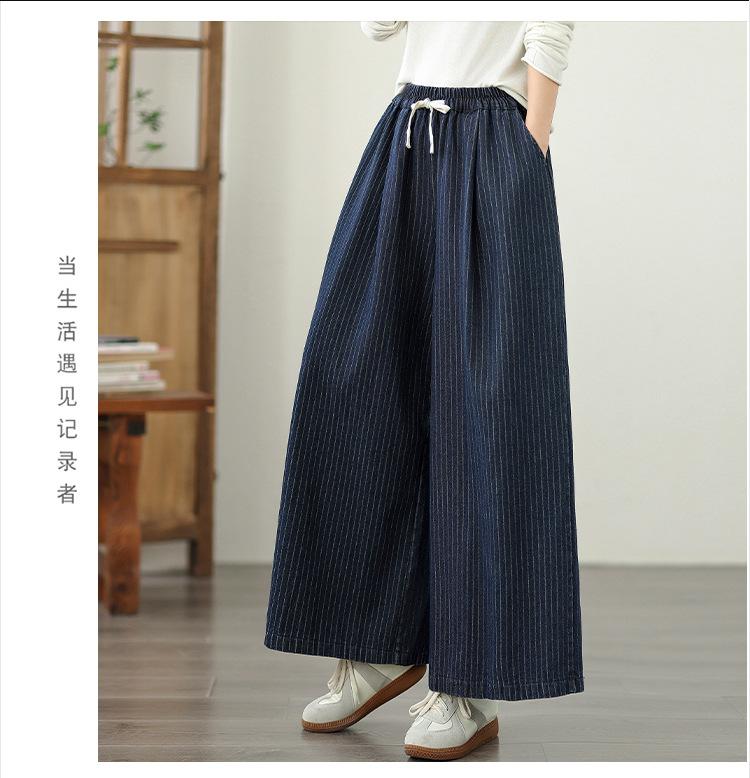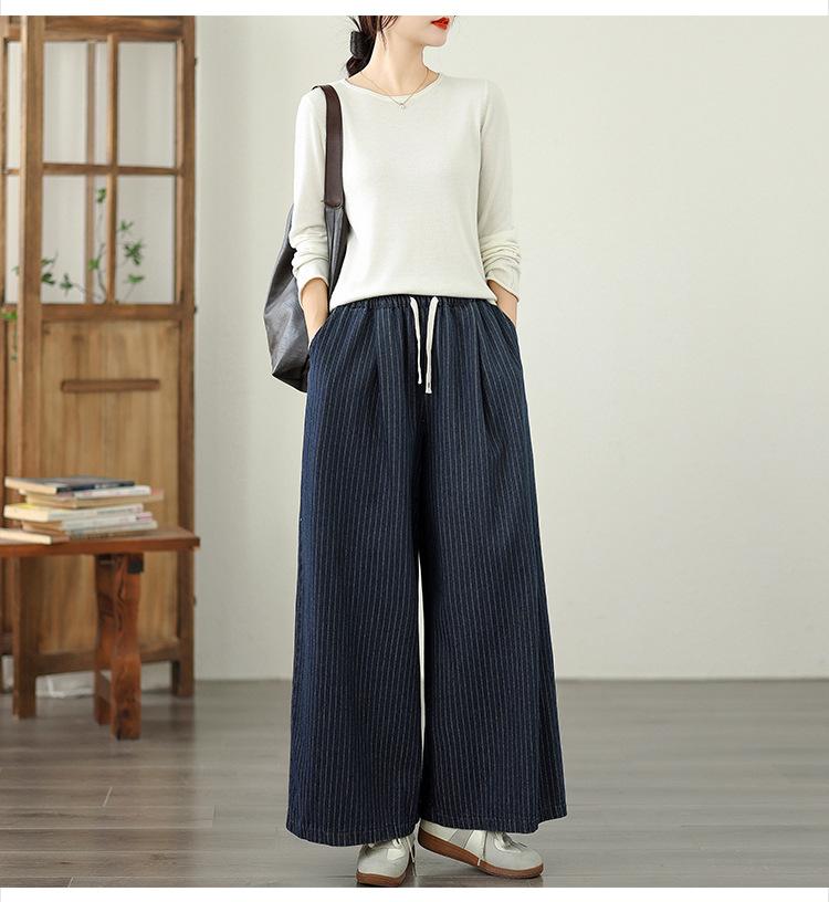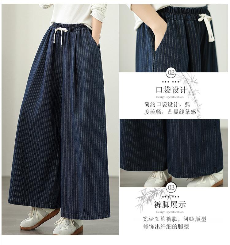 En stock Otoño nuevo jacquard a rayas denim pantalones de pierna ancha literario casual talla grande denim pantalones largos