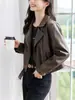 Abrigo corto de chaqueta de cuero PU con cuello vuelto para mujer 2025 otoño nuevo estilo coreano moda temperamento versátil chaqueta de motociclista top