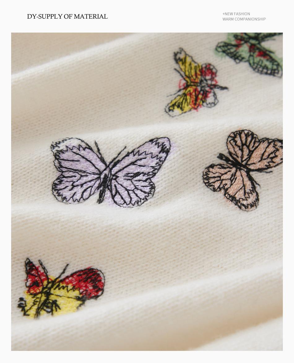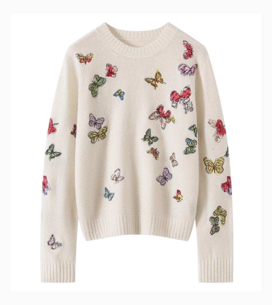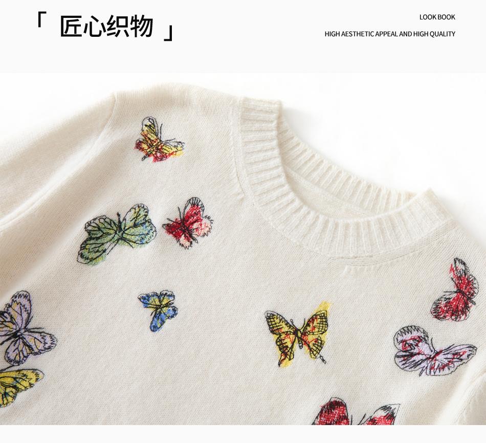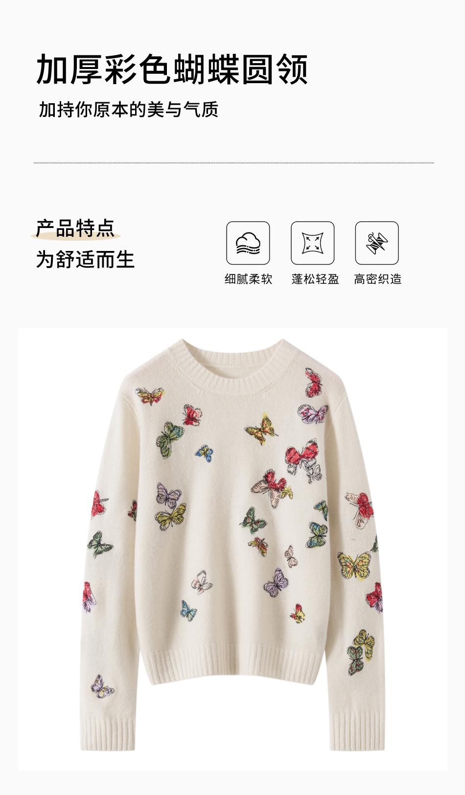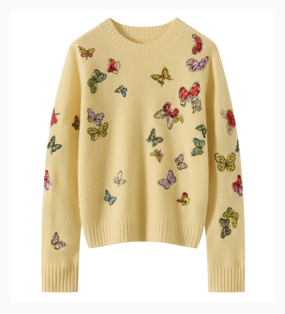 2025 Otoño/Invierno Nuevo Mezcla de Lana Cachemira Cuello Redondo Tejido Manga Larga Diseño de Mariposa Bordado Sentido Capa Base