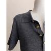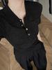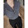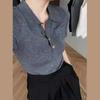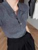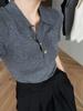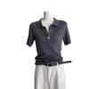Suéter gris de manga corta con cuello polo francés para mujer, camiseta de verano de alta gama, elegante, de seda helada con hombros descubiertos.
