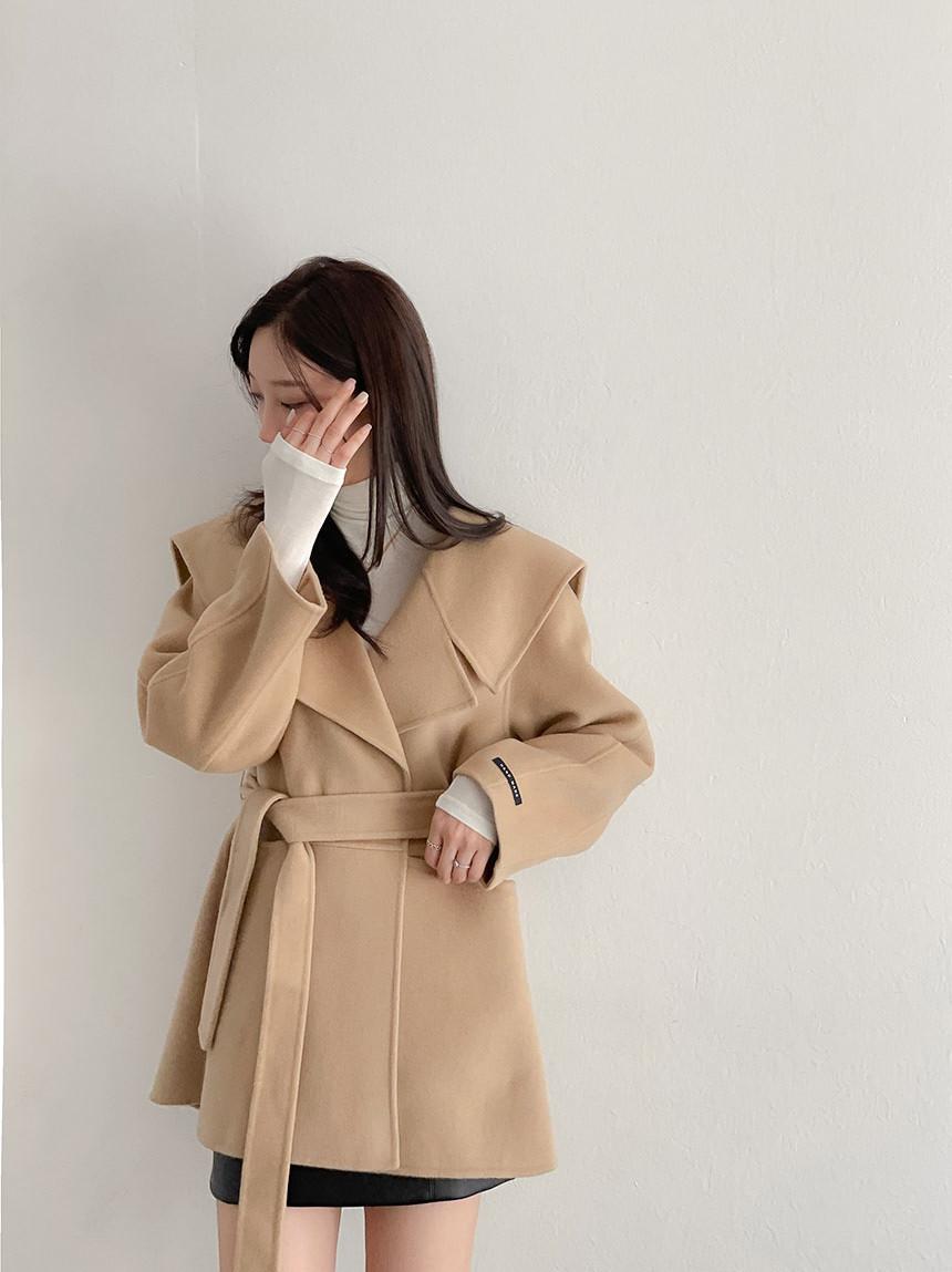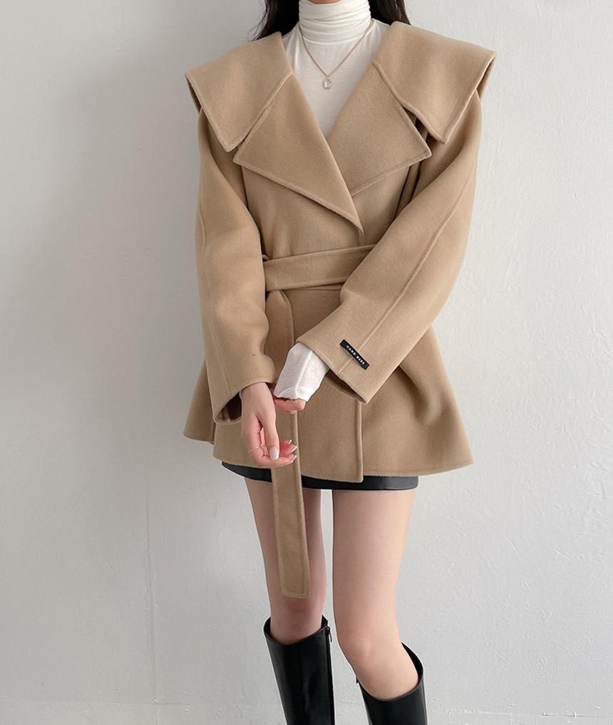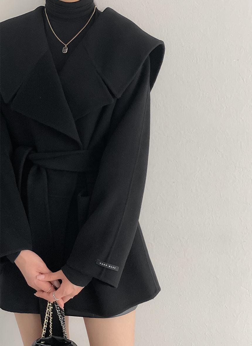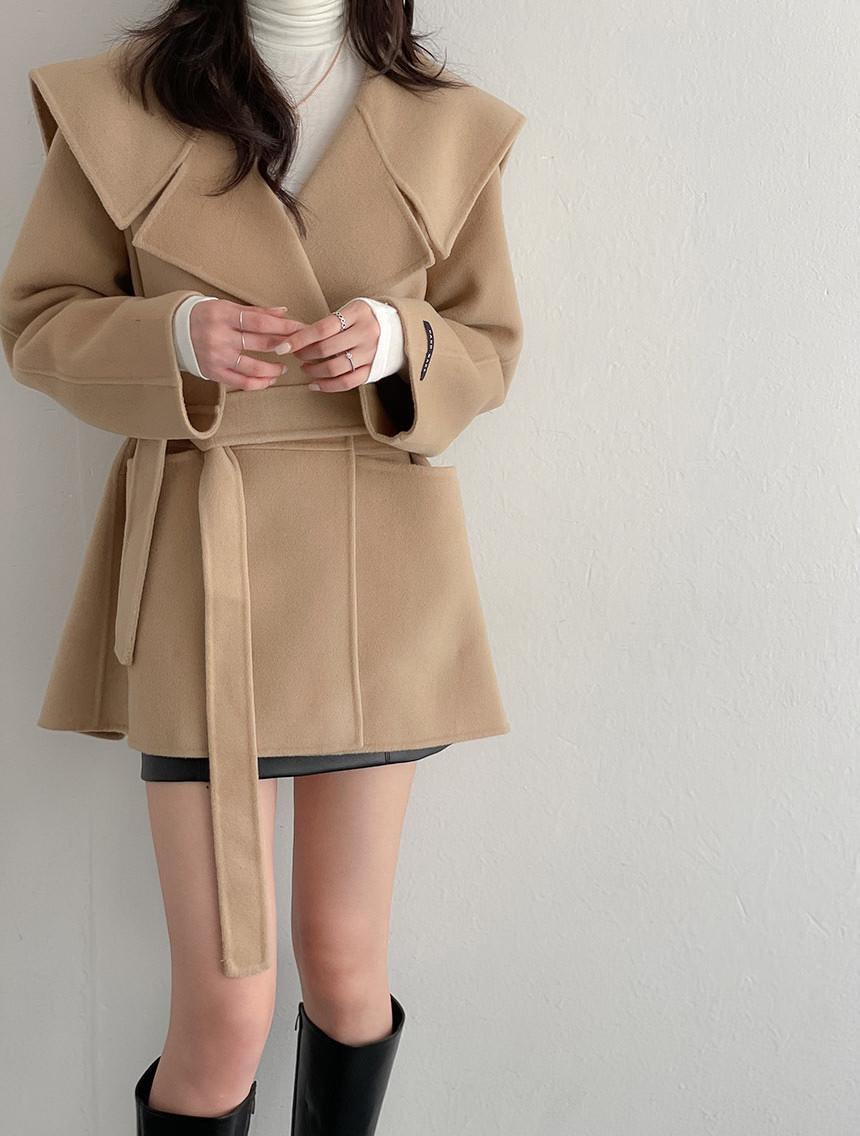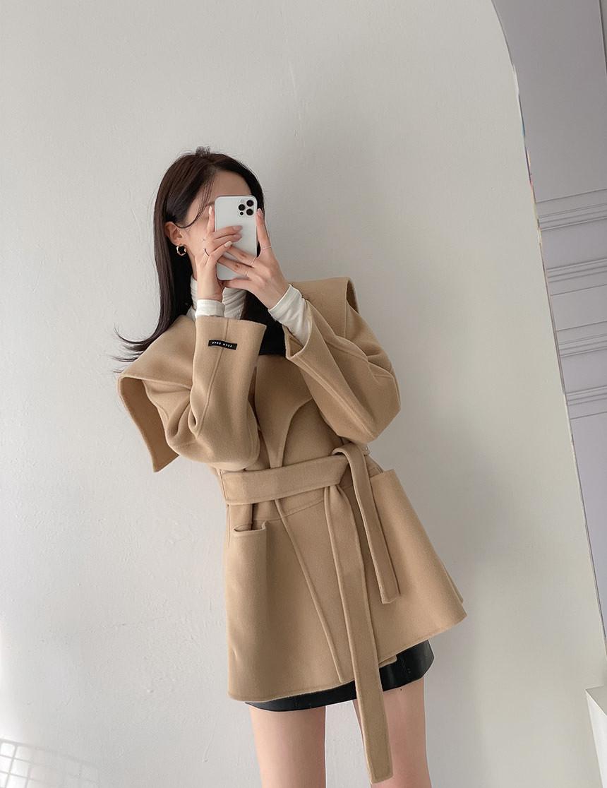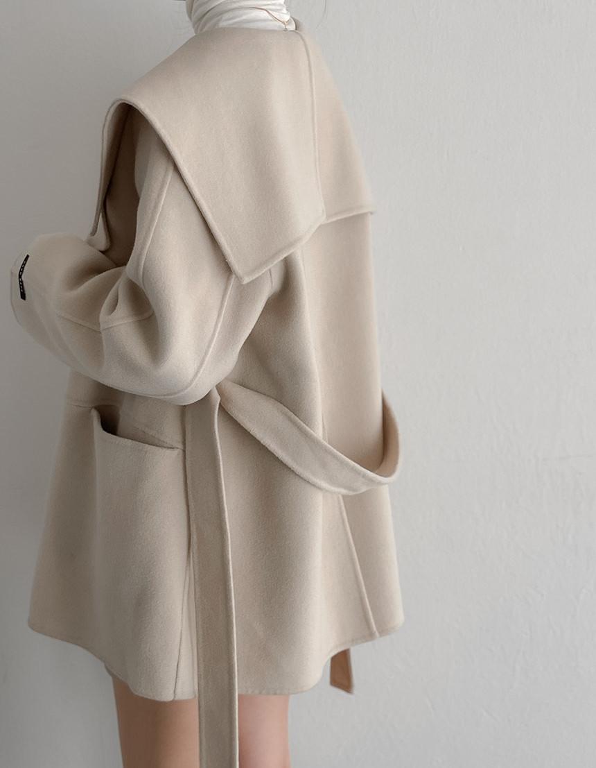 En stock estilo coreano temperamento retro moda chic solapa grande petite abrigo de lana con cinturón abrigo de lana mujer