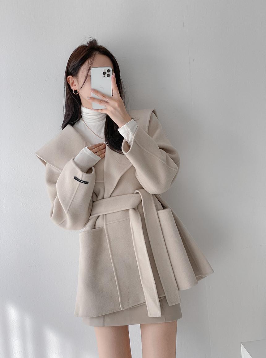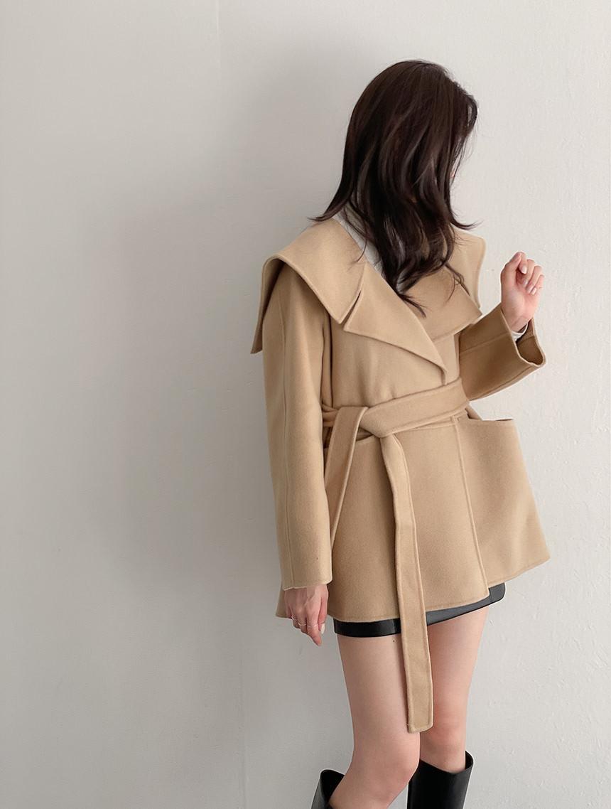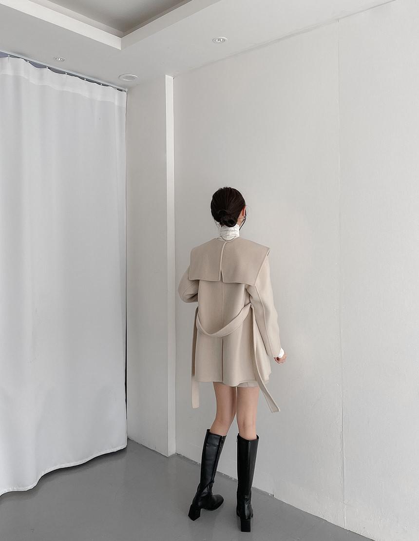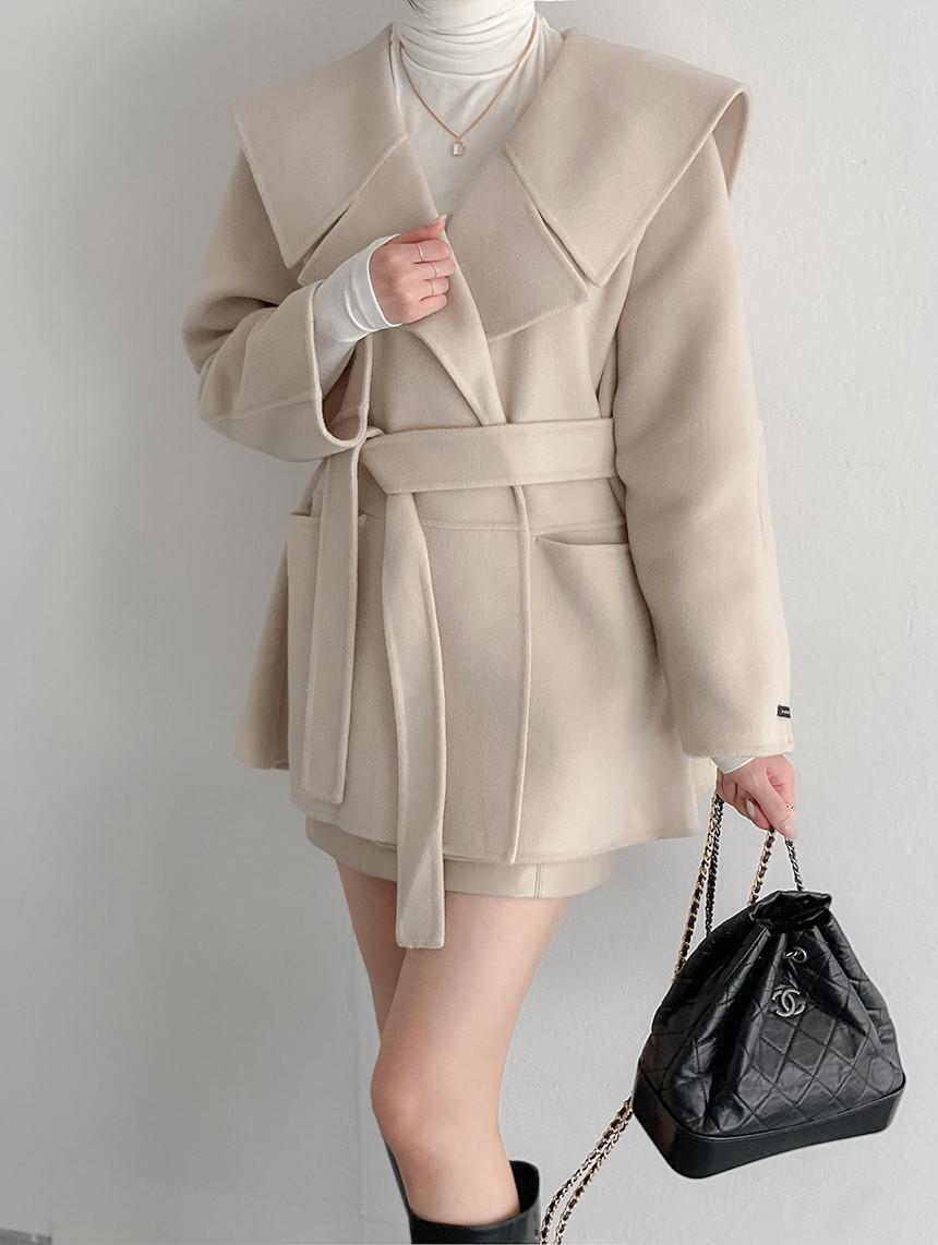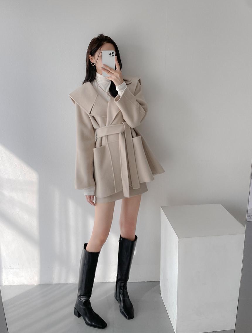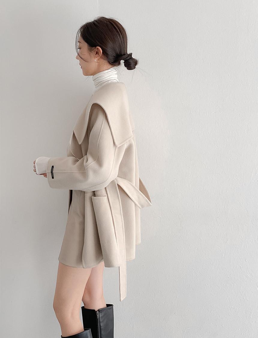En stock estilo coreano temperamento retro moda chic solapa grande petite abrigo de lana con cinturón abrigo de lana mujer