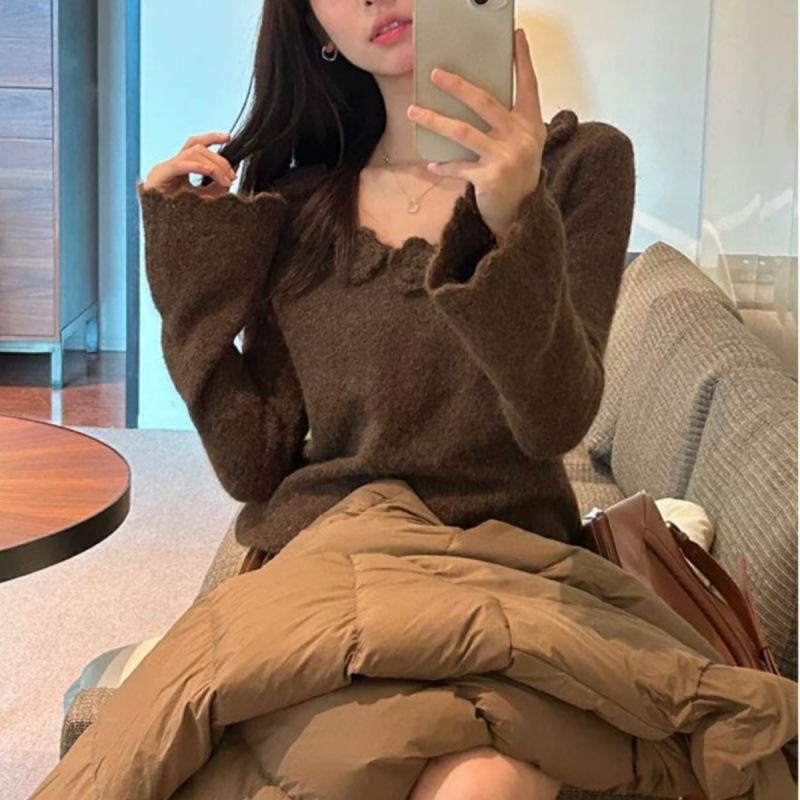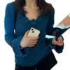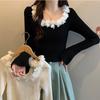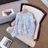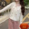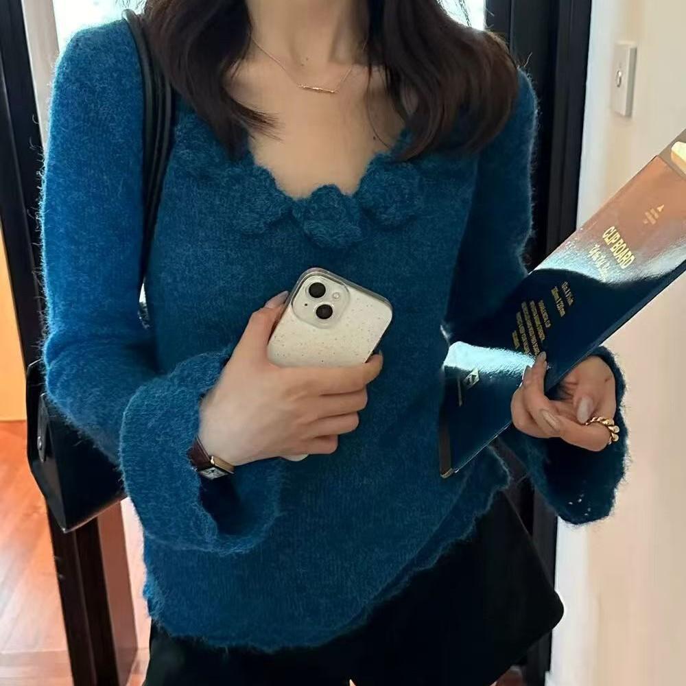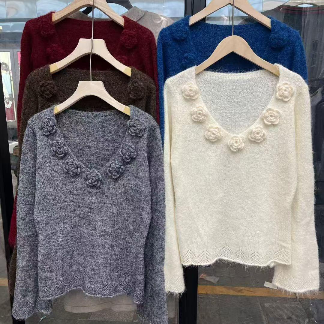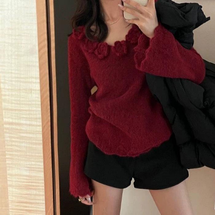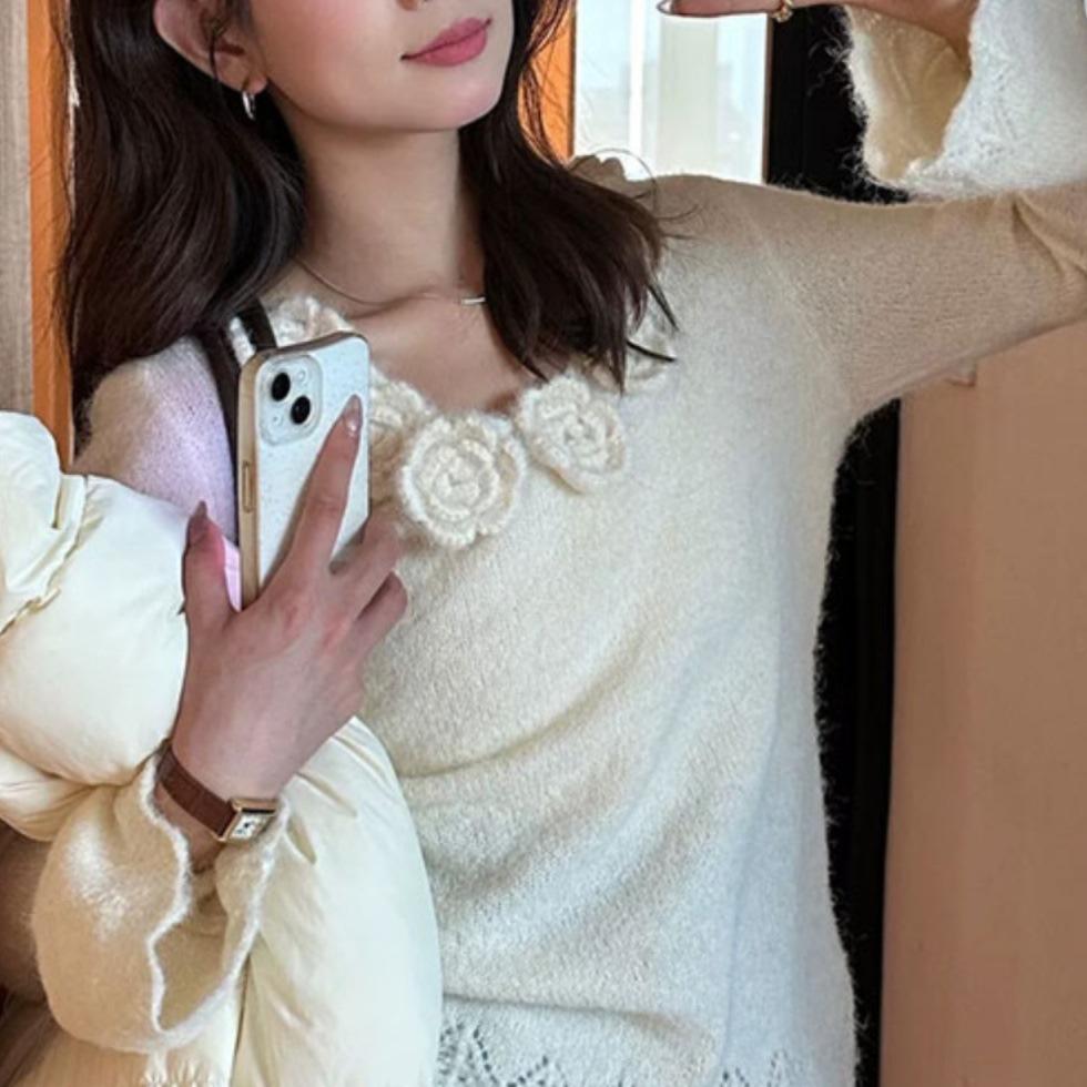 Suéter de punto de cuello redondo para mujer con rosa tridimensional francesa, estilo dulce versátil de base para otoño e invierno, adelgazante