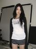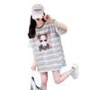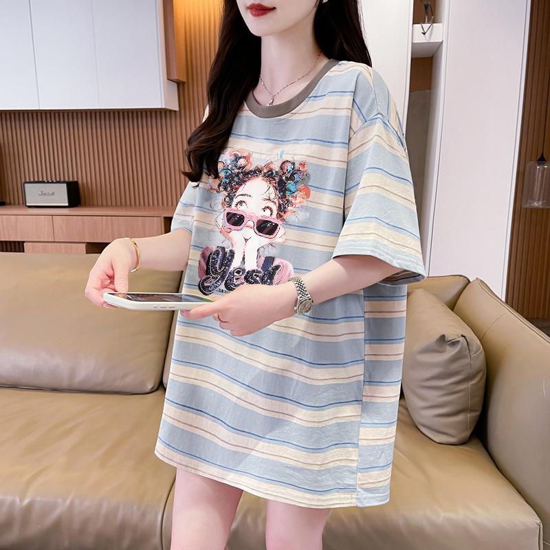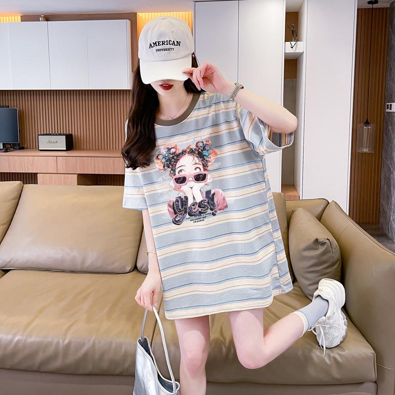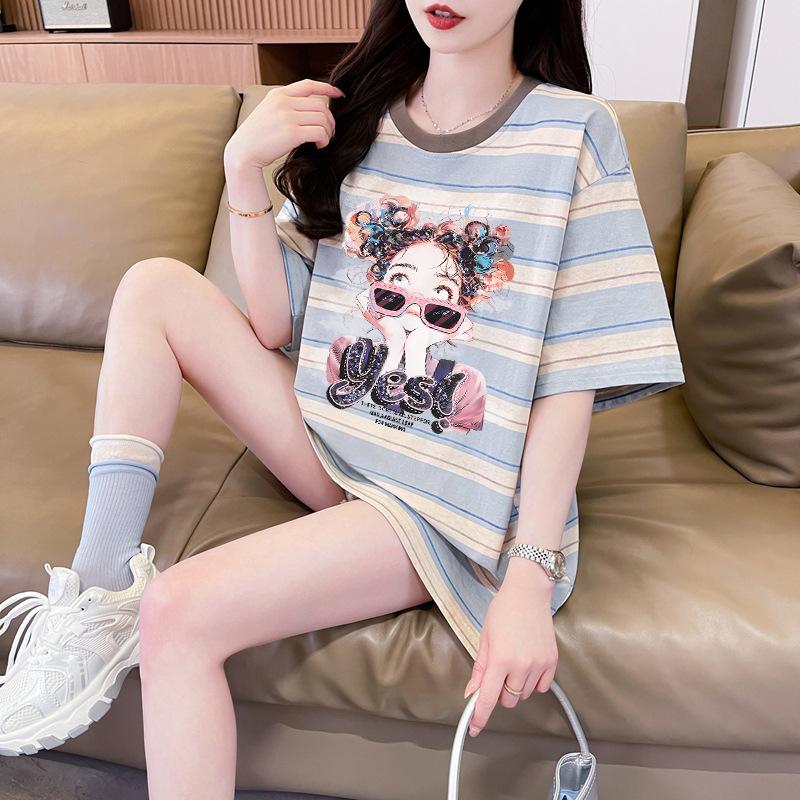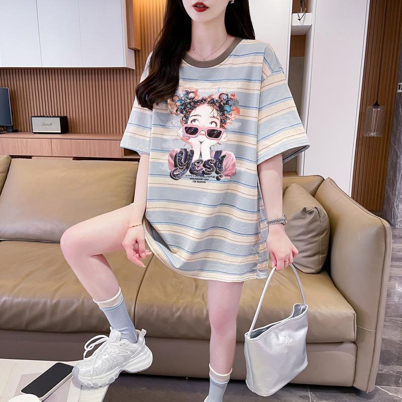 Playera de Manga Corta de Rayas Color Block de Gama Alta para Mujer, Estilo Relajado, Estilo Caricatura de Largo Medio, Top Versátil para la Calle