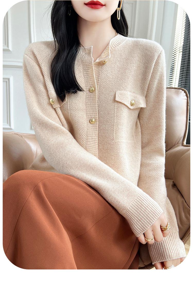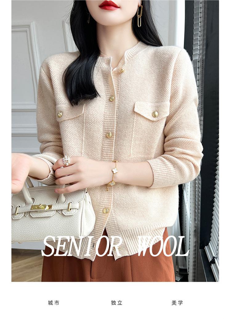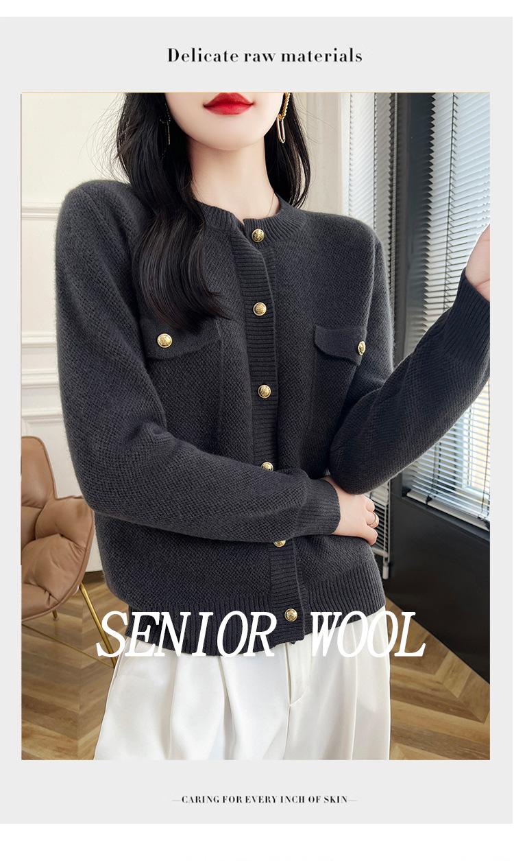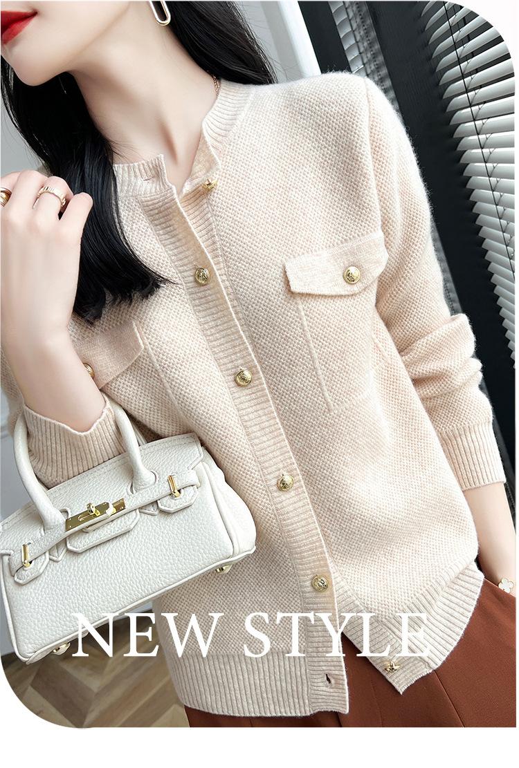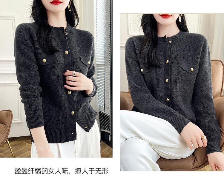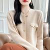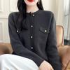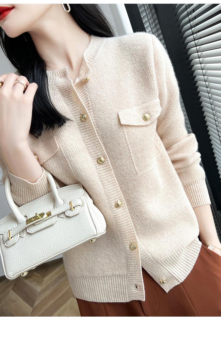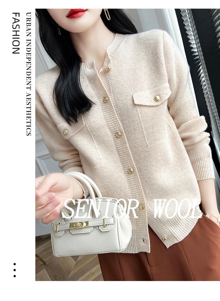 Otoño e Invierno 2024 Nuevo Cárdigan de Punto de Cuello Redondo Estilo Chanel de Lana Pura Color Sólido Bolsillo Suelto Top Combinable