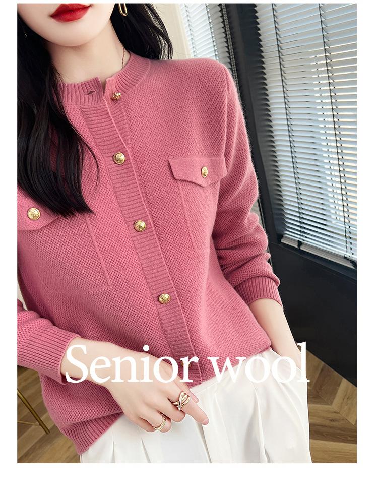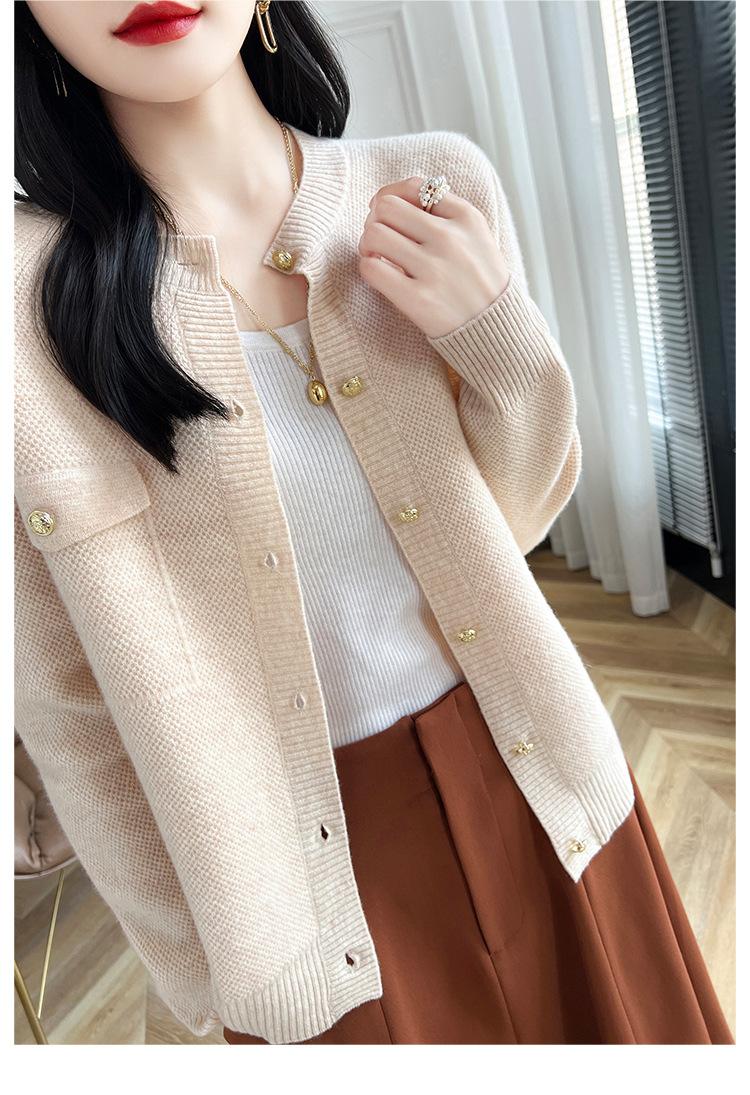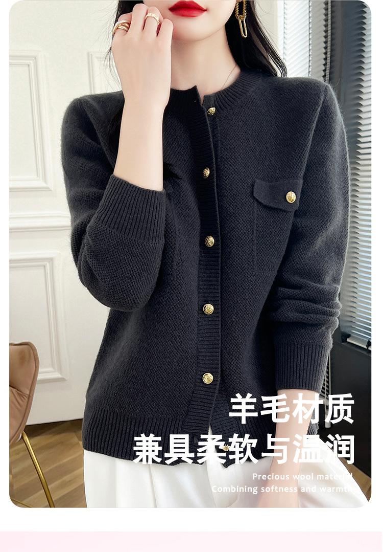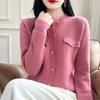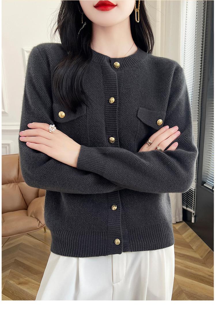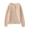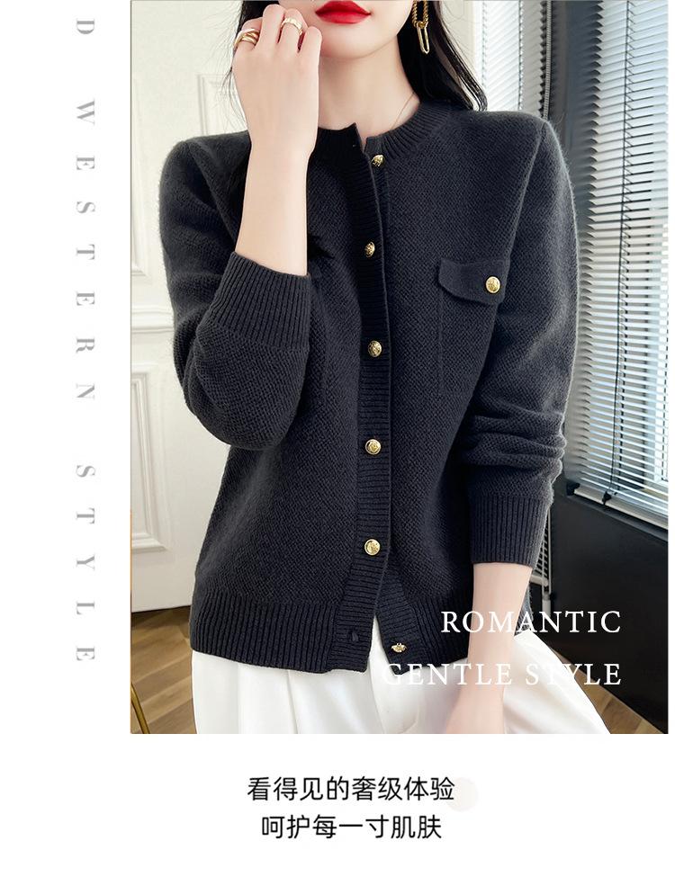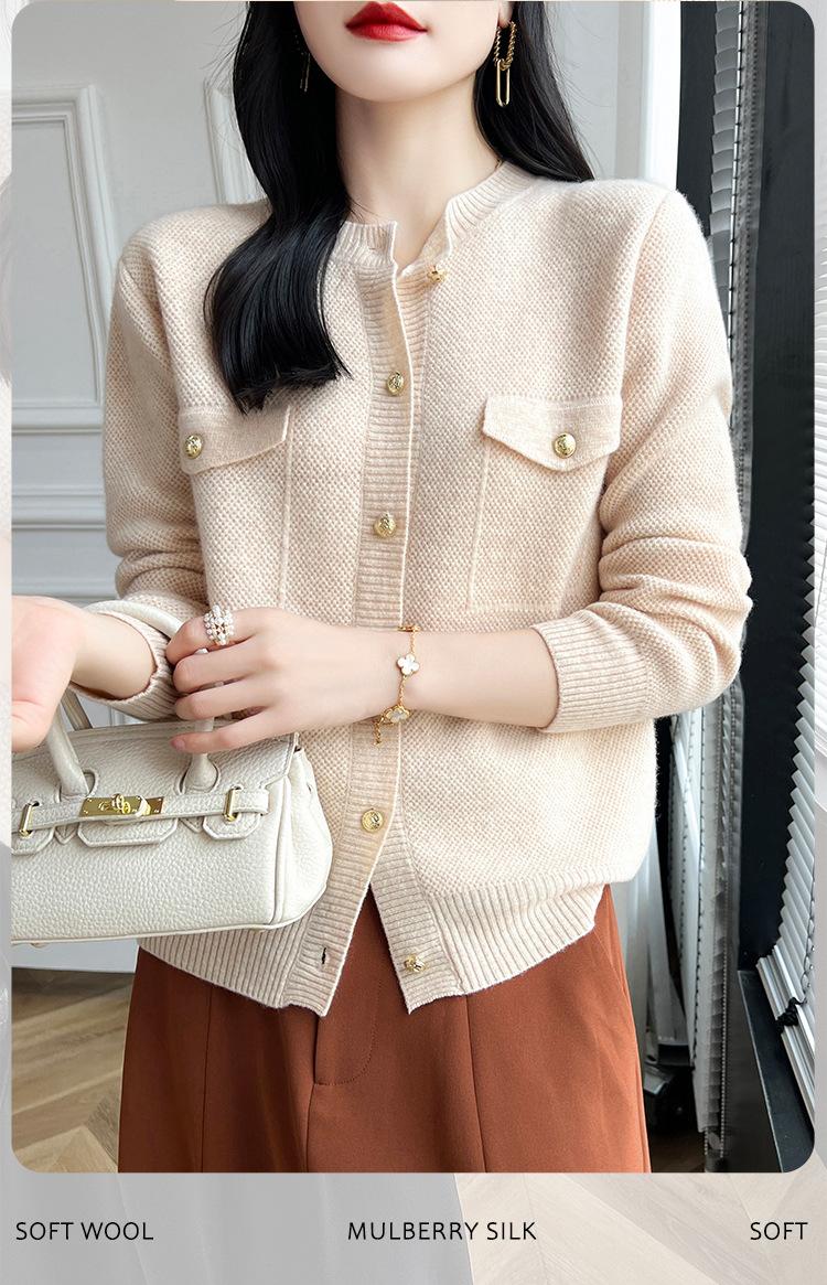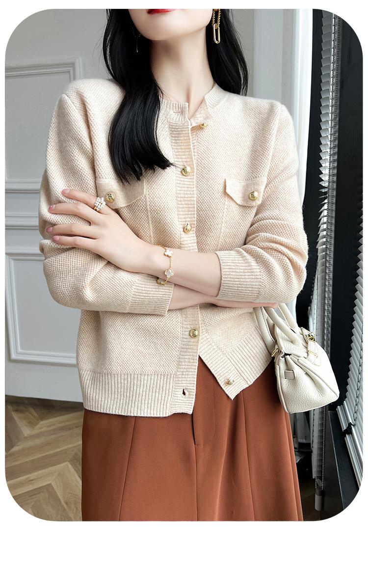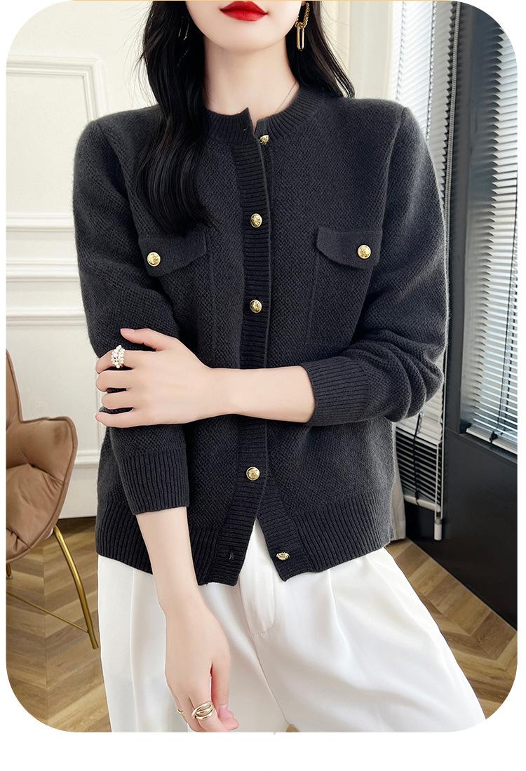 Otoño e Invierno 2024 Nuevo Cárdigan de Punto de Cuello Redondo Estilo Chanel de Lana Pura Color Sólido Bolsillo Suelto Top Combinable