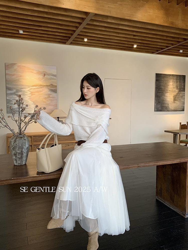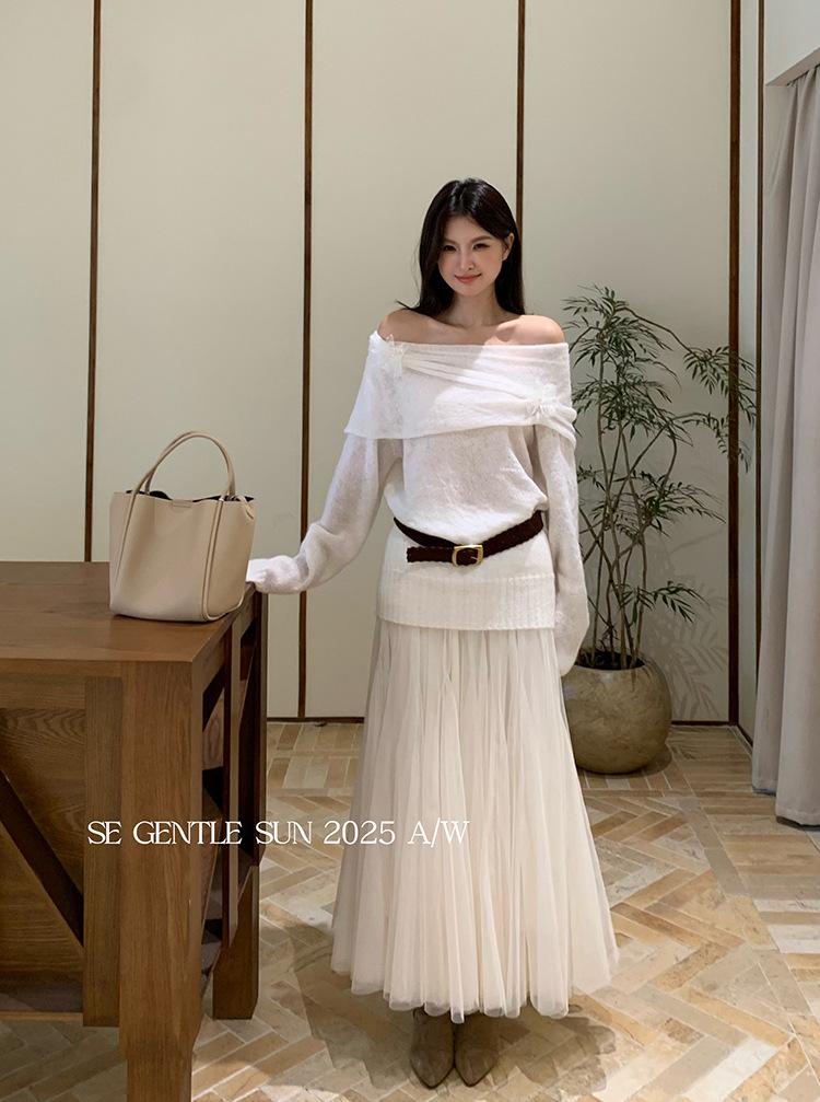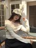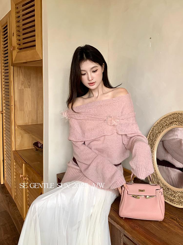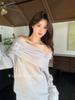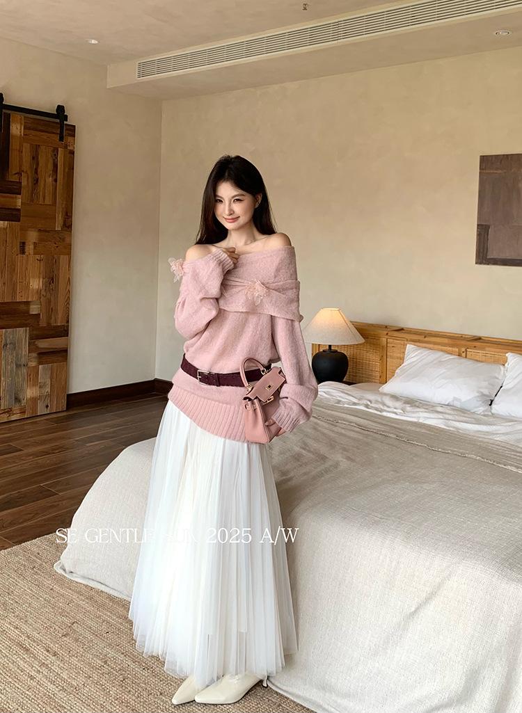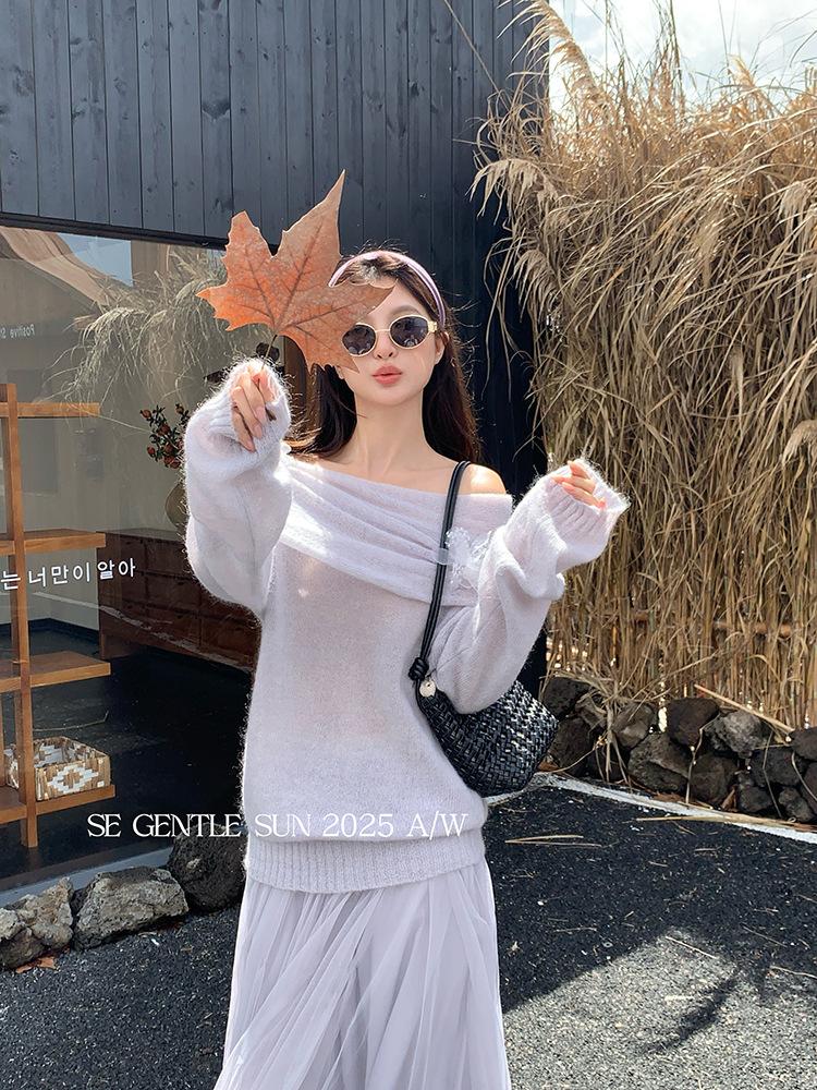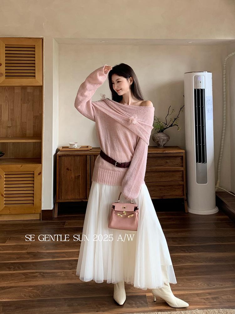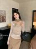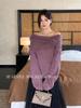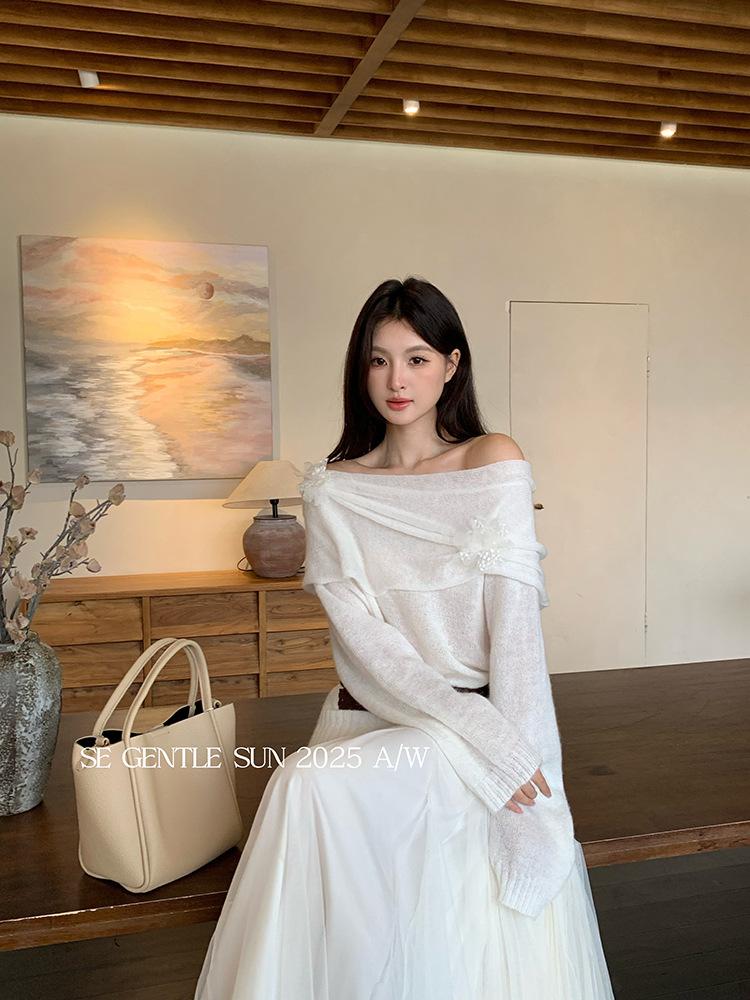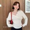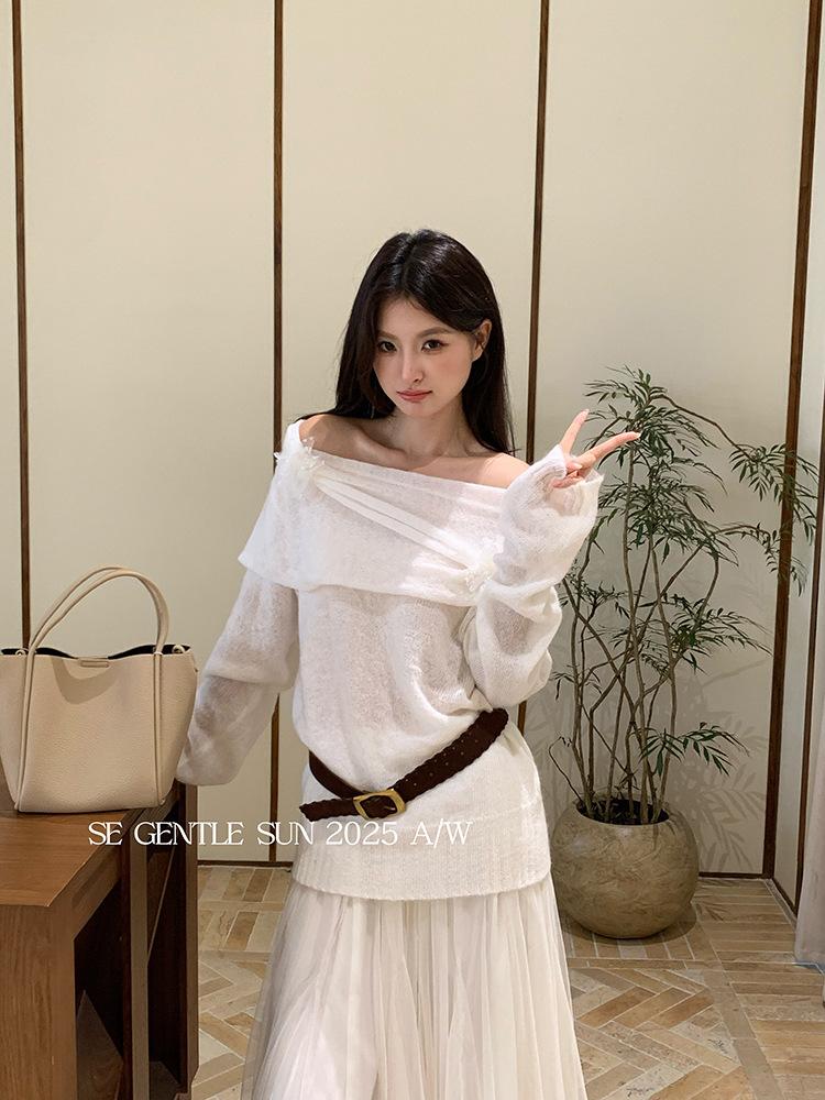 Xiuxixi 2025 Otoño Etiqueta Blanca Temperamento Un Hombro Lana Capa Base Manga Larga Suéter de Punto Top de Mujer 25419