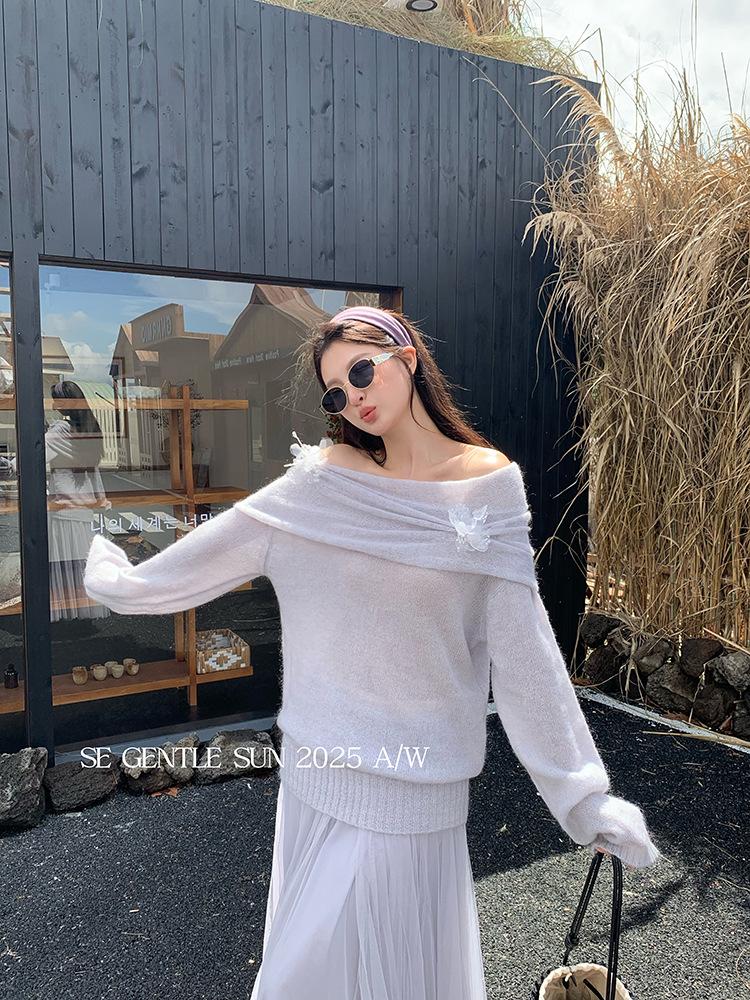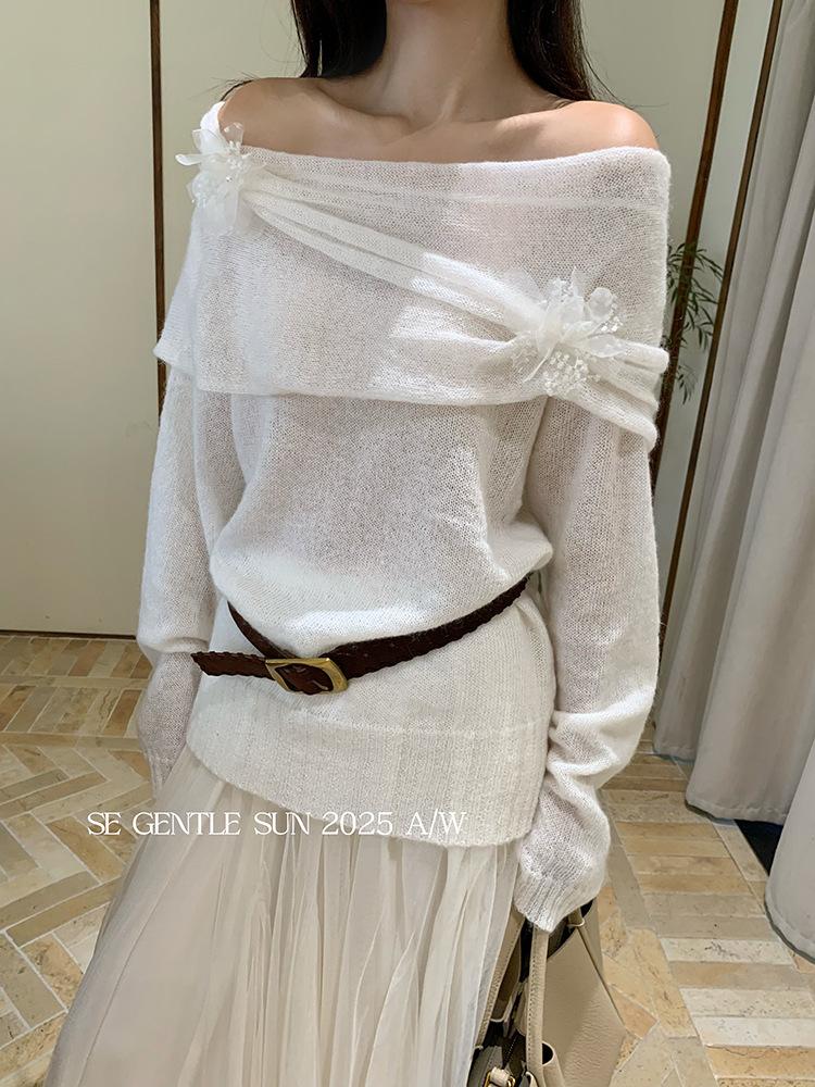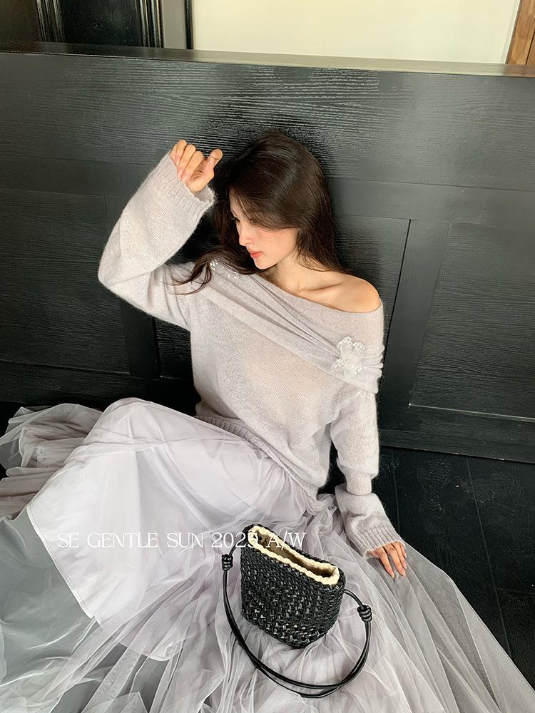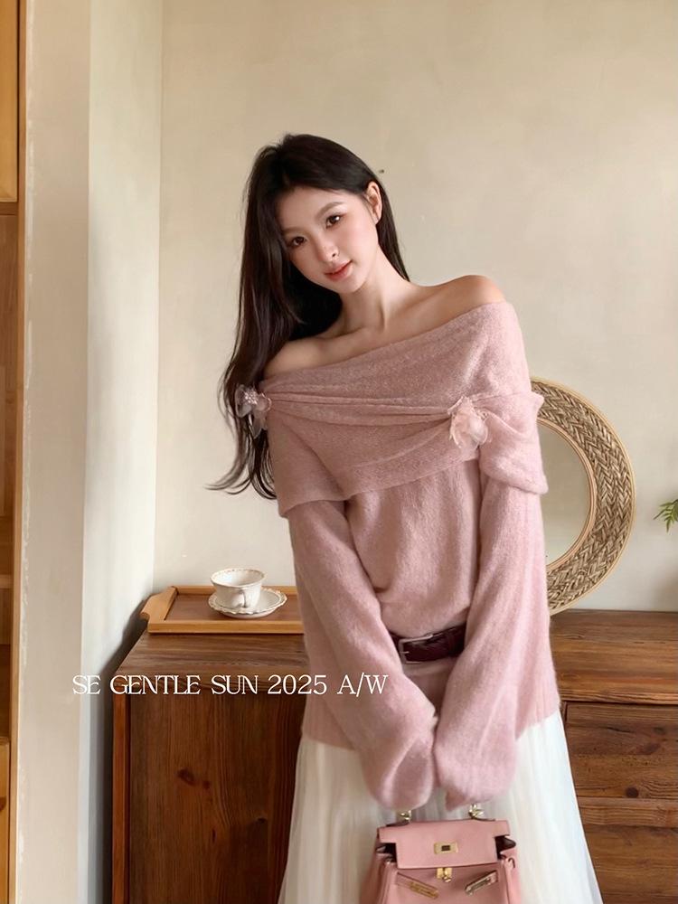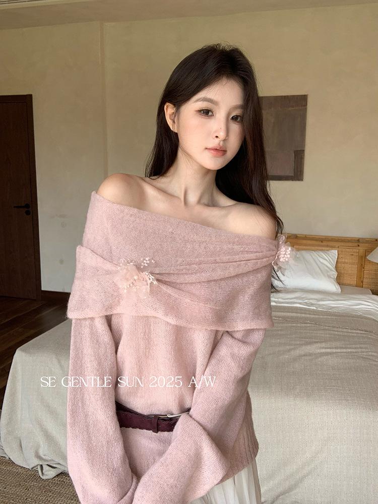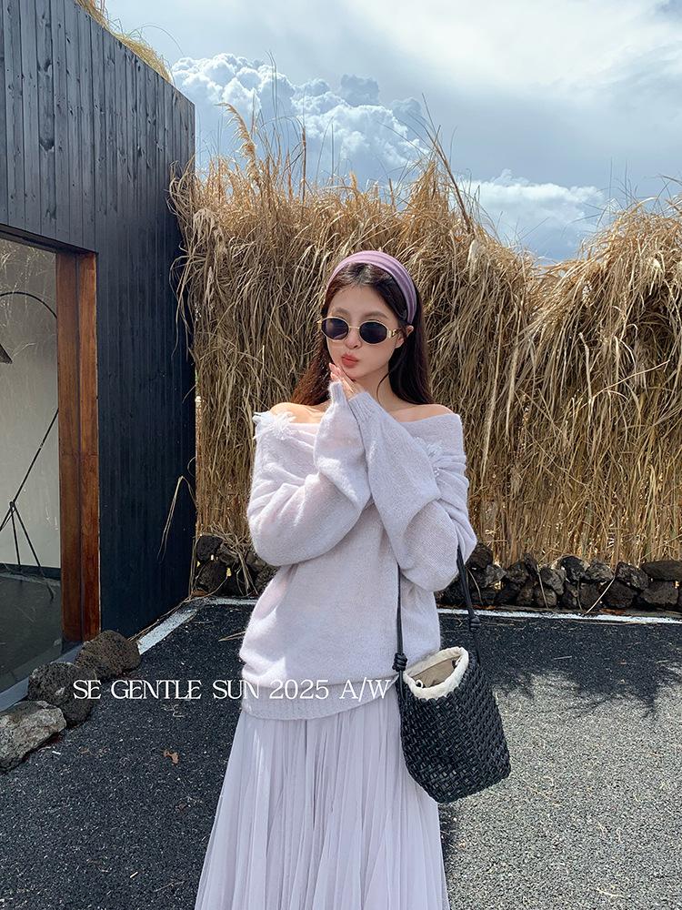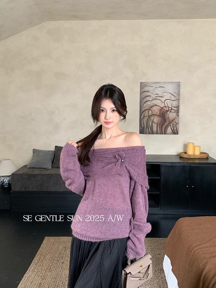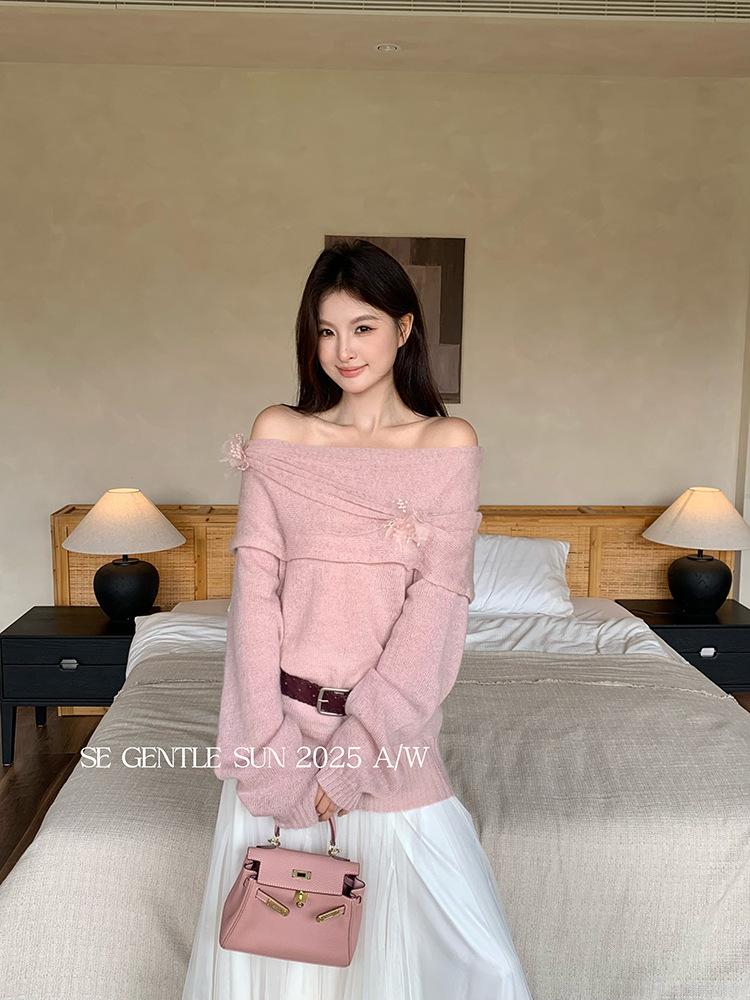 Xiuxixi 2025 Otoño Etiqueta Blanca Temperamento Un Hombro Lana Capa Base Manga Larga Suéter de Punto Top de Mujer 25419