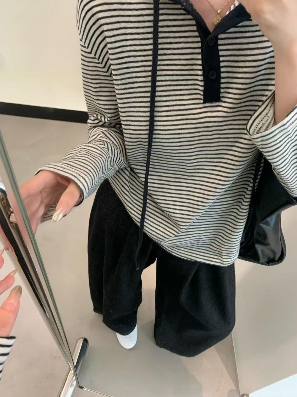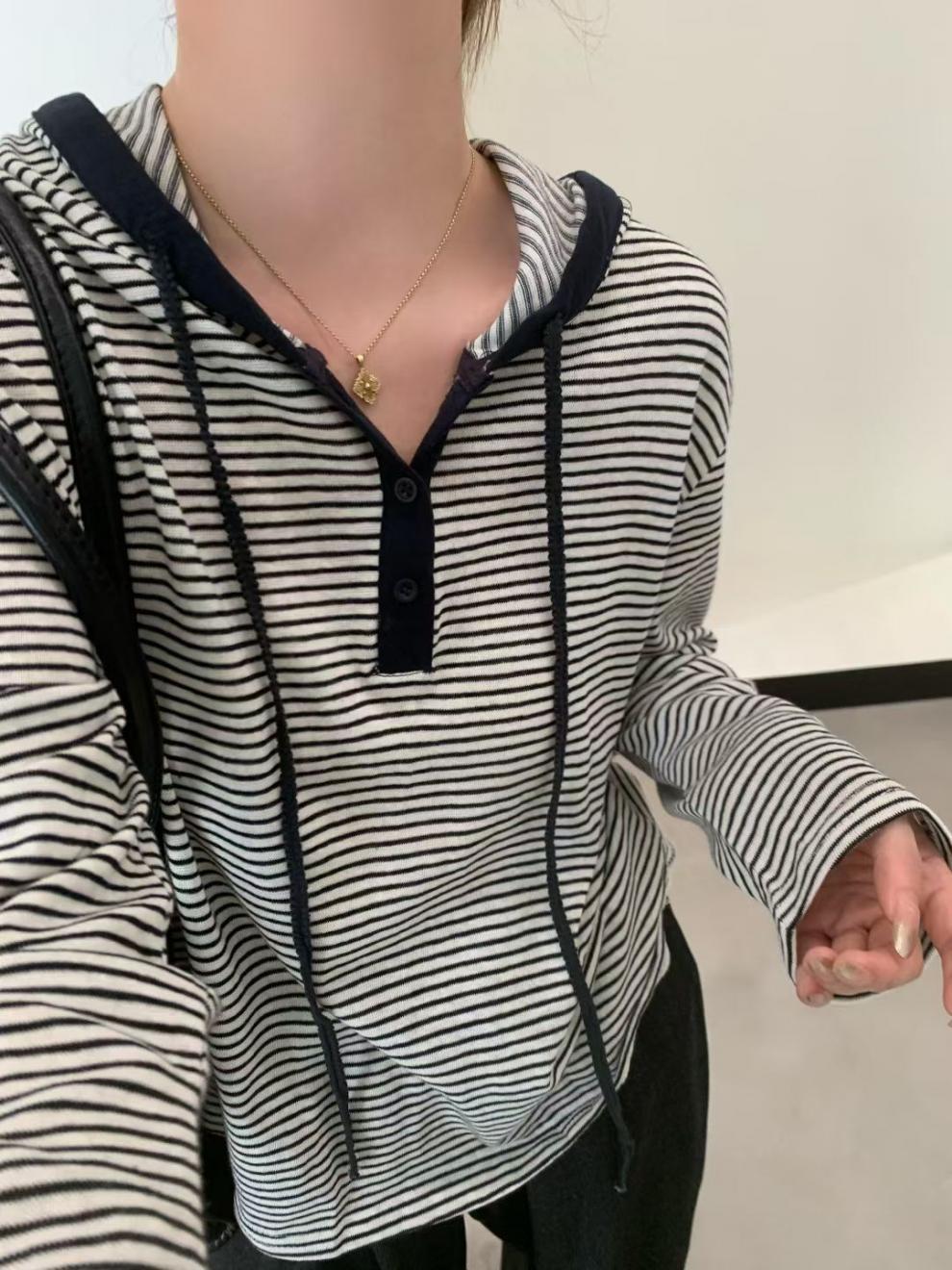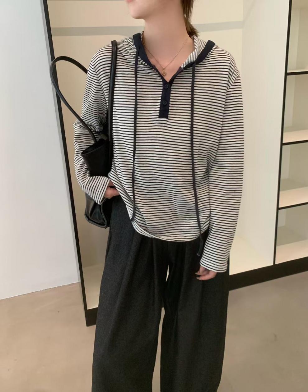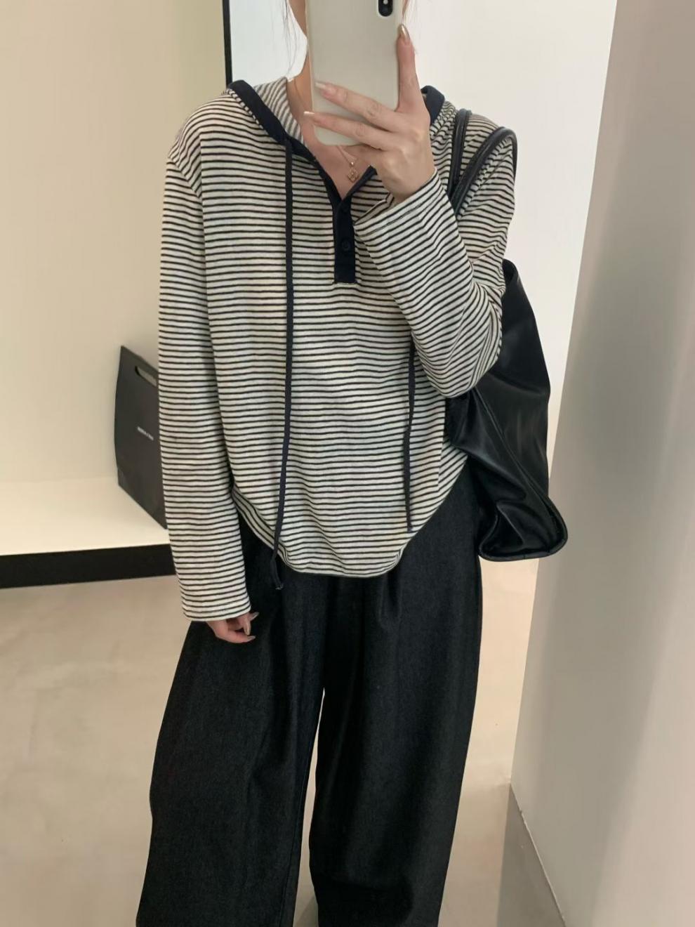 Foto en vivo~Otoño 2025 nueva camiseta de manga larga con capucha y cordón estilo coreano con rayas de bambú para mujer, top holgado tipo jersey