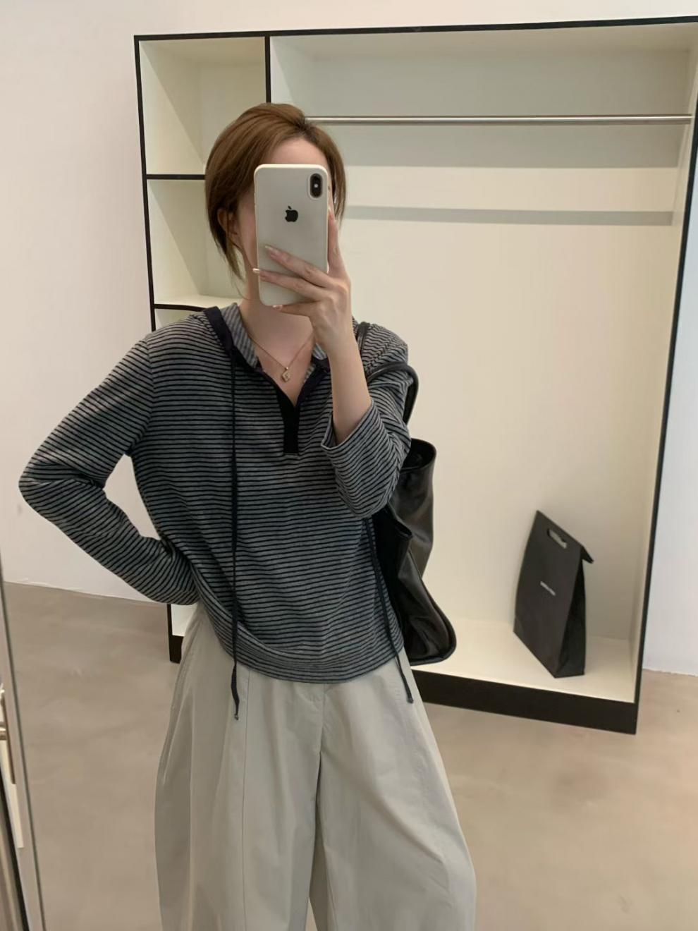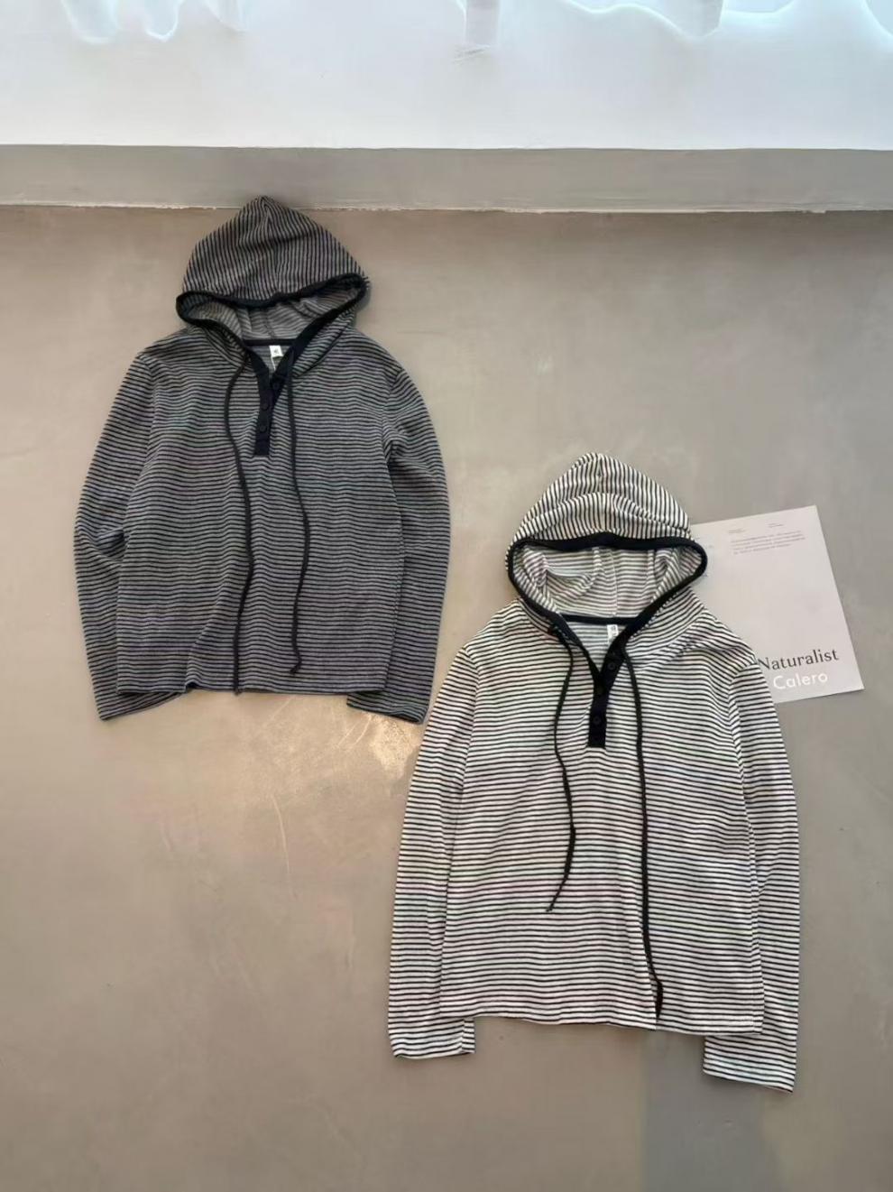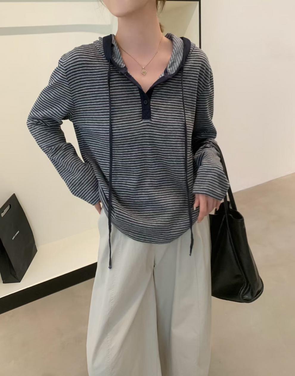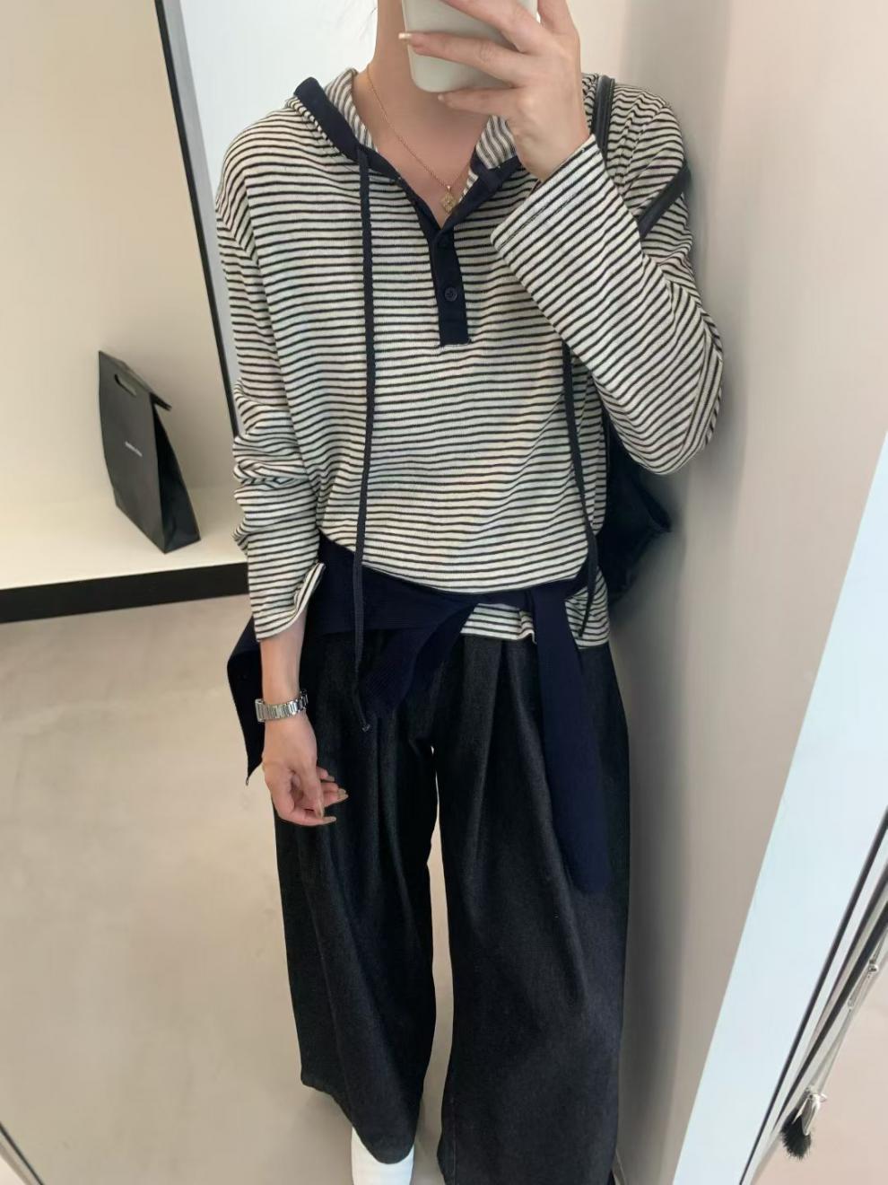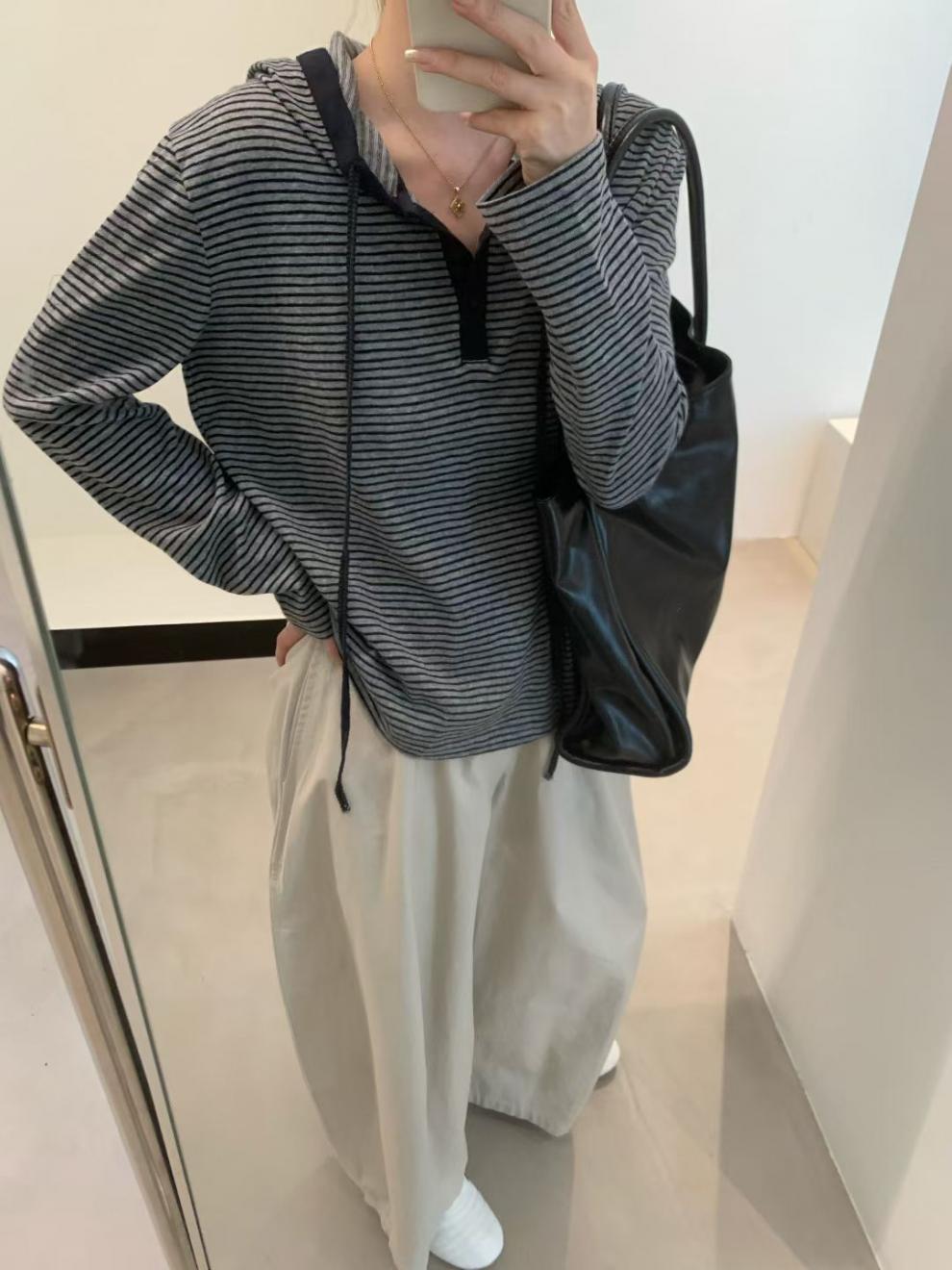 Foto en vivo~Otoño 2025 nueva camiseta de manga larga con capucha y cordón estilo coreano con rayas de bambú para mujer, top holgado tipo jersey
