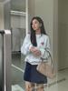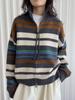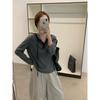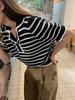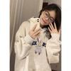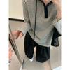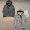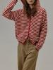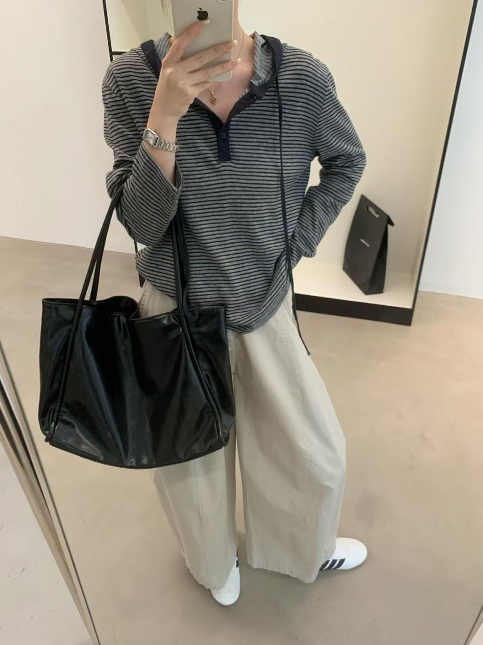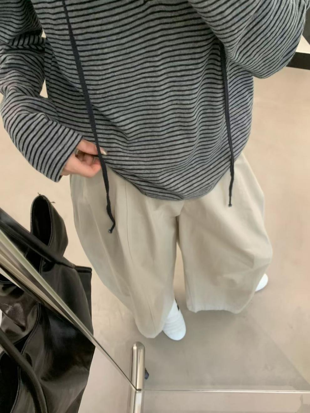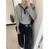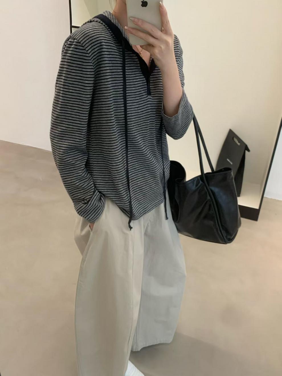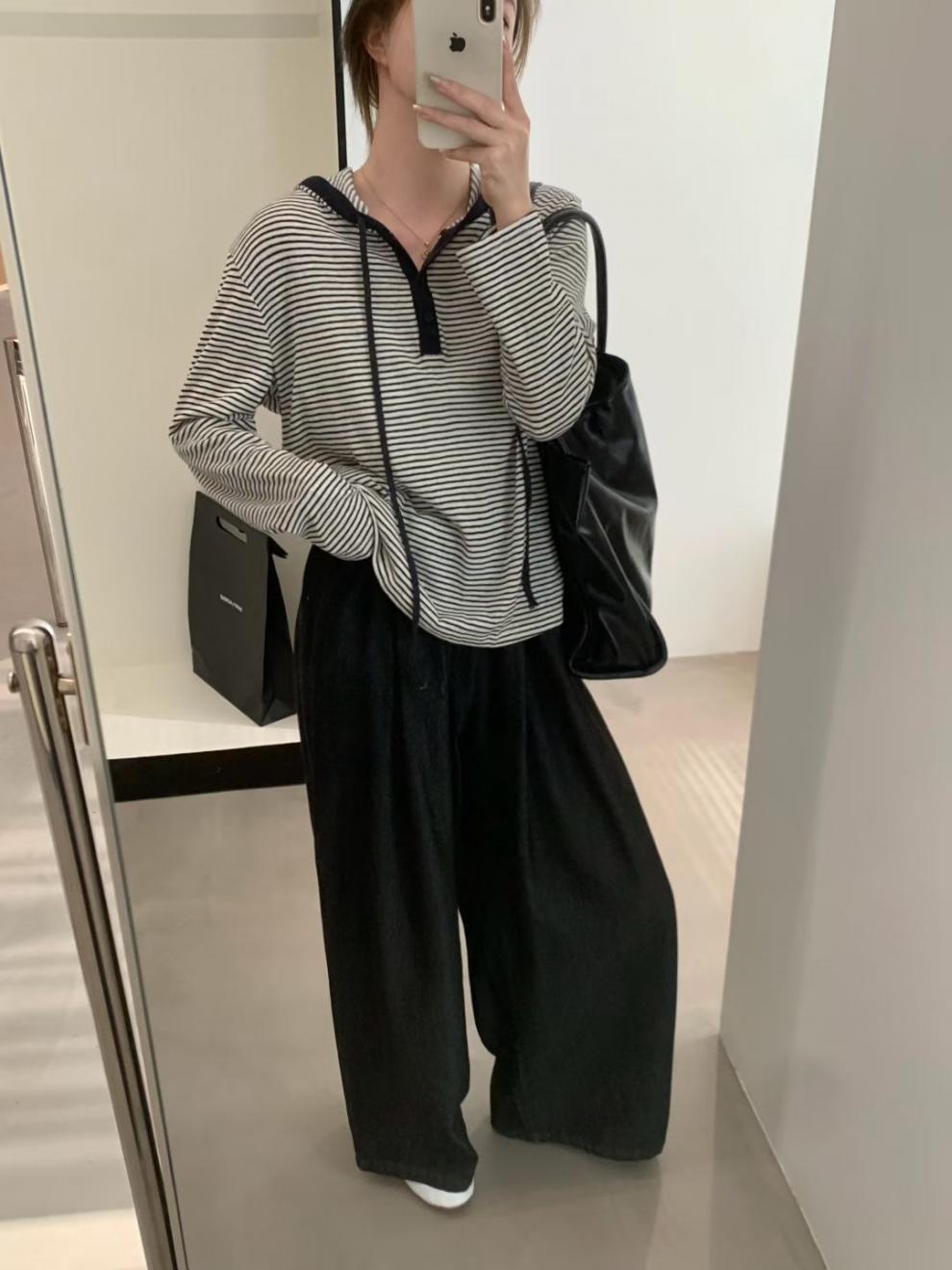 Foto en vivo~Otoño 2025 nueva camiseta de manga larga con capucha y cordón estilo coreano con rayas de bambú para mujer, top holgado tipo jersey