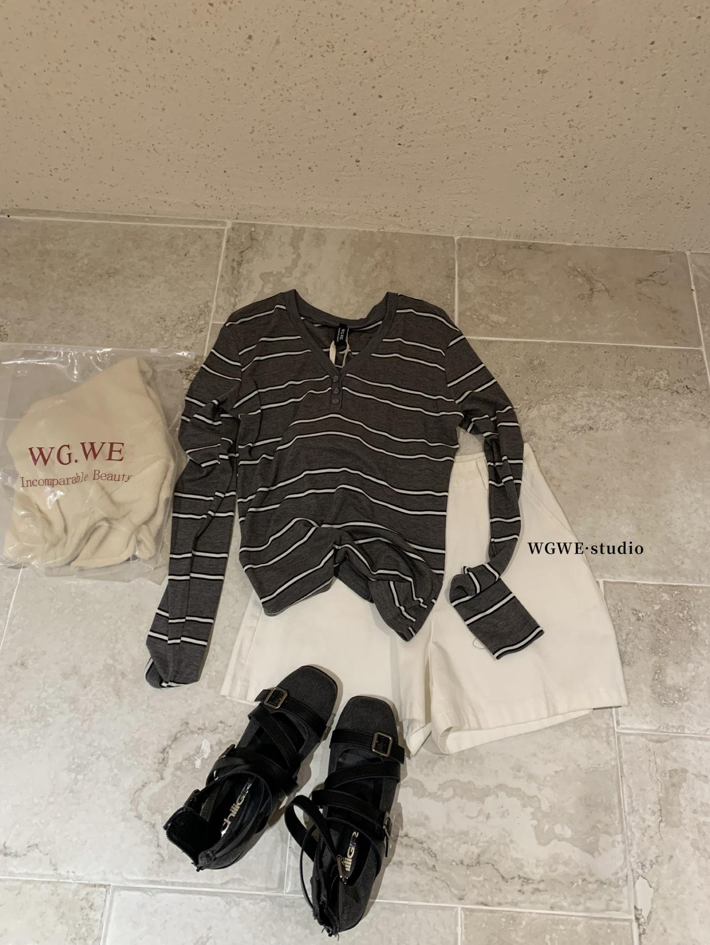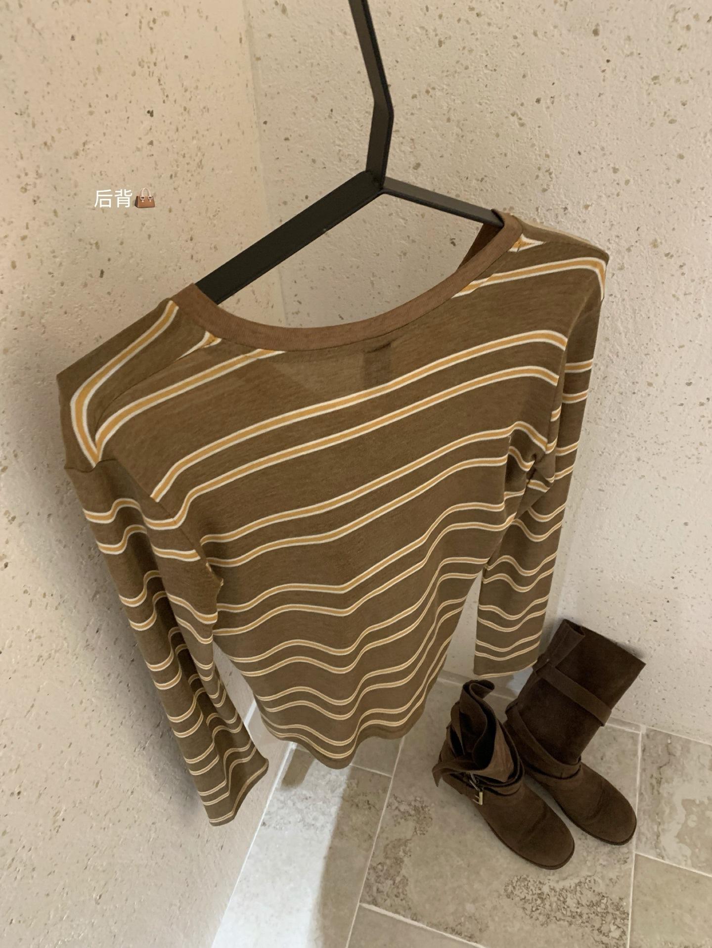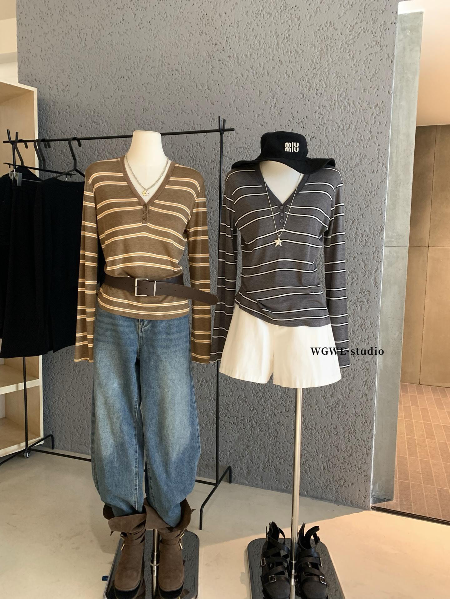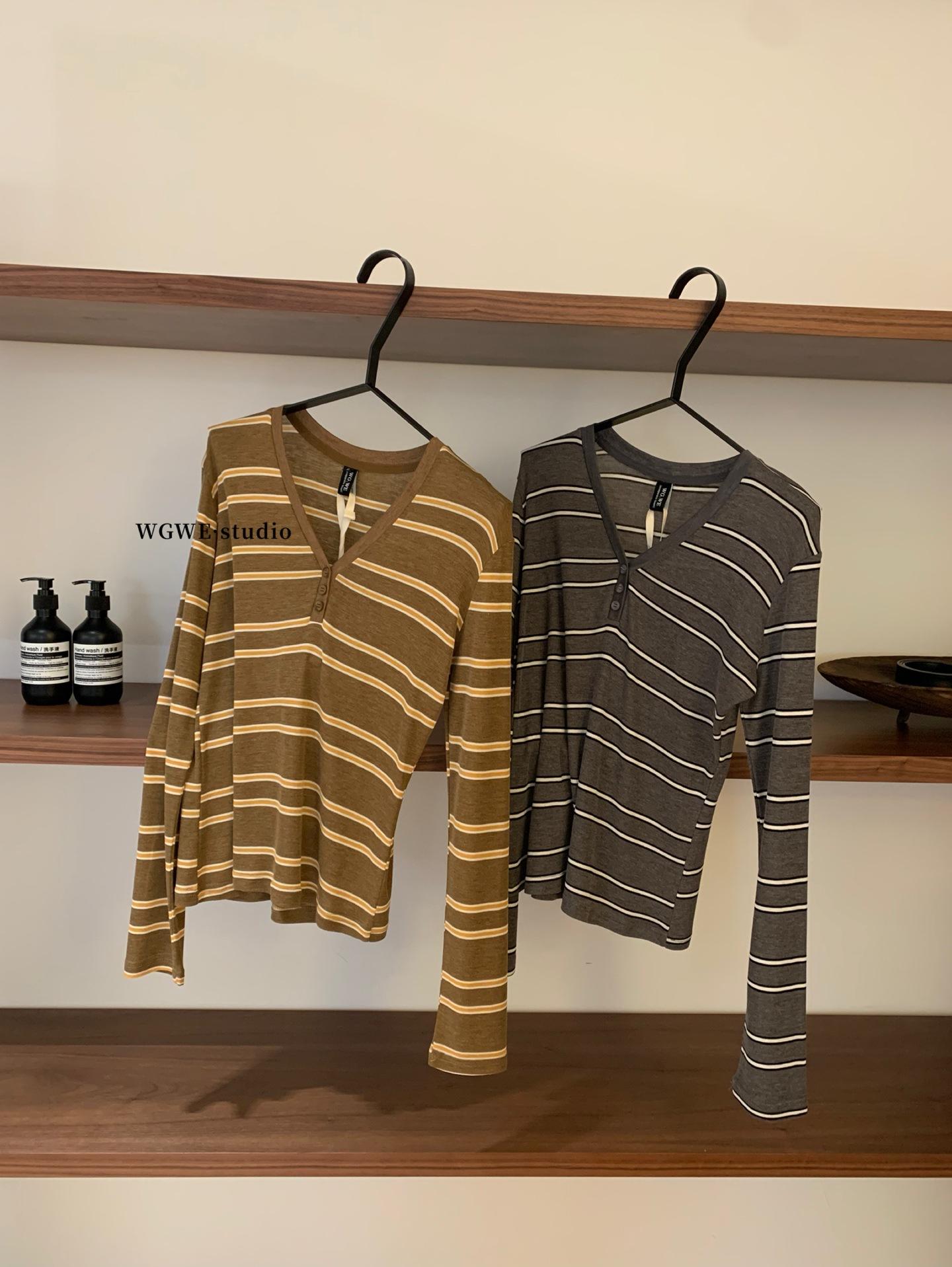 WGWE6972 Trece Líneas Ropa de Mujer 2025 Otoño Nuevo Camiseta de Manga Larga con Cuello en V a Rayas Top Delgado Suelto Casual