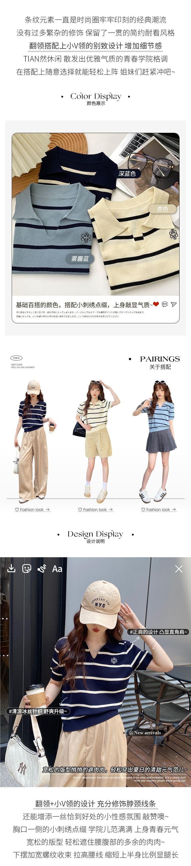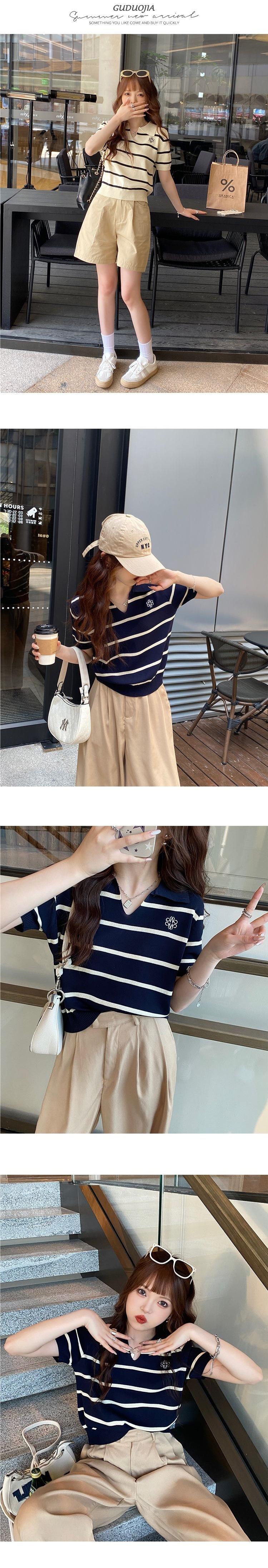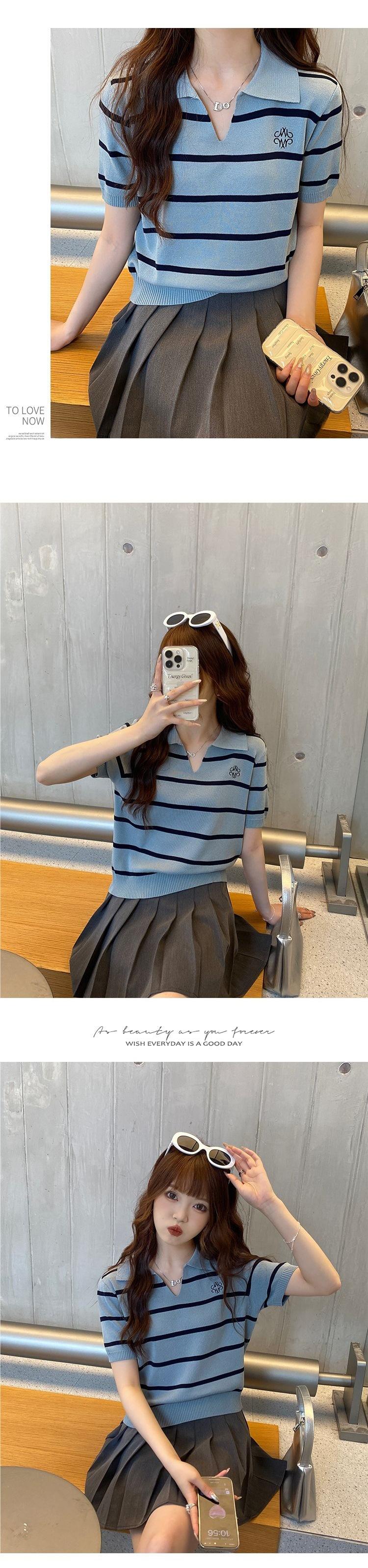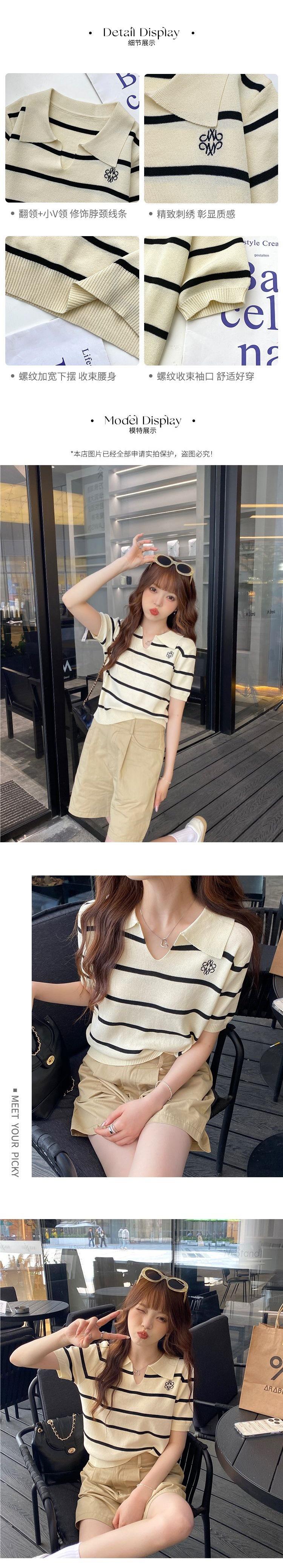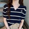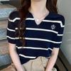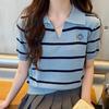 Camiseta de Punto de Manga Corta de Seda de Hielo para Mujer Verano Nuevo 2025 Rayada Cuello Polo Hombro Recto Chic Sentido de Alta Gama Adelgazante