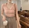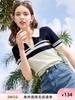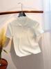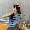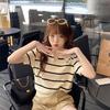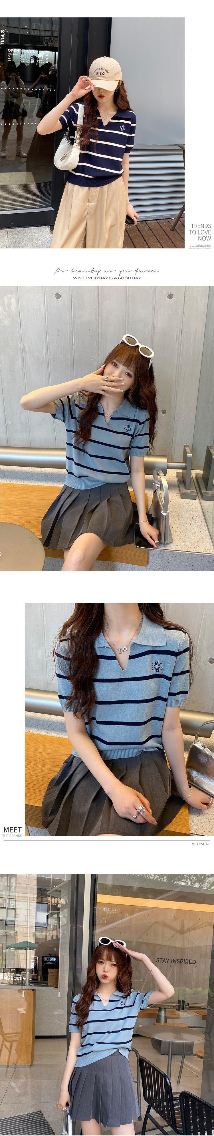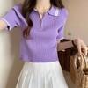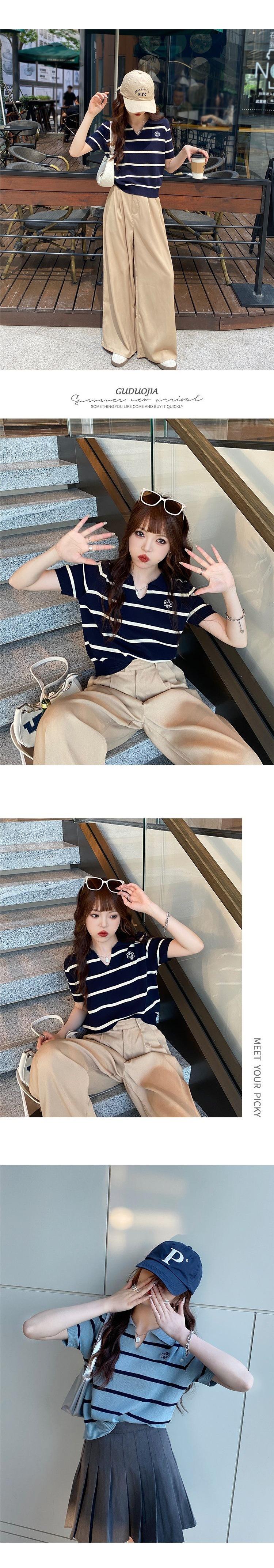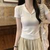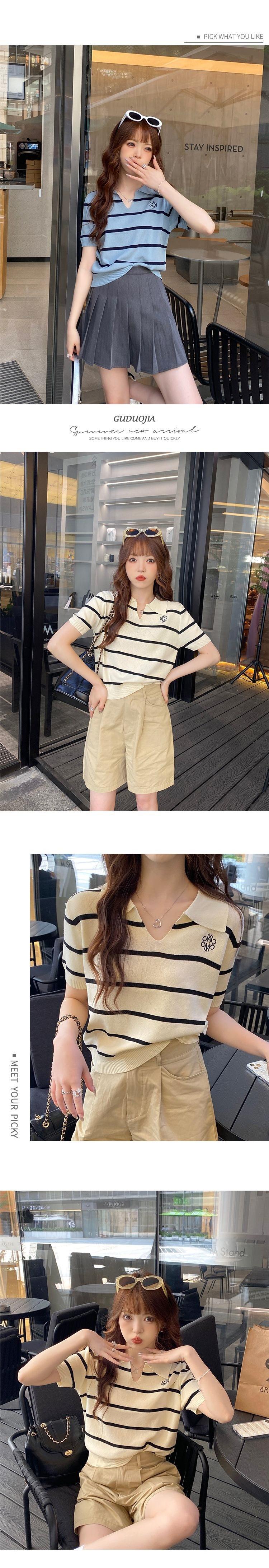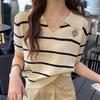 Camiseta de Punto de Manga Corta de Seda de Hielo para Mujer Verano Nuevo 2025 Rayada Cuello Polo Hombro Recto Chic Sentido de Alta Gama Adelgazante