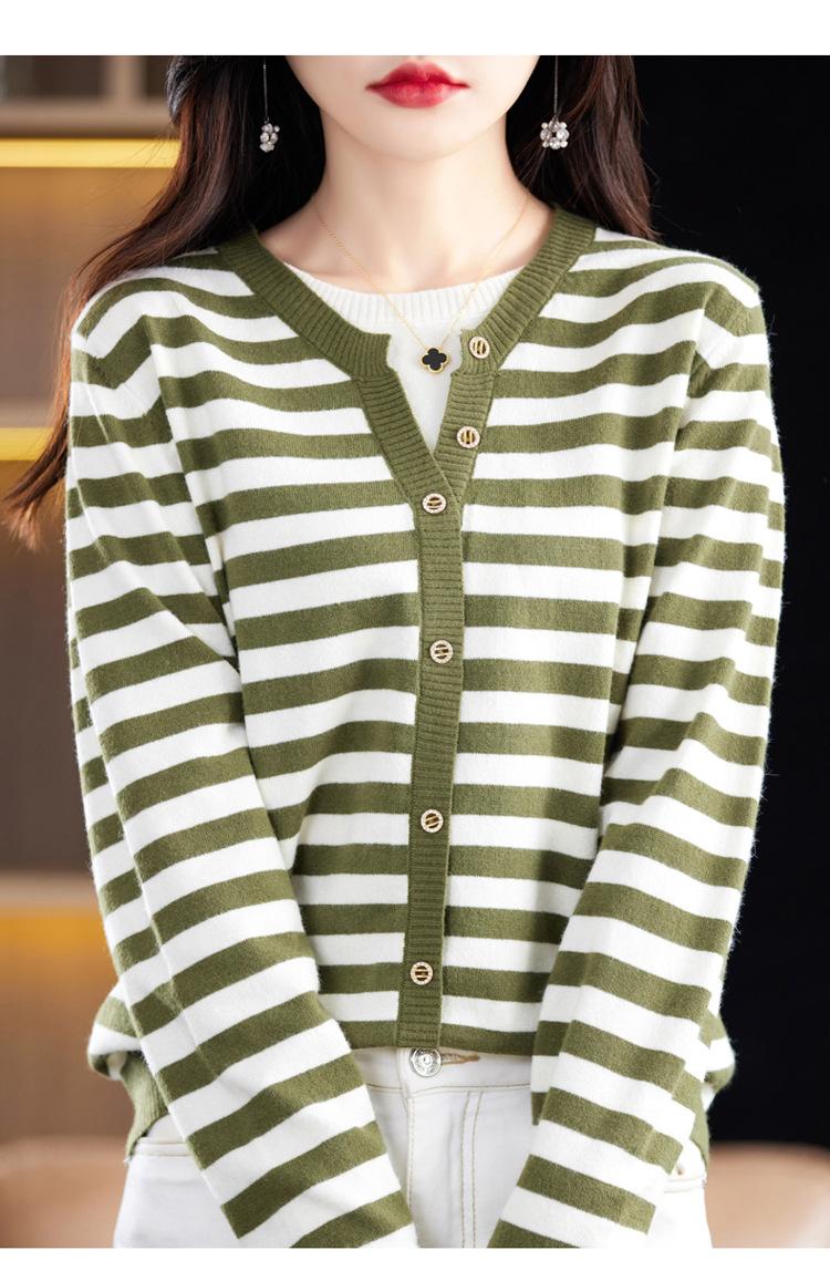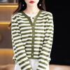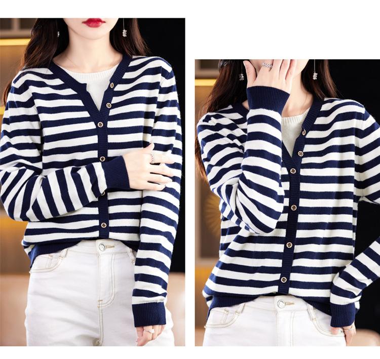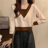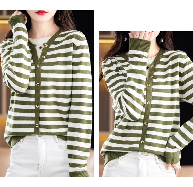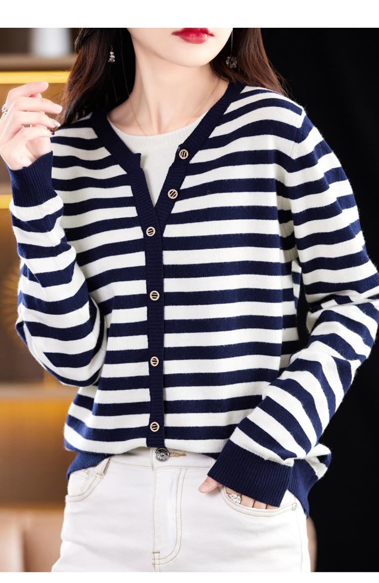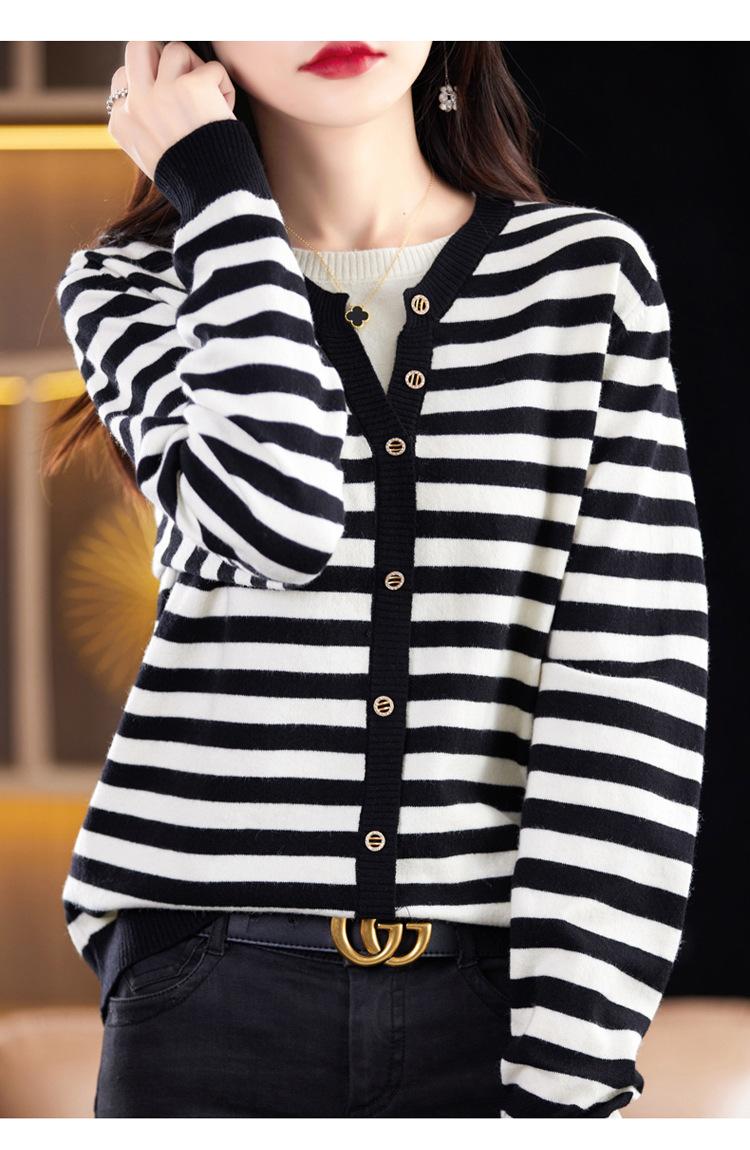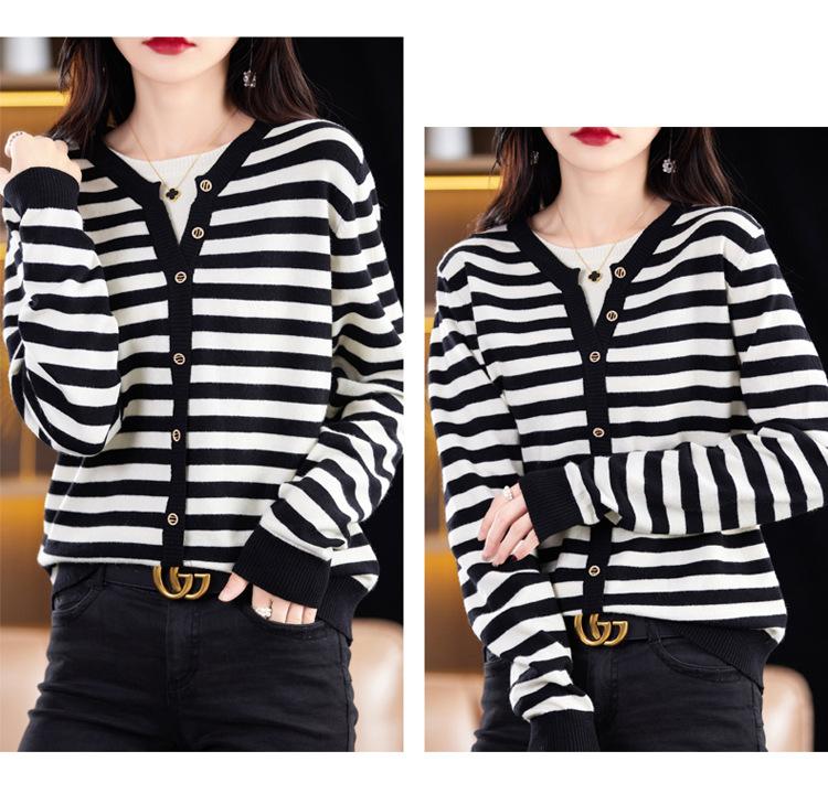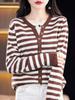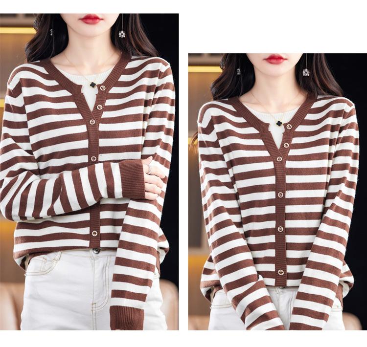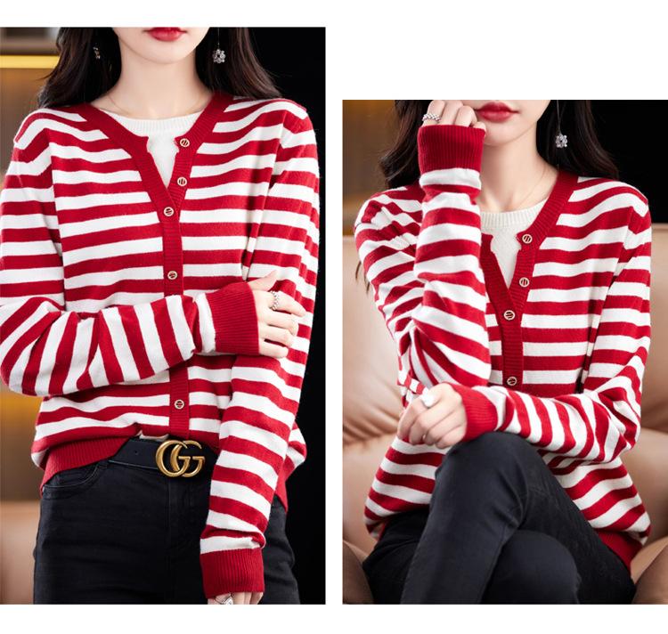 Cárdigan de Punto de Cuello en V Nuevo Otoño e Invierno 2024 para Mujer a Rayas de Color en Contraste Elegante Holgado Combinable Top Falso de Dos Piezas