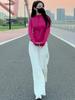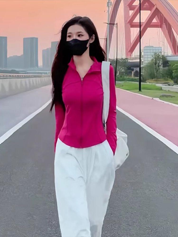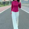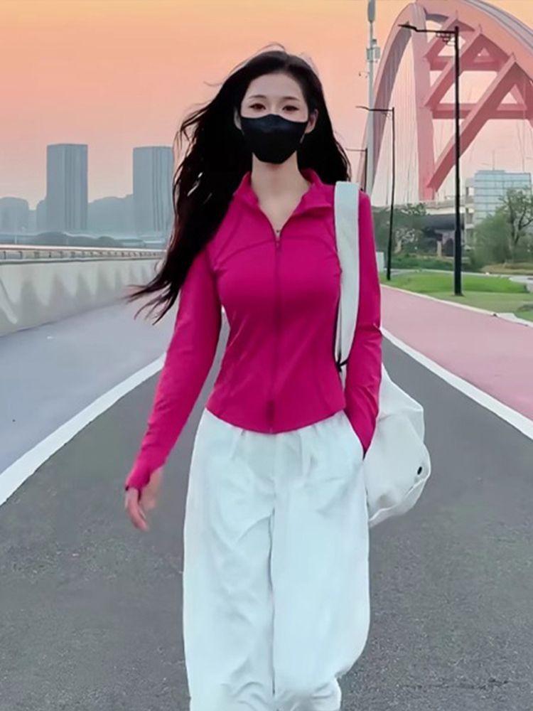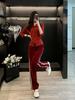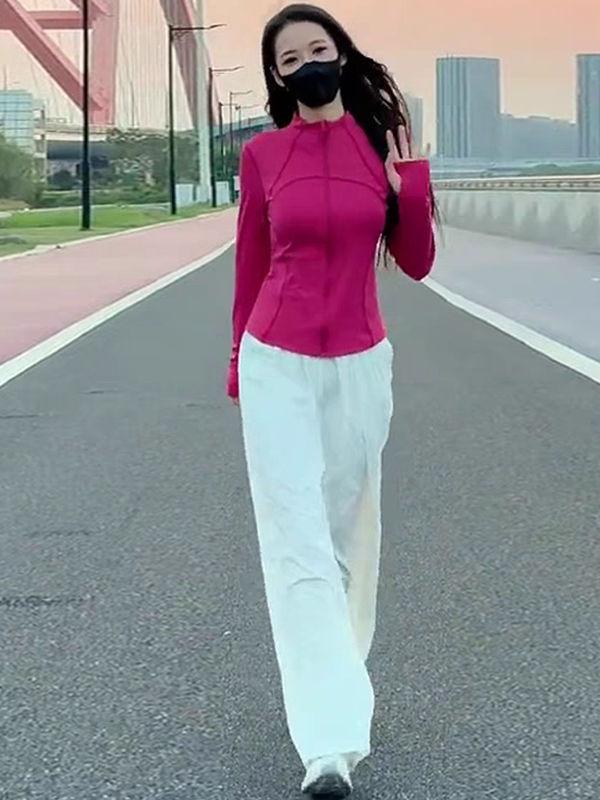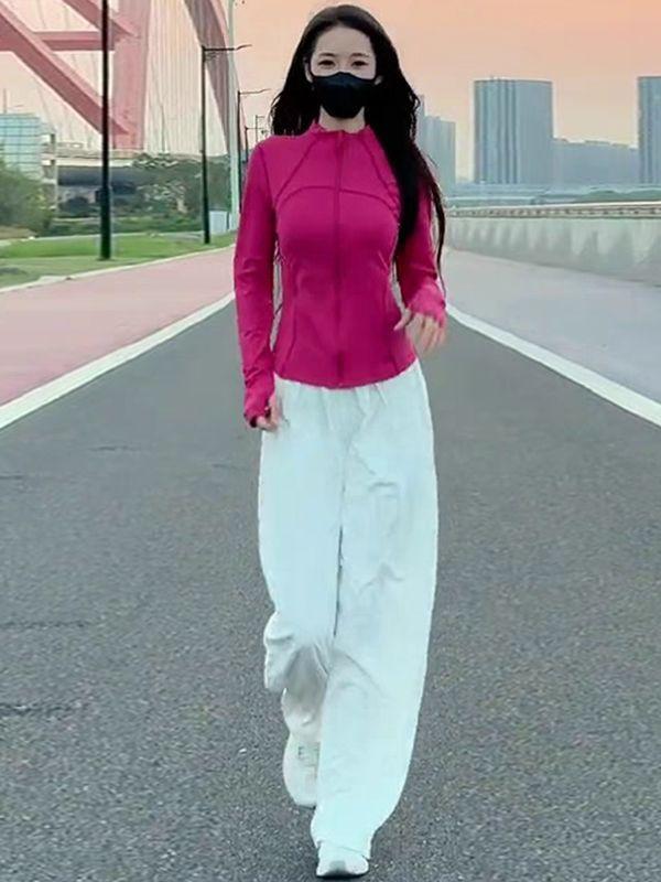 Ropa de Entrenamiento para Correr Conjunto de Ropa Deportiva Casual para Mujer Otoño Ajustado a la Moda Top Rojo Rosa Pantalones Blancos de Pierna Ancha Conjunto de Dos Piezas