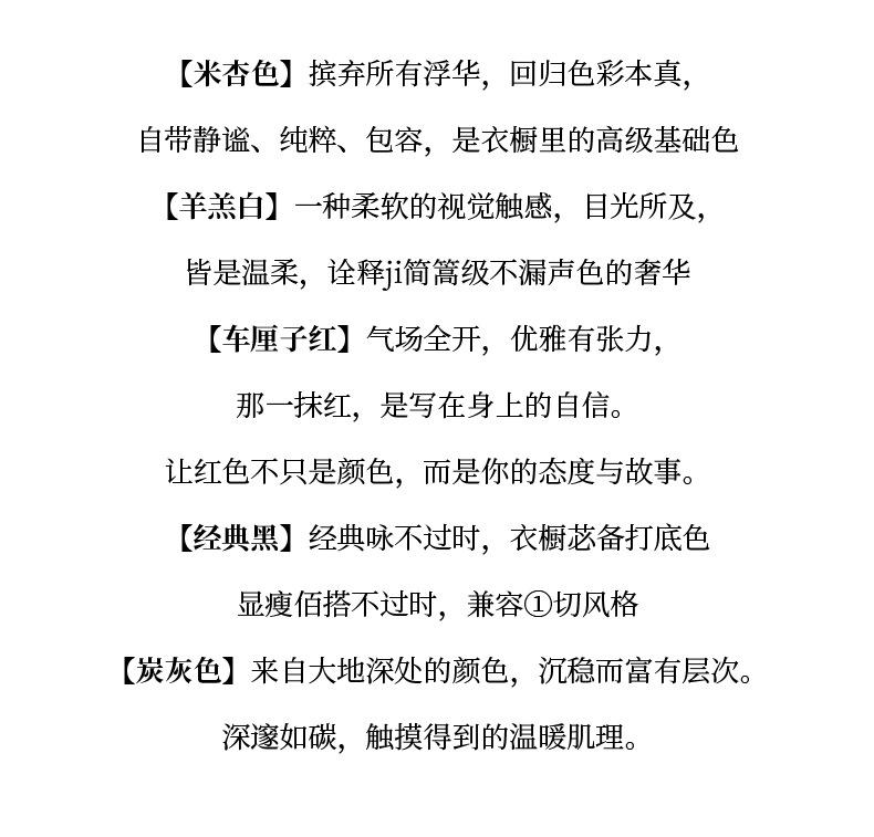 Rice apricot color, Lamb White, Cherry red, Classic black, charcoal gray