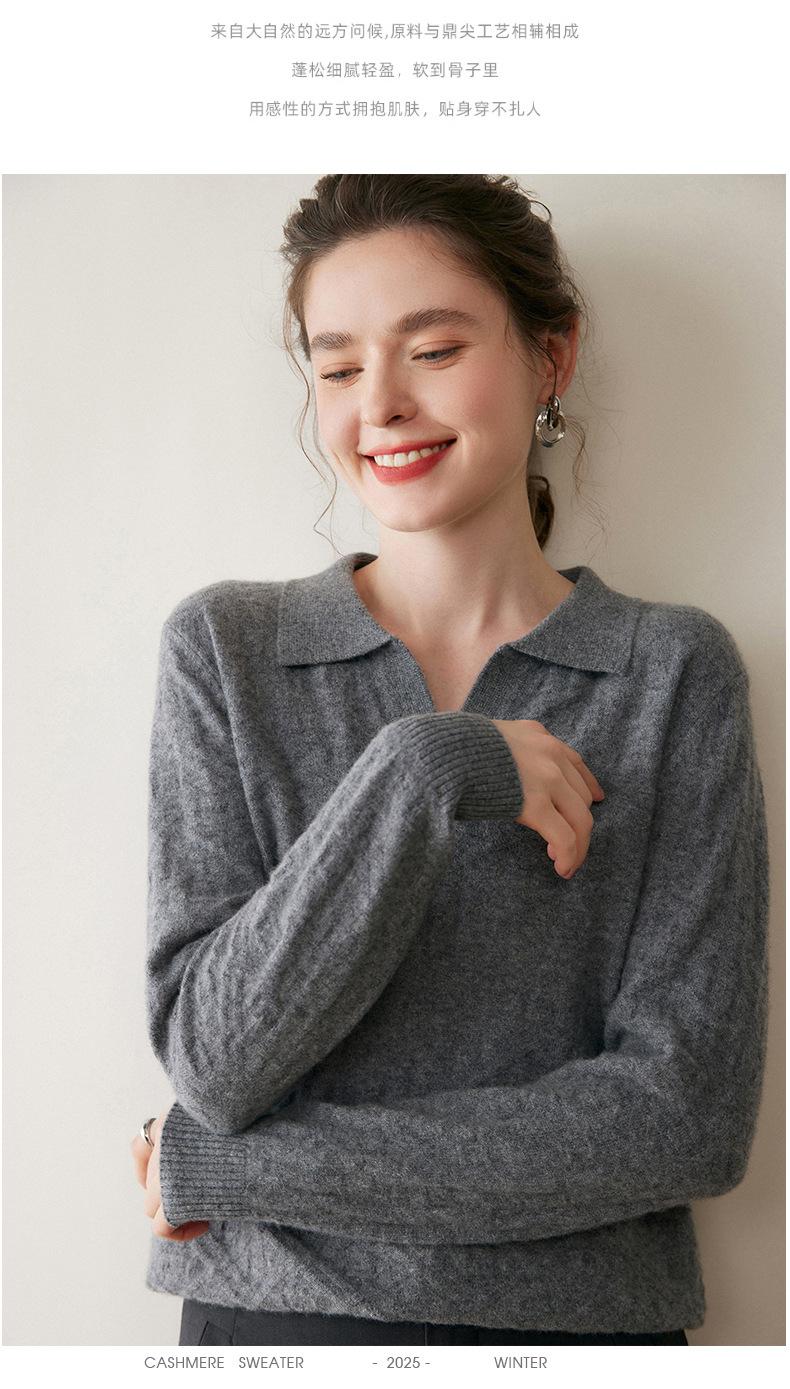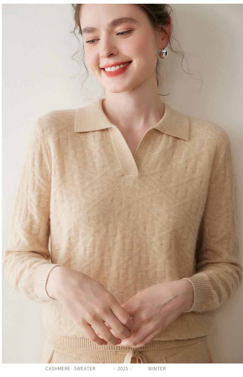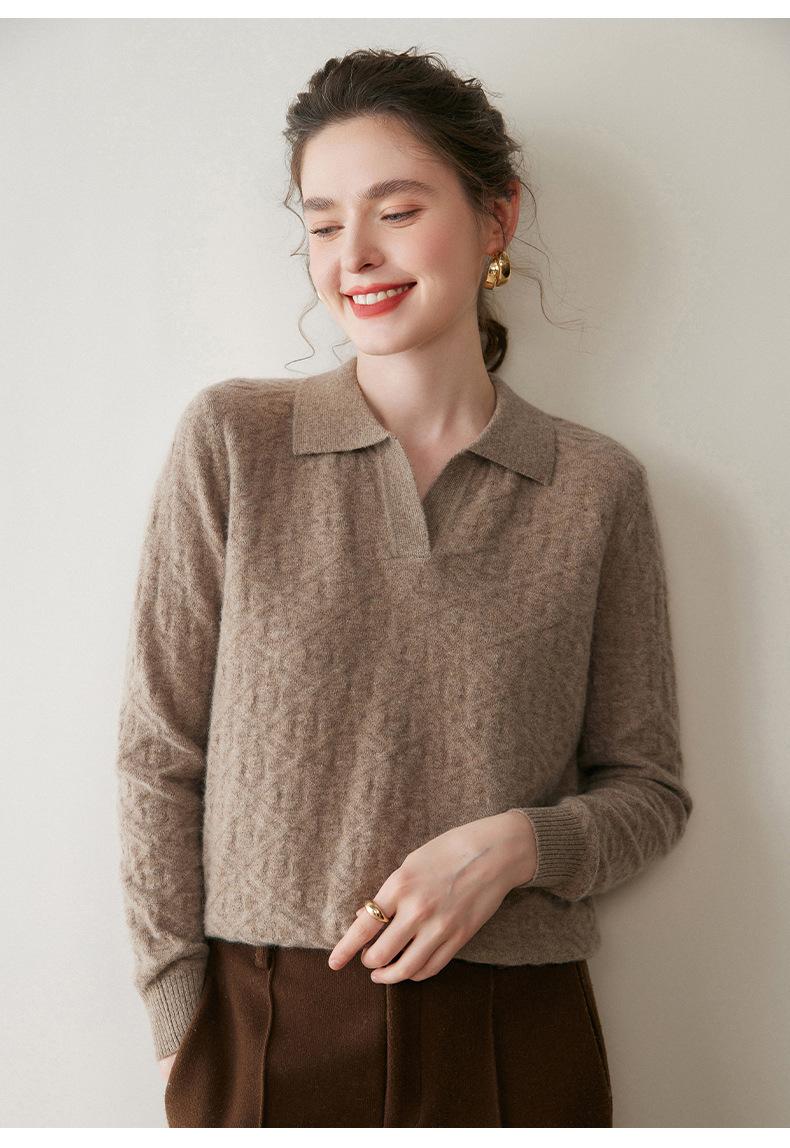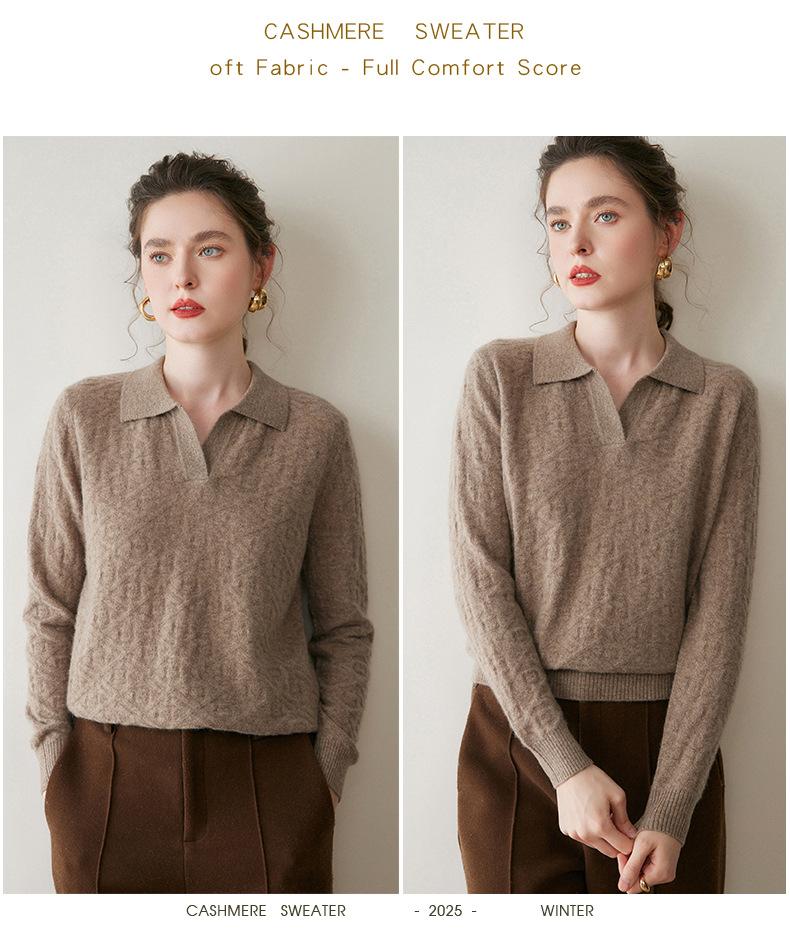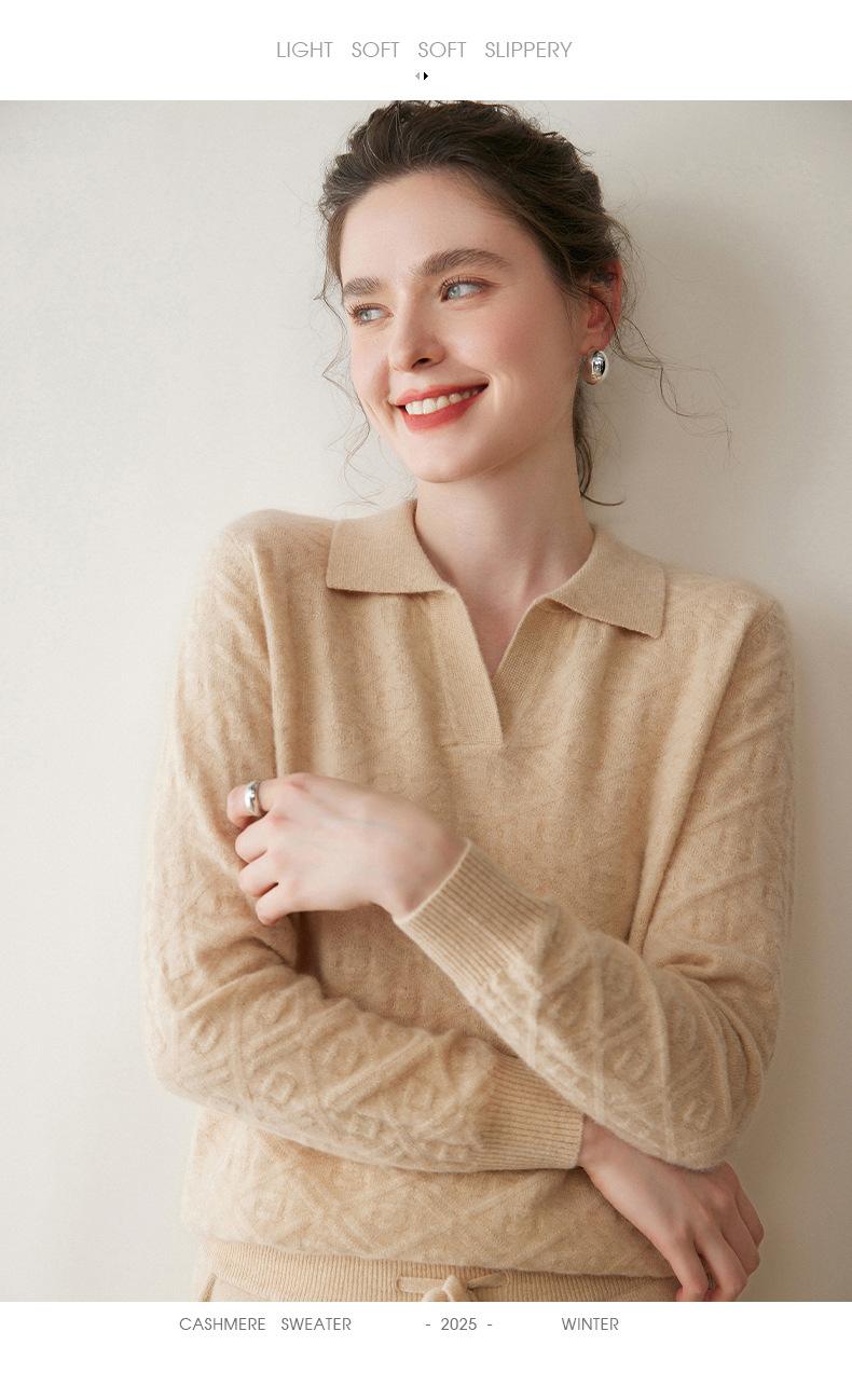 25 Otoño/Invierno Nuevo Suéter de Cachemira para Mujer Cuello Polo Medio Abierto Tejido Jacquard Camisa Base Temperamento Adelgazante Color Sólido