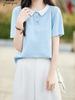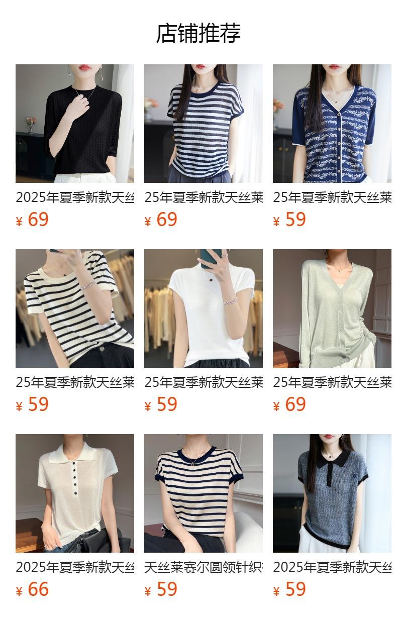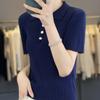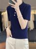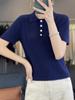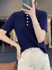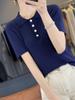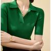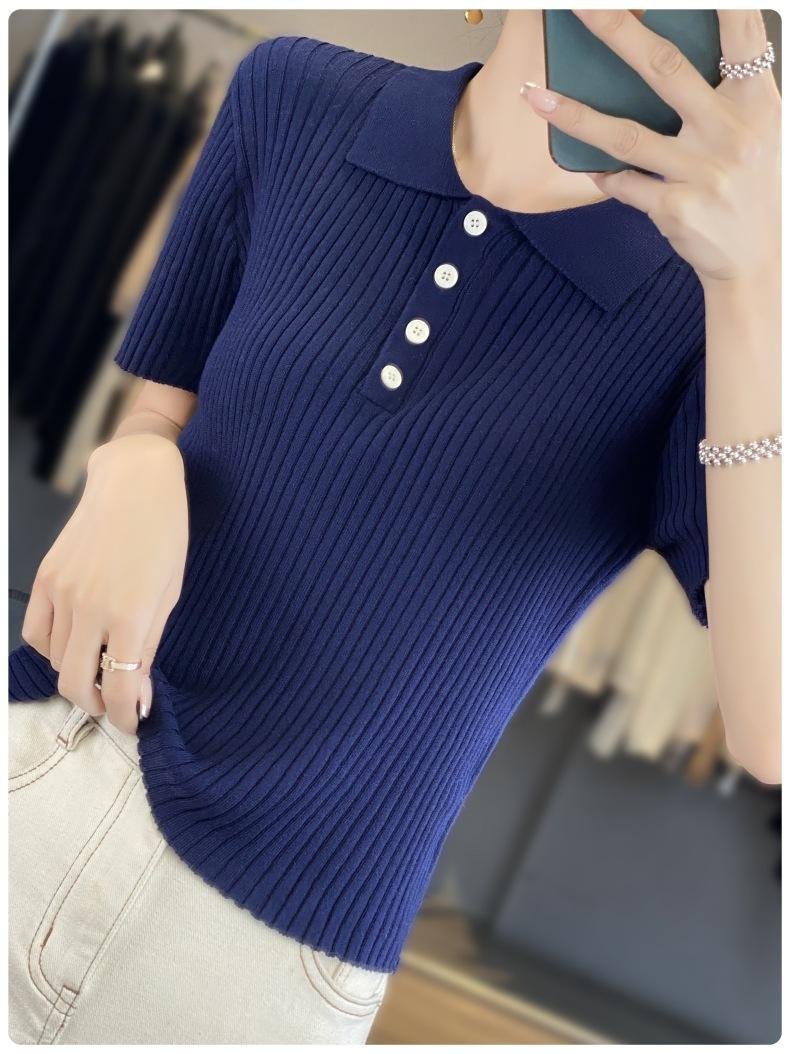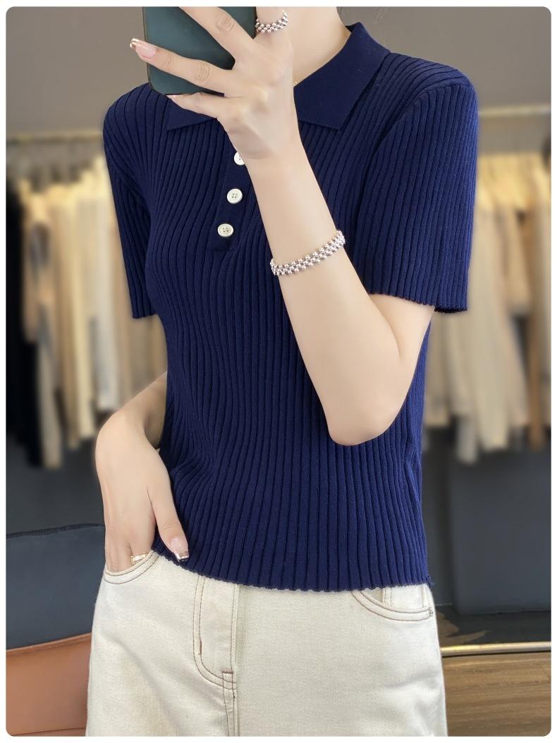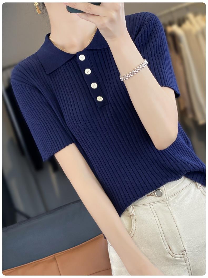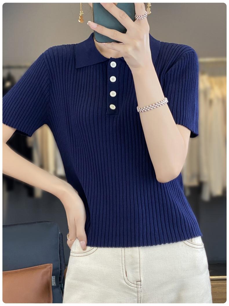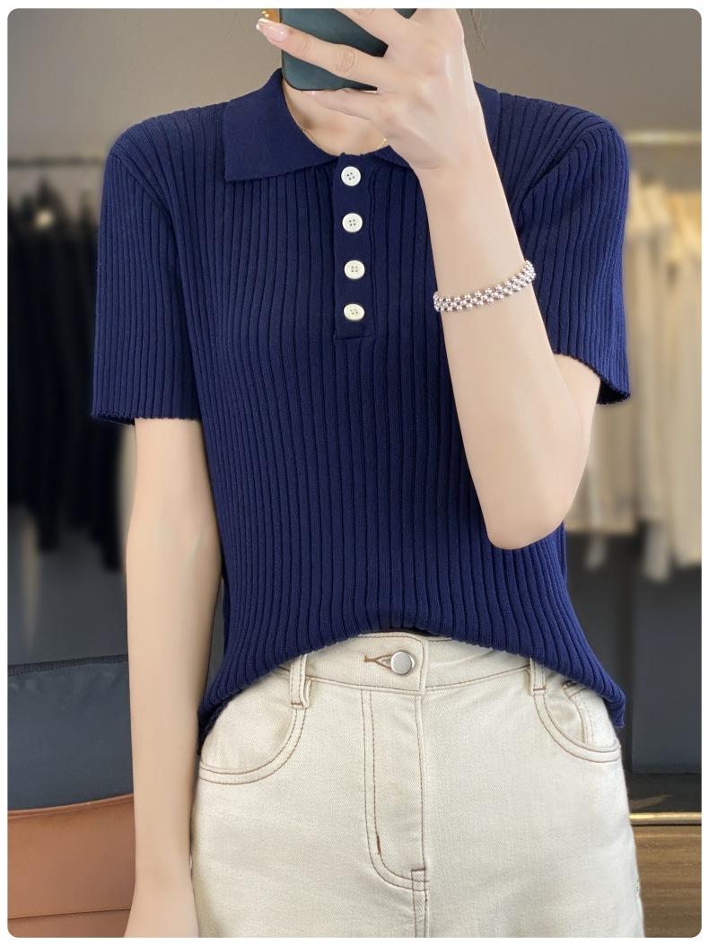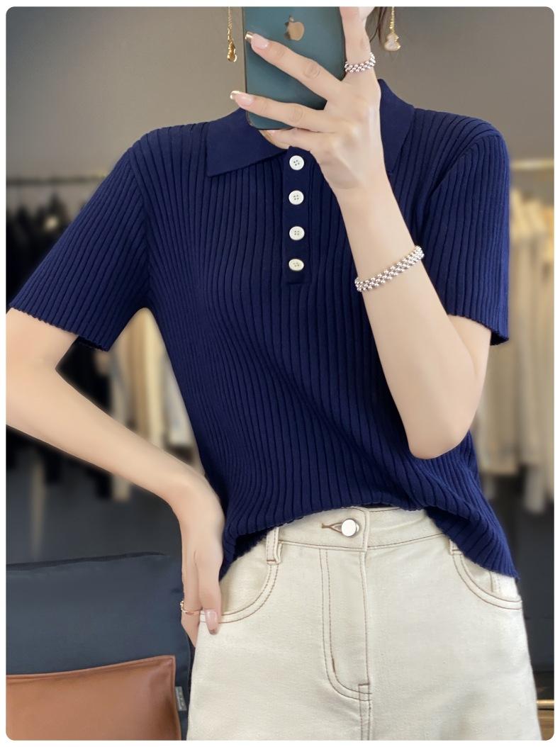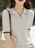 25 Nuevo Verano Polo Cuello Tejido de Punto Camiseta de Manga Corta para Mujer Color Puro Rayado Suelto Versátil Camiseta Base Top