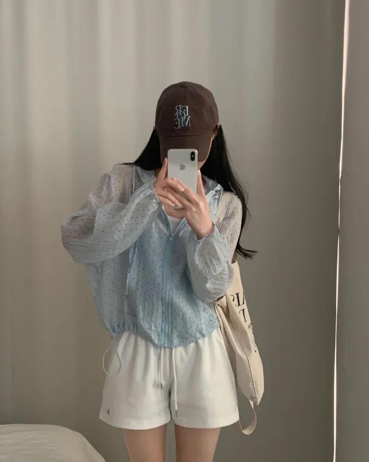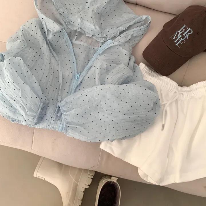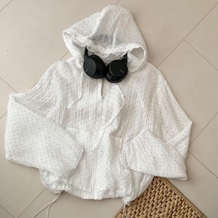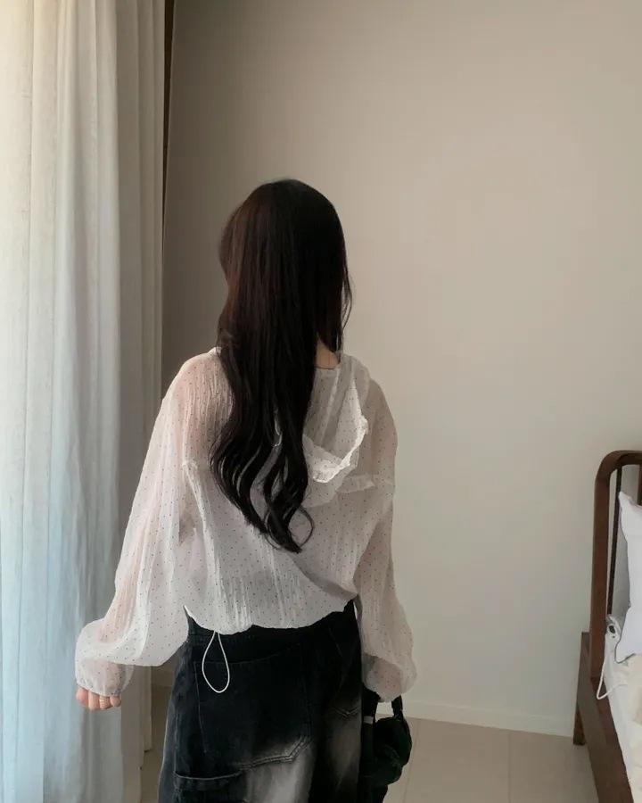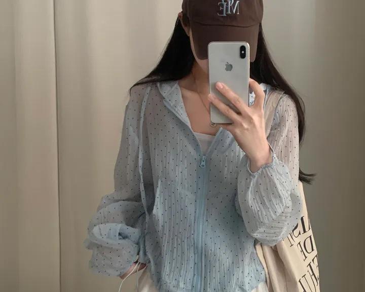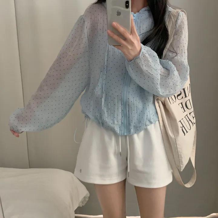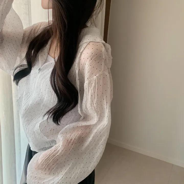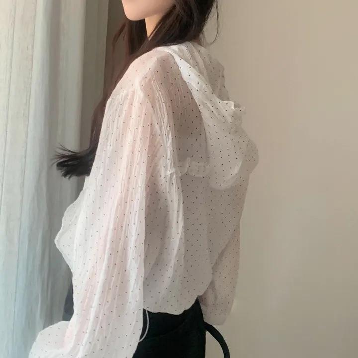 Camisa Chic de Estilo Coreano con Lunares y Capucha para Protección Solar para Mujer