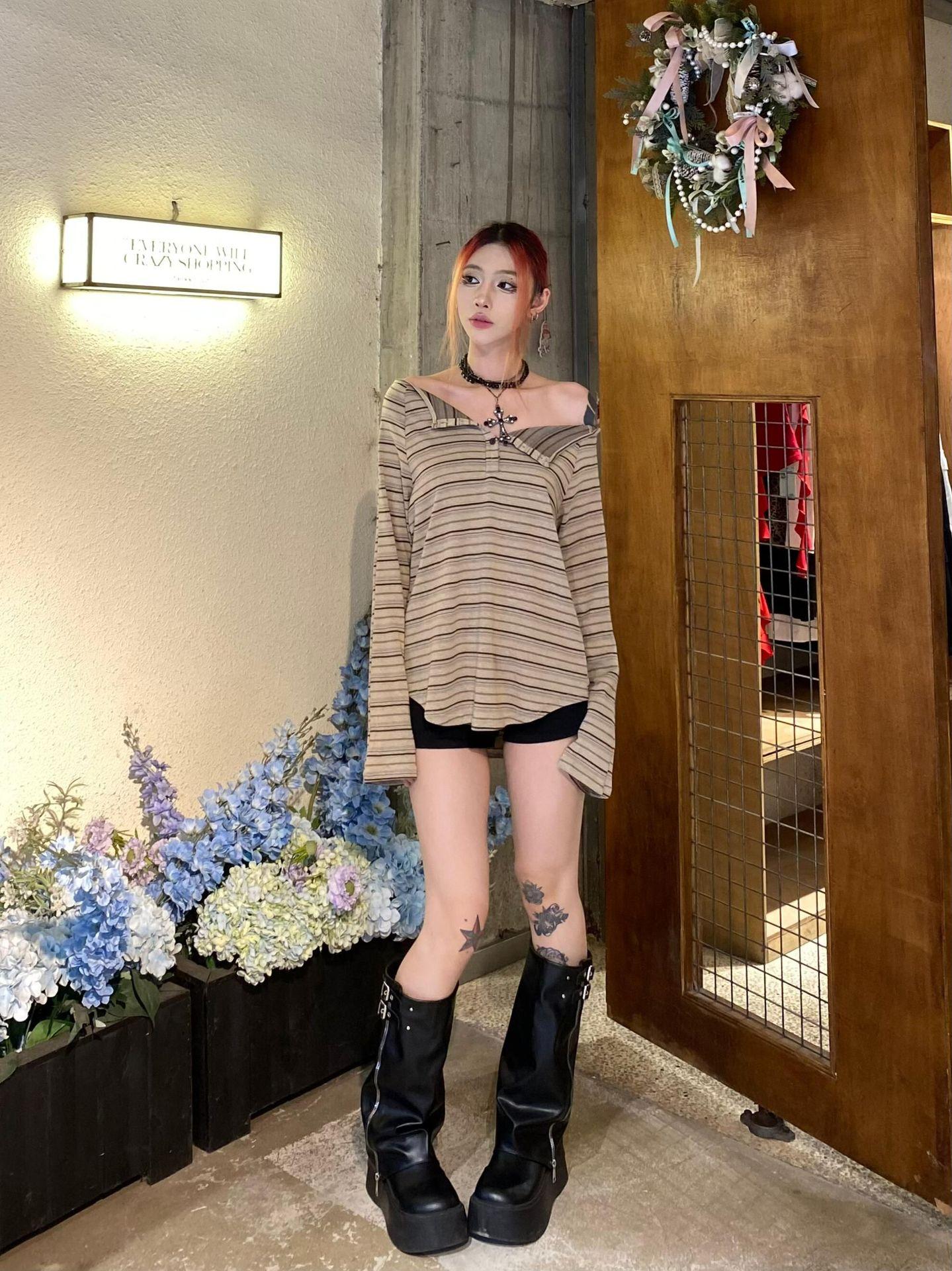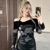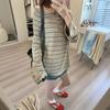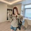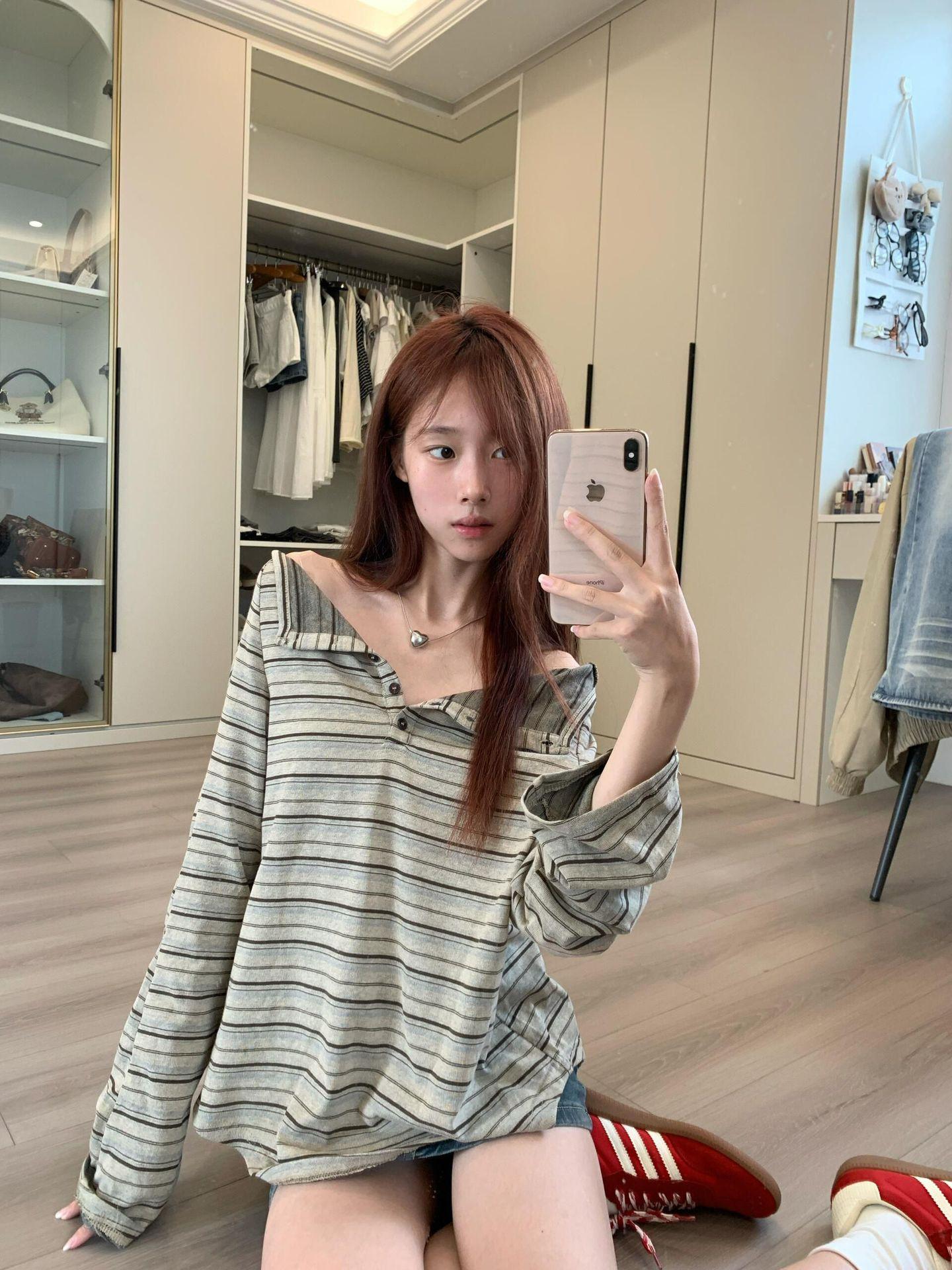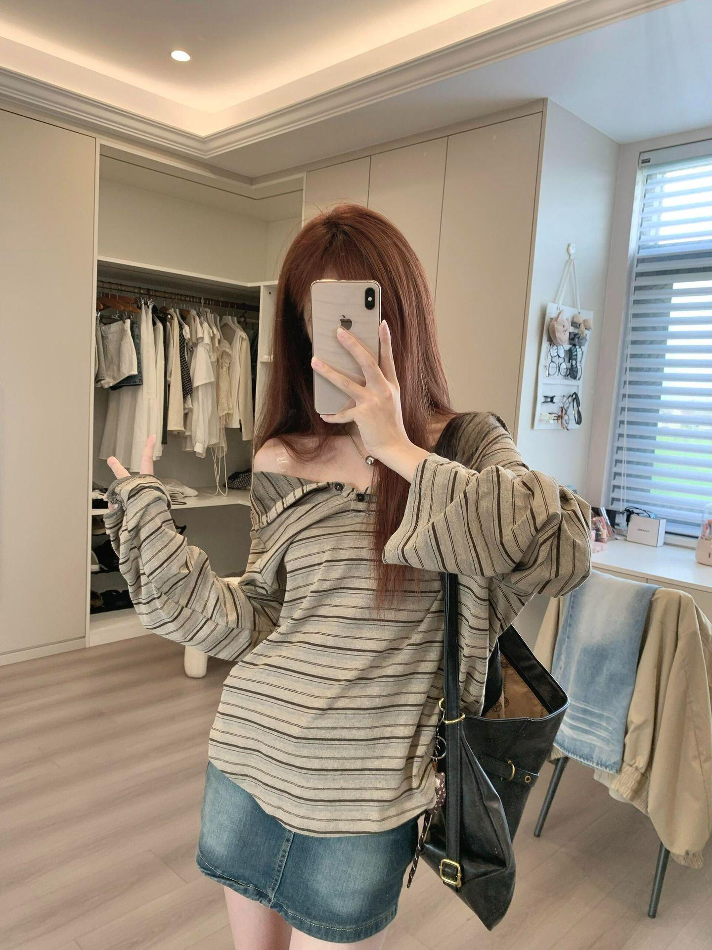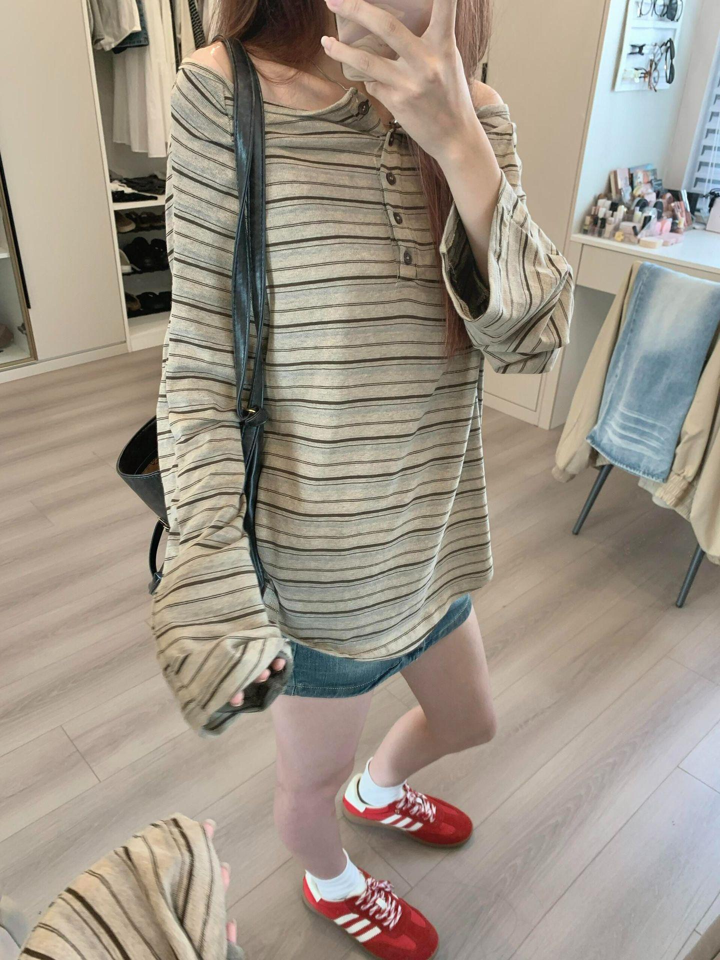 Camiseta Holgada de Rayas de Manga Larga con Protección Solar para Chica Picante Americana 2025 Primavera y Otoño Nuevo Estilo Camiseta Básica Top con Hombro Descubierto