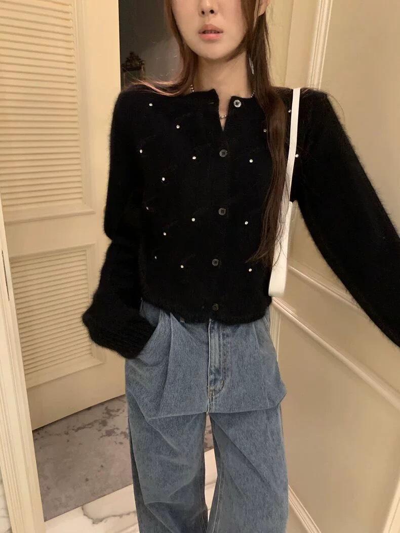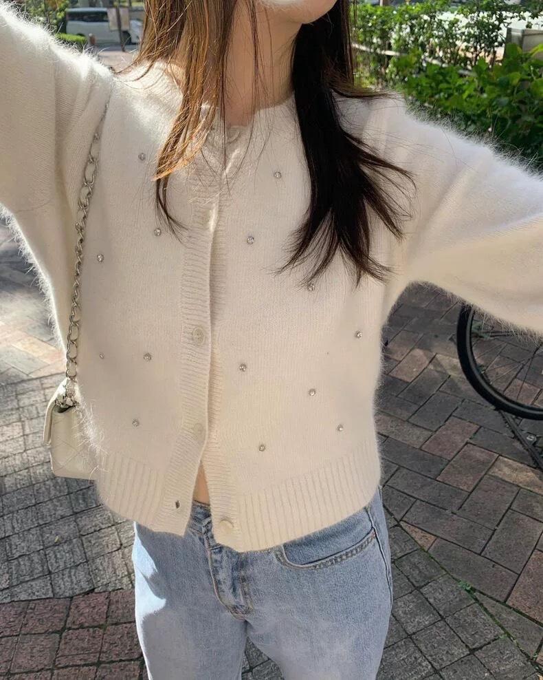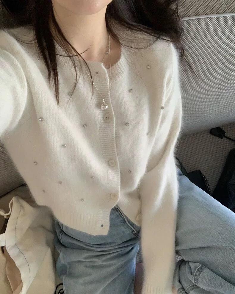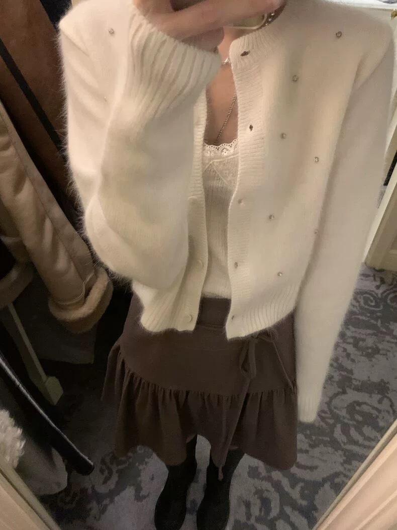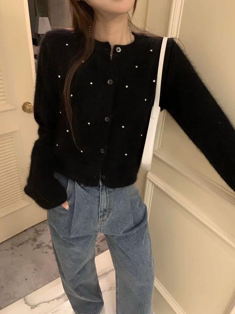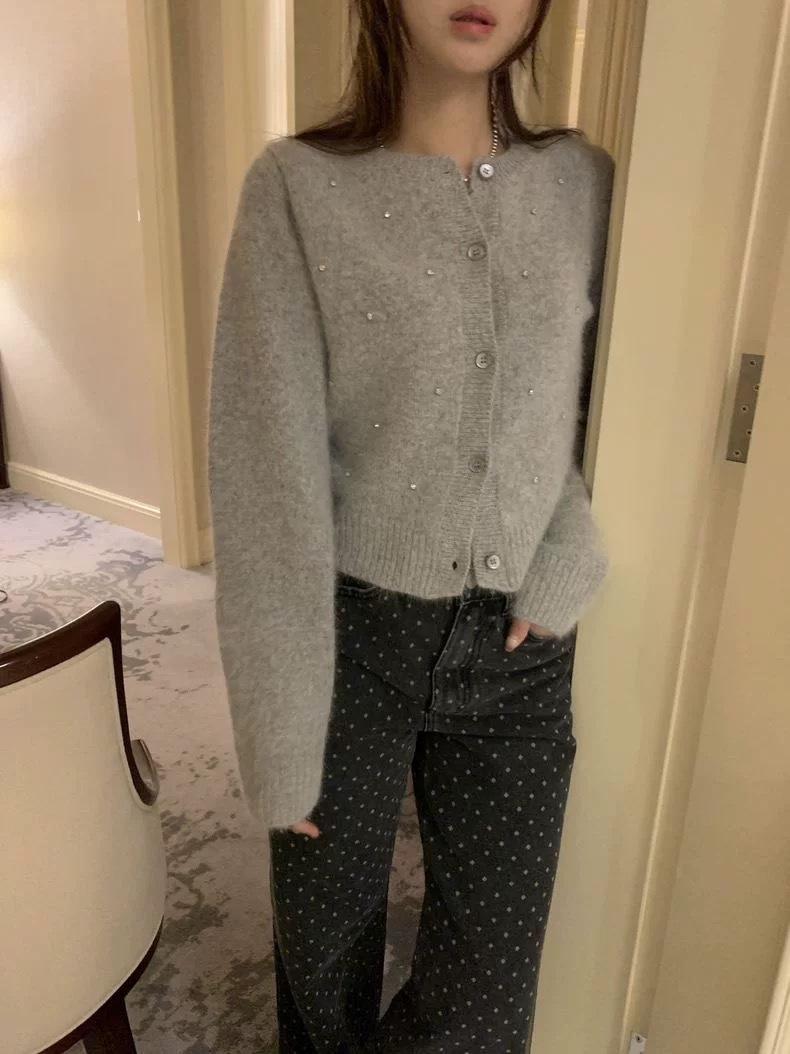 2025 Nuevo Otoño e Invierno Diseño Francés Cárdigan Elegante de Punto Diamante Brillante Estilo Dulce y Gentil Prenda Exterior Suéter de Alta Calidad para Mujer