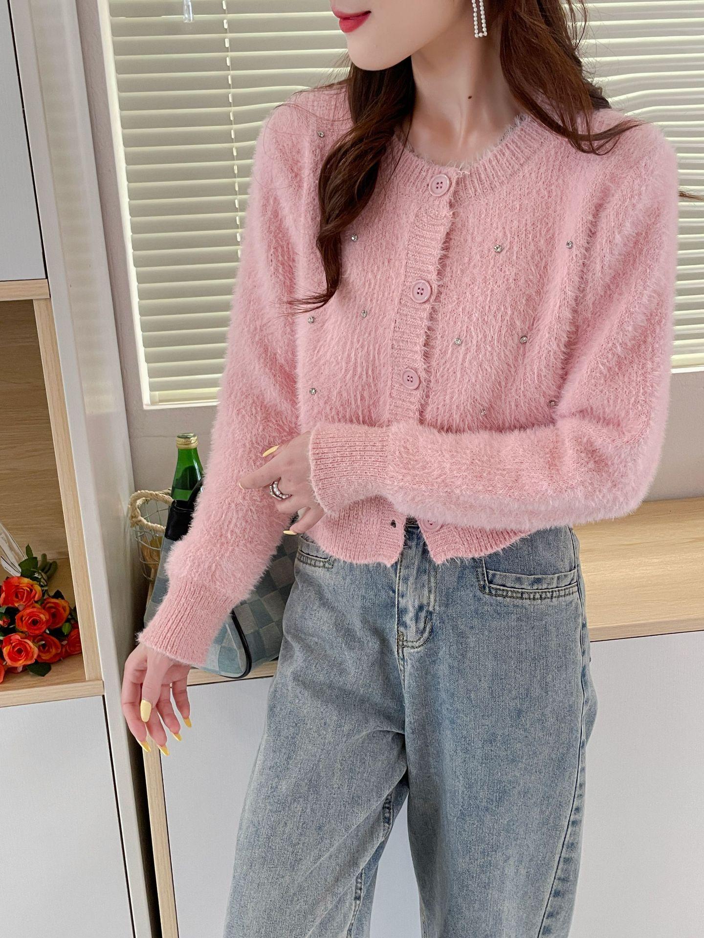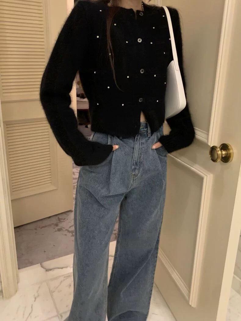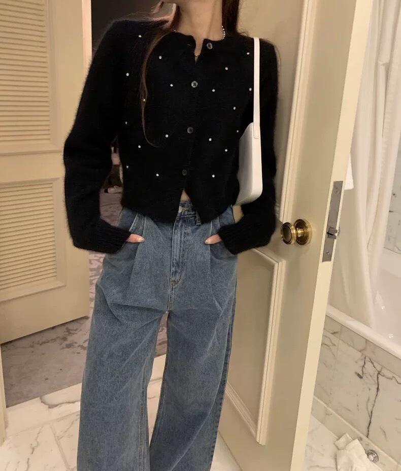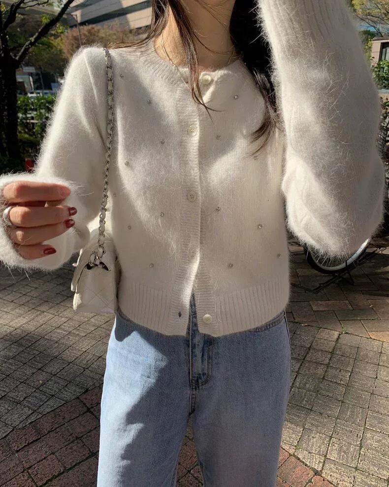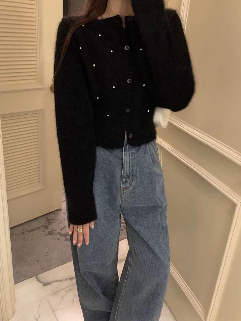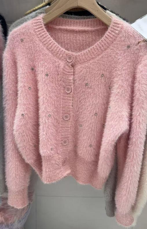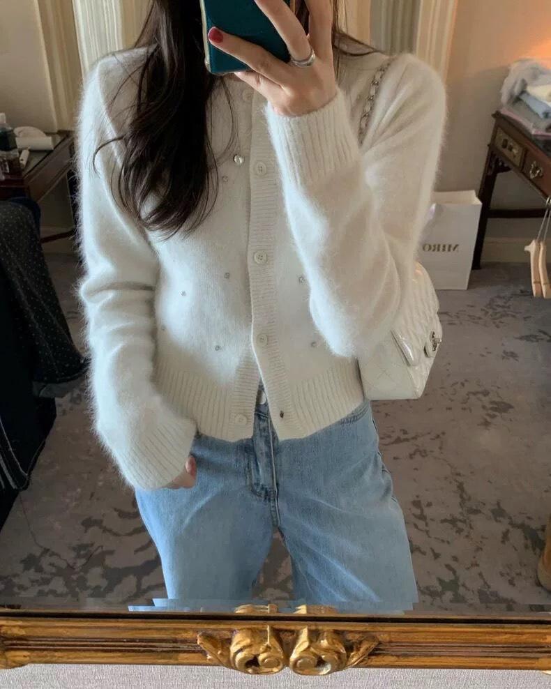 2025 Nuevo Otoño e Invierno Diseño Francés Cárdigan Elegante de Punto Diamante Brillante Estilo Dulce y Gentil Prenda Exterior Suéter de Alta Calidad para Mujer