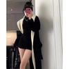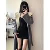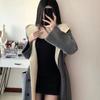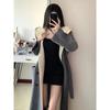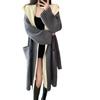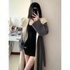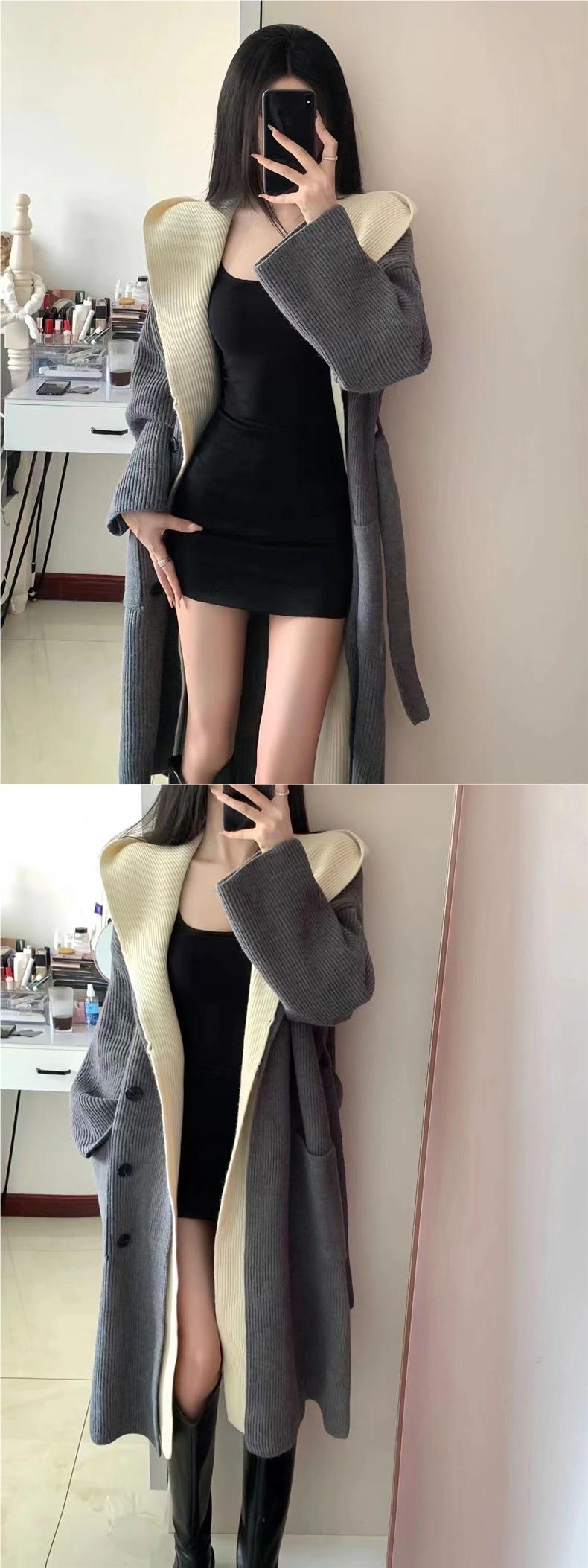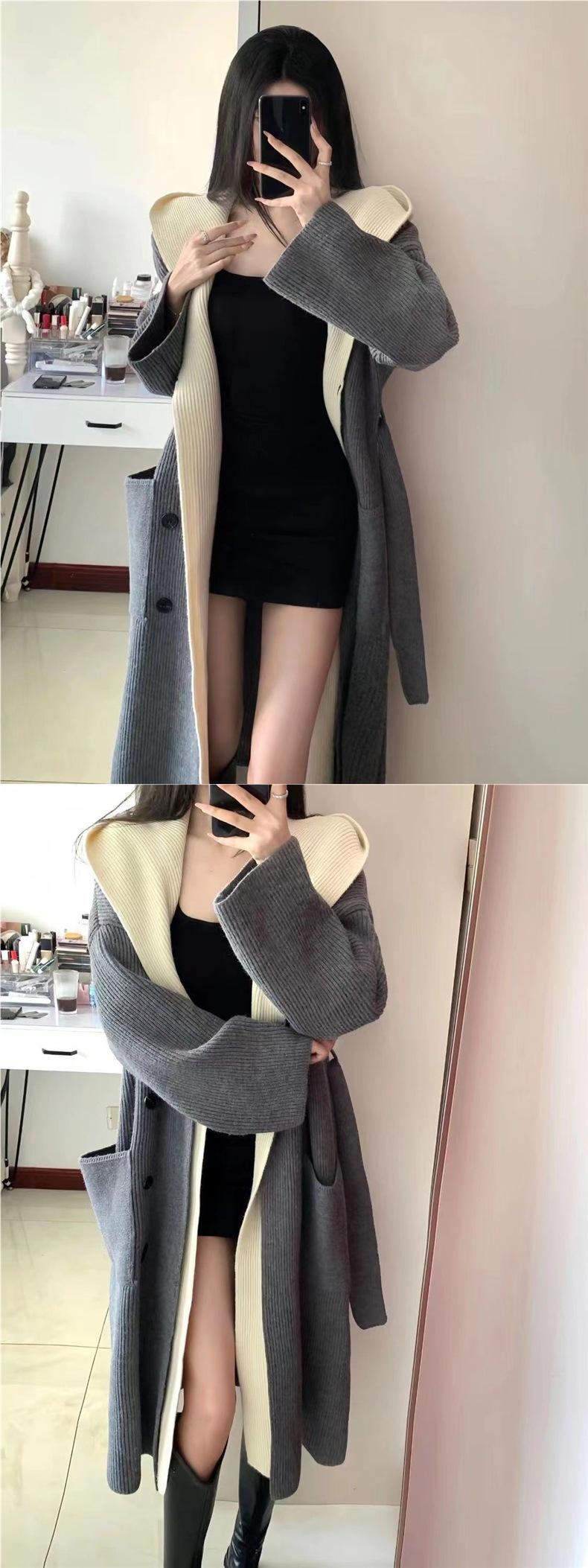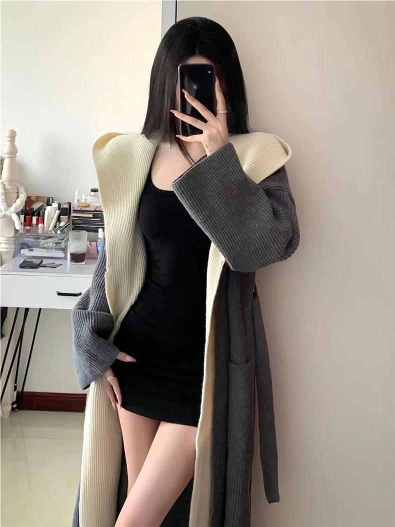 Cárdigan de punto con capucha de dos piezas falsas en bloque de color para mujer, otoño nuevo, temperamento nicho, sentido de producto nuevo, suéter holgado de longitud media