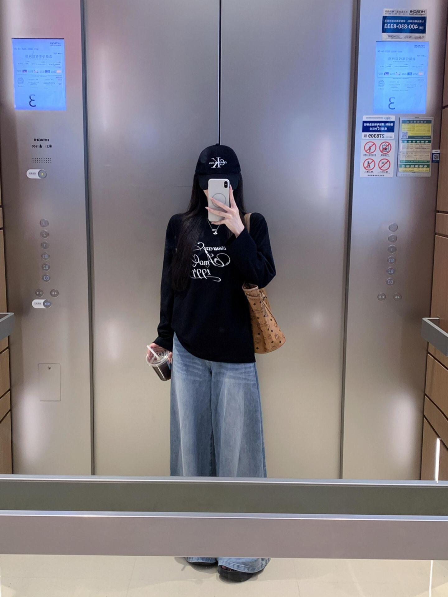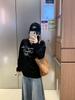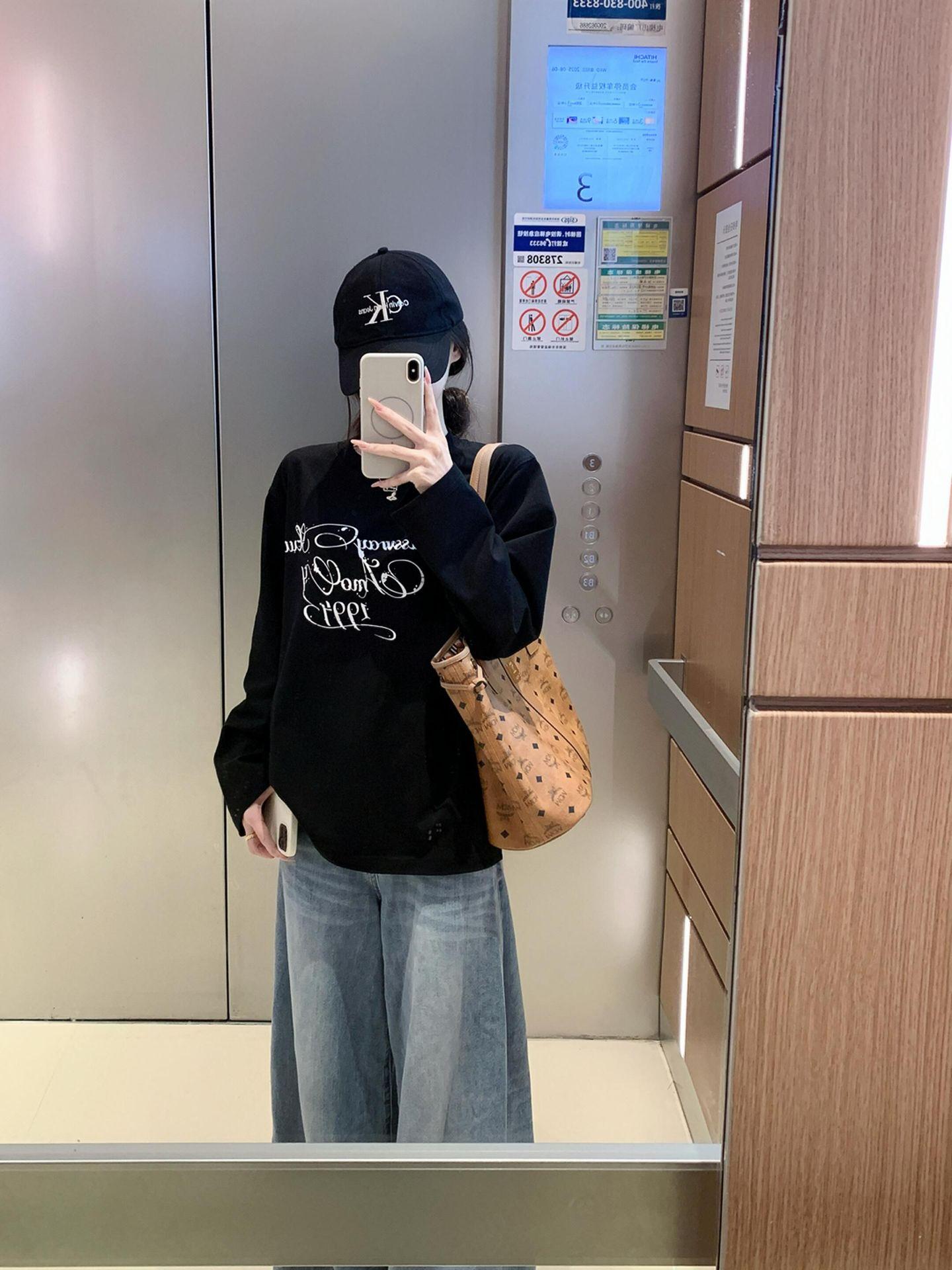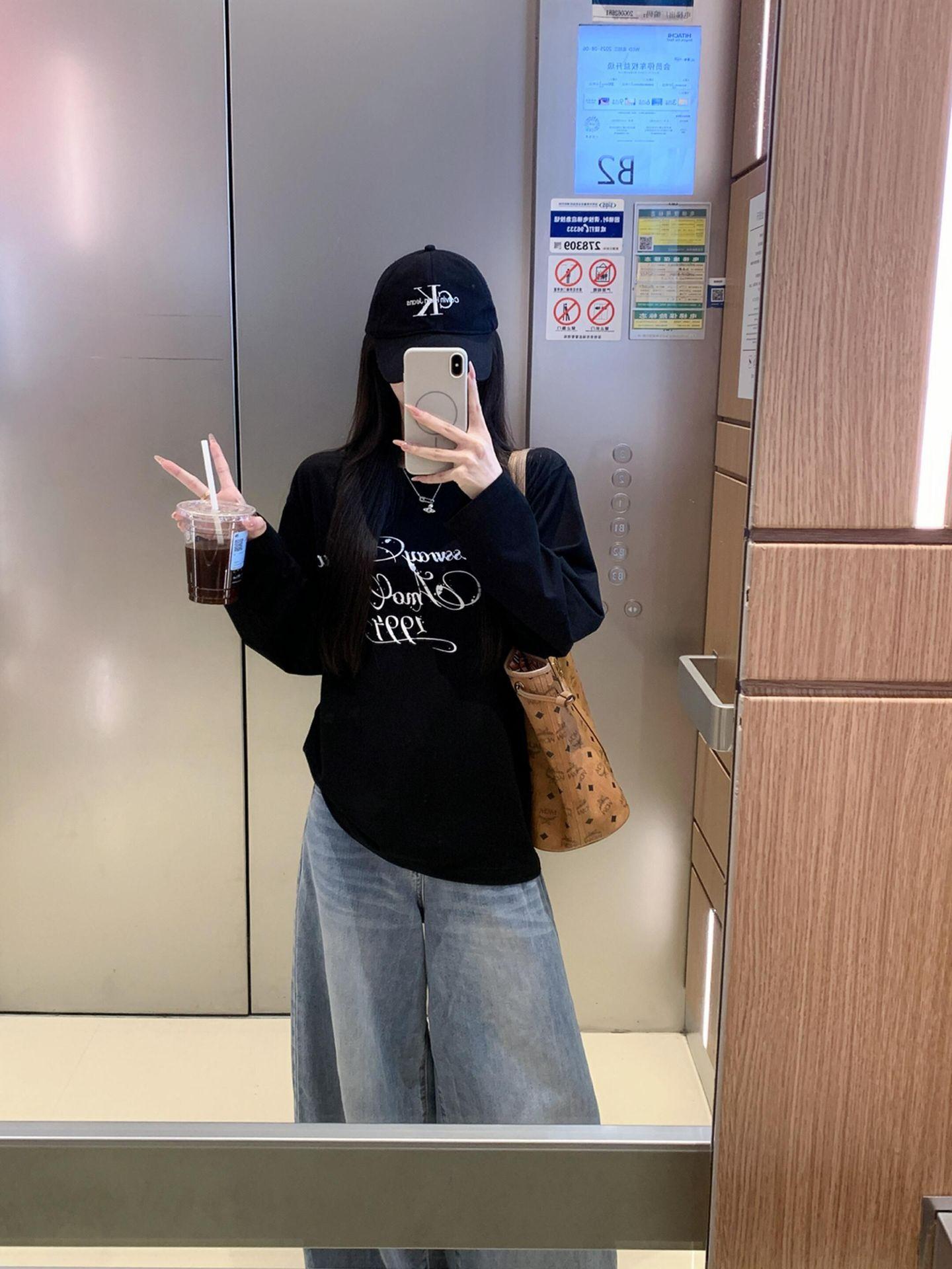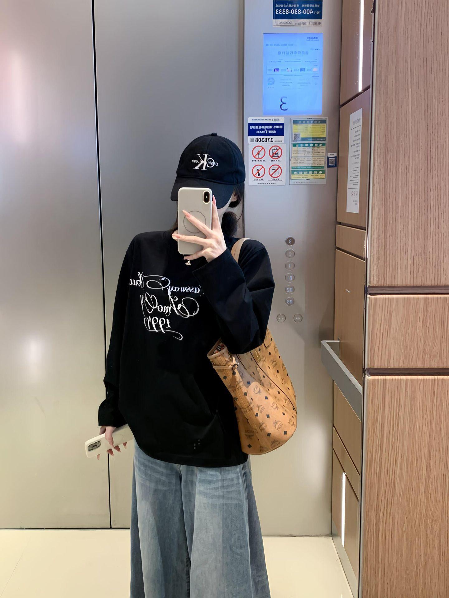 2025 Principios de Otoño Nueva Camiseta Holgada de Algodón Puro de Manga Larga para Mujer Estilo Coreano Estampado Moderno Estilo Relajado Versátil Top Básico