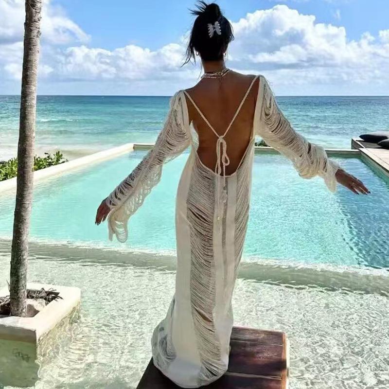 Vestido de Punto para Mujer de Verano Europeo y Americano 2023 Hueco Sexy Suelto Jersey Borla Color Sólido Bikini