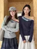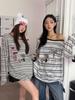 ME KAKAMEE Trece Líneas Tendencia Otoño Dibujo Animado KT Hombro Inclinado Bloque de Color Hombro Suelto Cuello Camiseta Manga Larga Mujer 8800