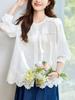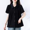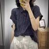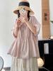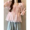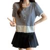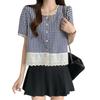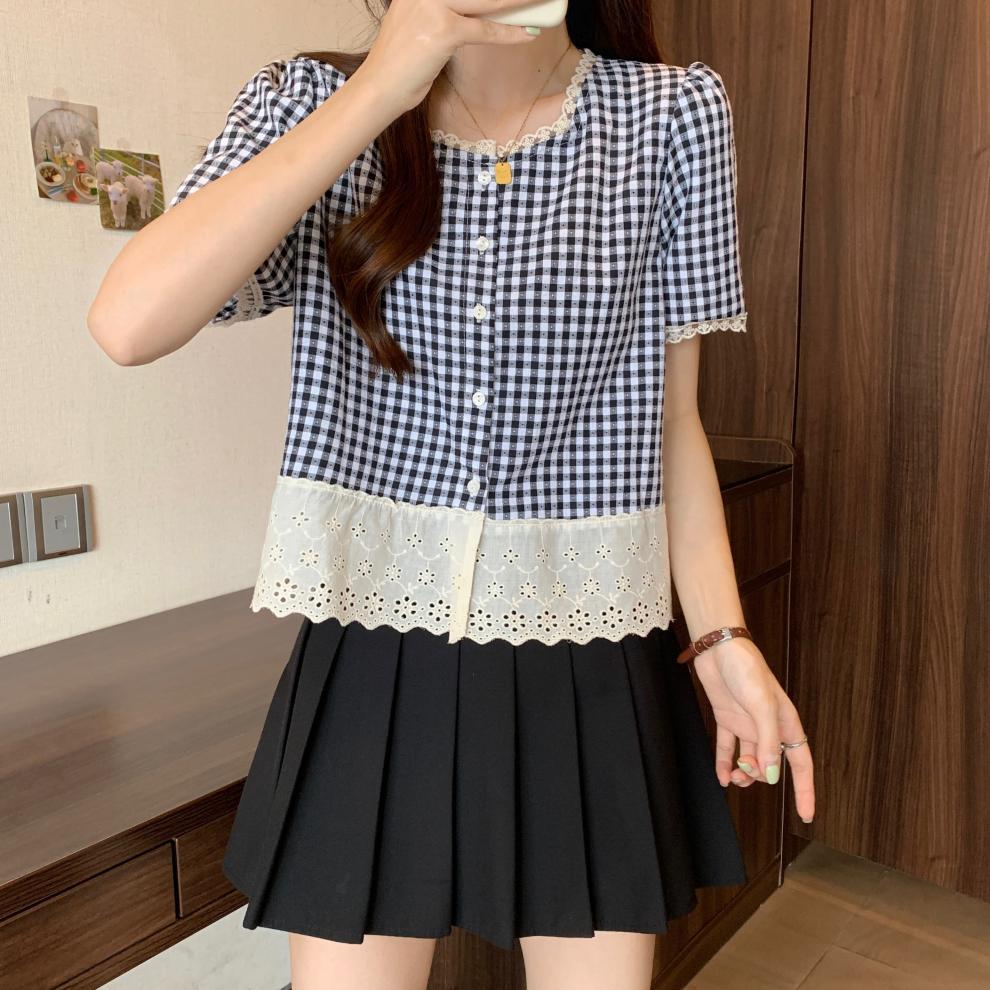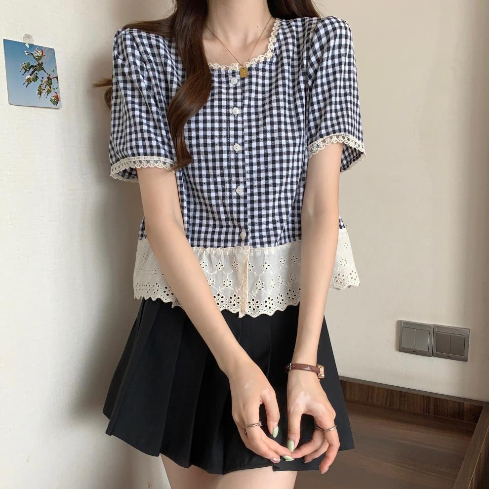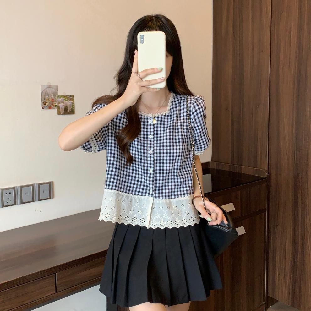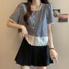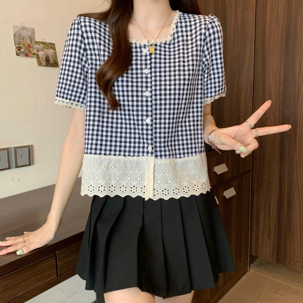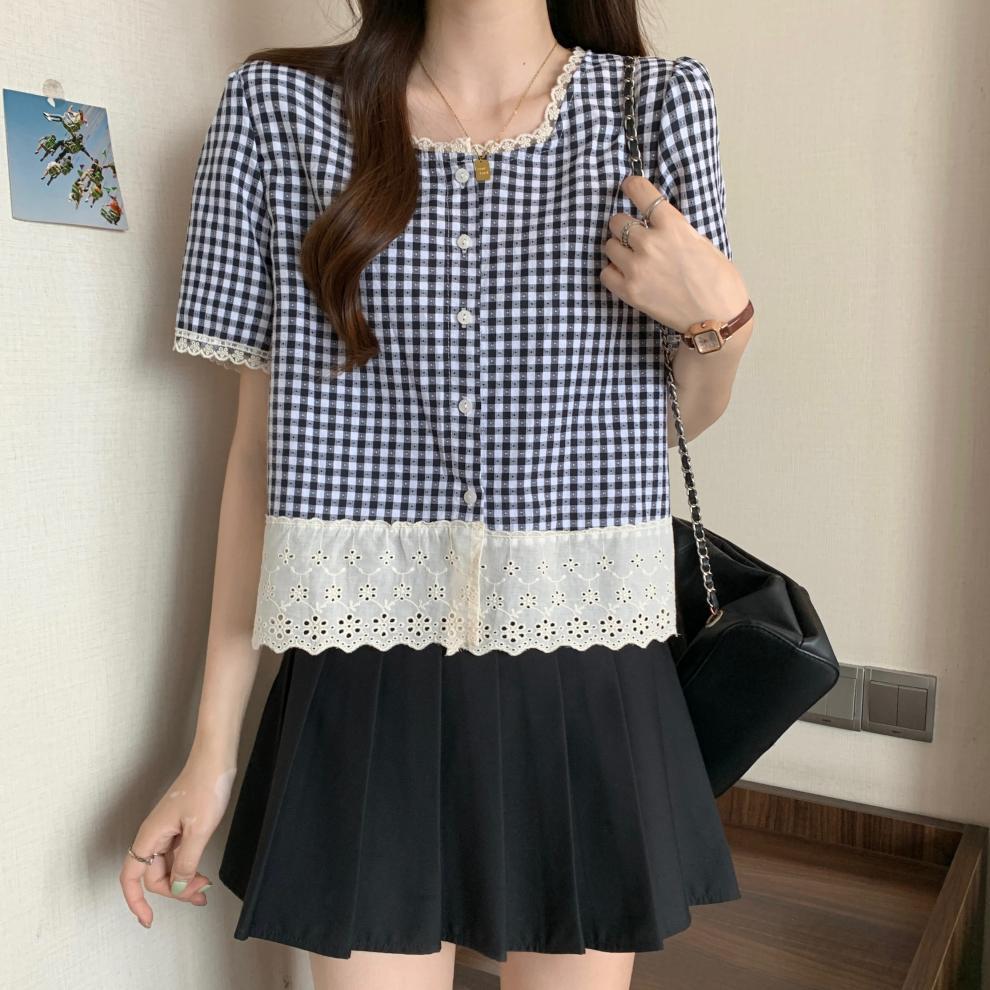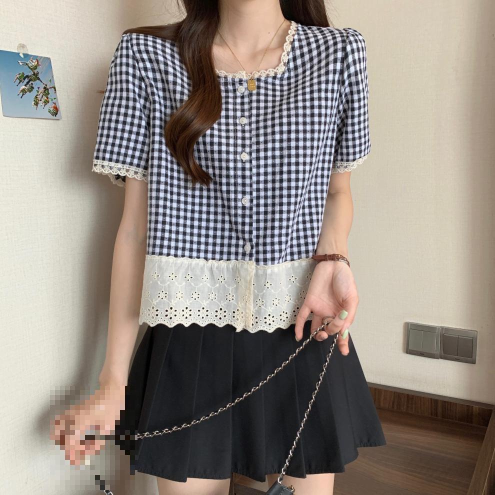 Camisa de Encaje Francés a Cuadros de Talla Grande para Mujer Verano 2025 Nueva Look Adelgazante mm para Gorditas Suelta Cuello Cuadrado Top Hombro Derecho