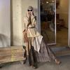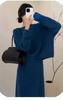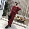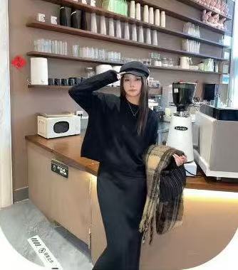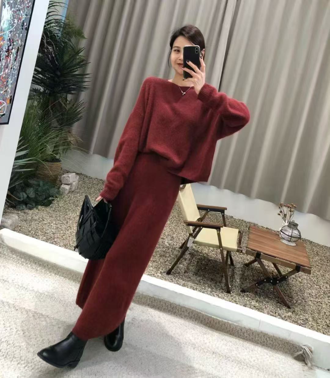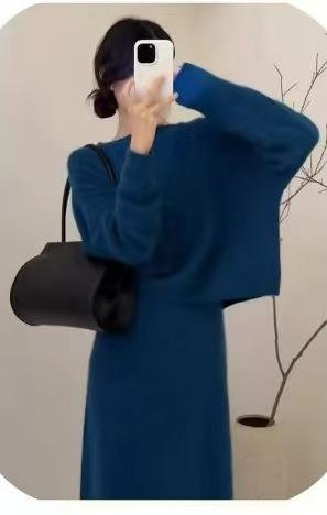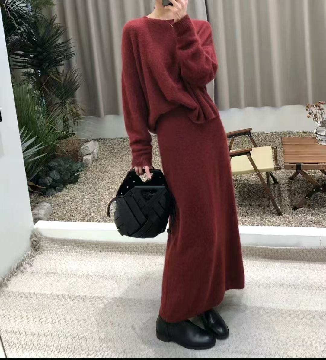 Nuevo Suéter de Punto de Cuello Redondo Francés de Otoño/Invierno para Mujer, Holgado, Casual, Estilo Lazy, Versátil, Falda Media + Jersey de Dos Piezas