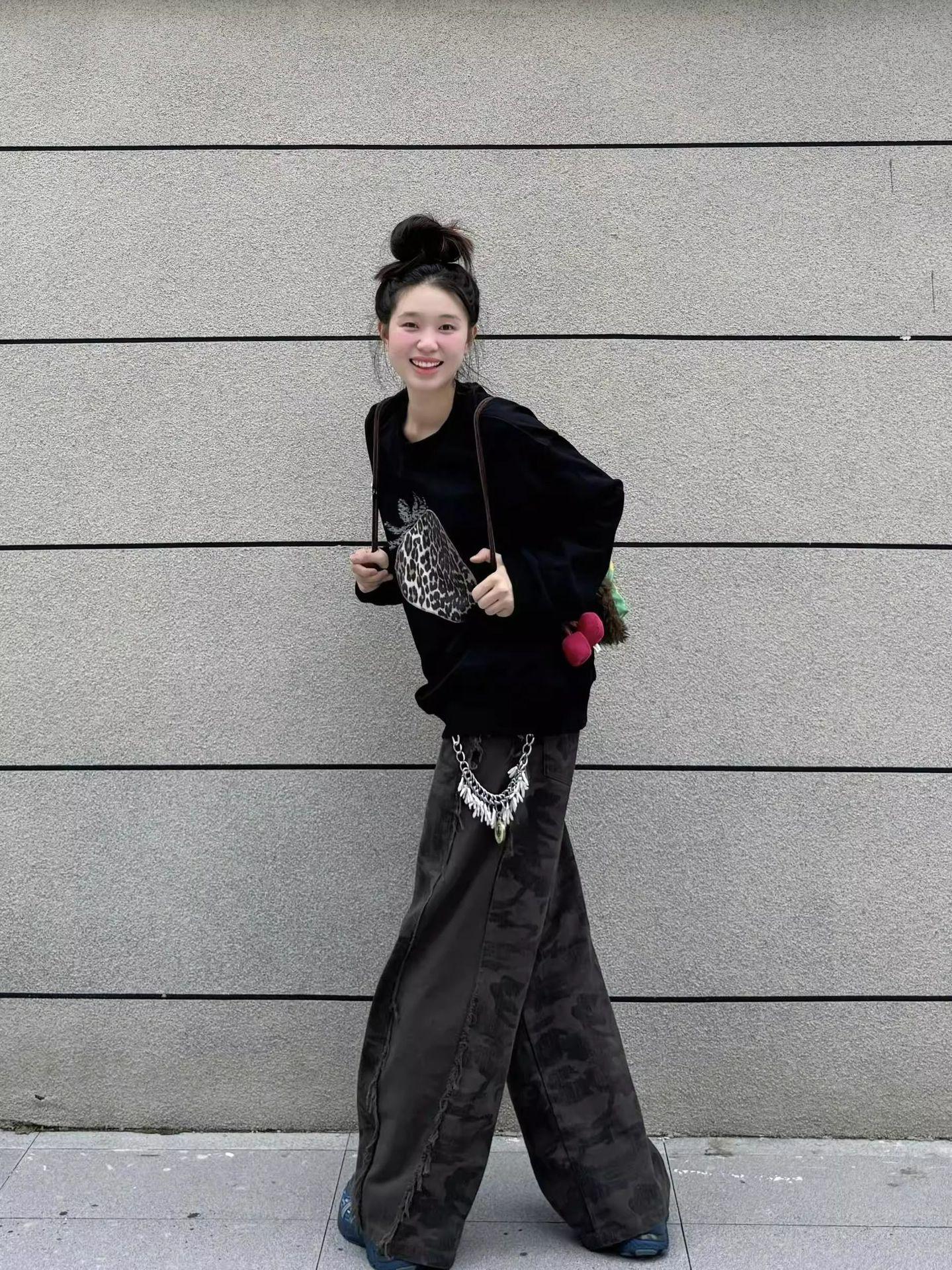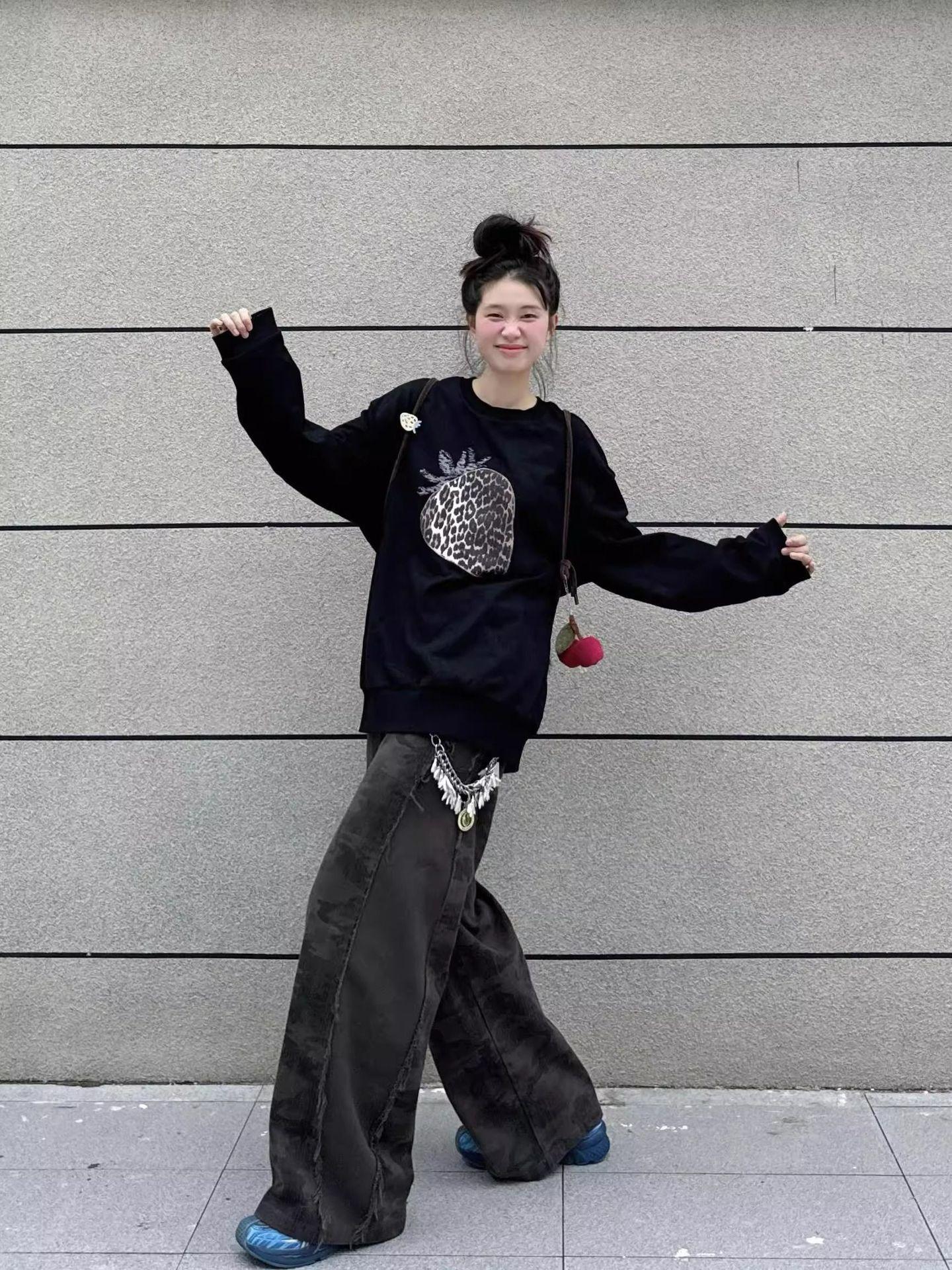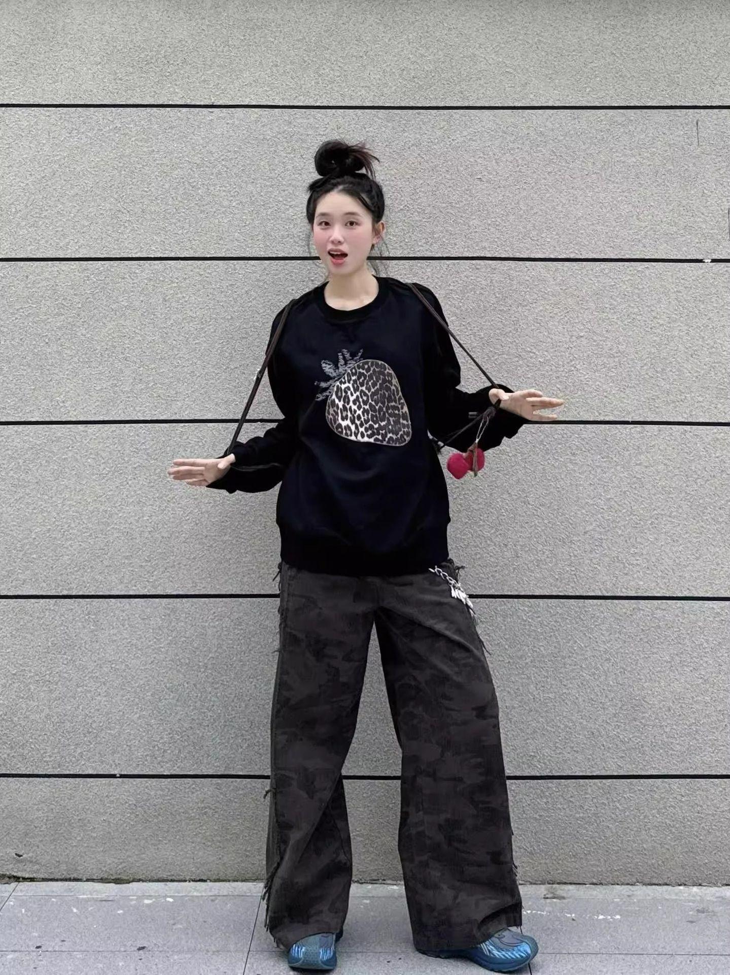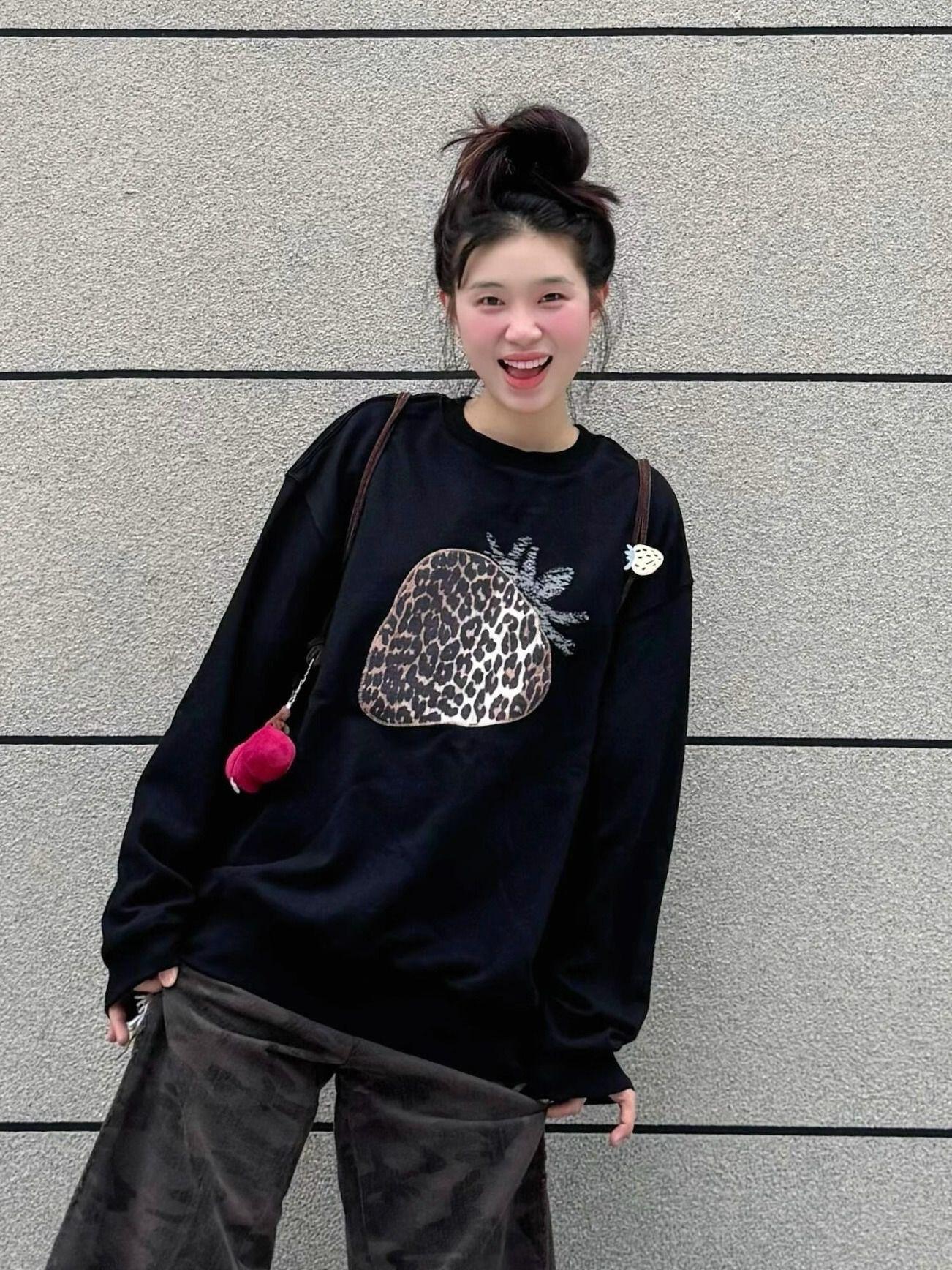 Sudadera Fina de Cuello Redondo con Estampado de Leopardo Retro Americano y Fresas para Mujer, Otoño Nuevo, Holgada, de Alta Gama