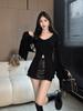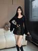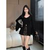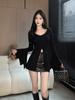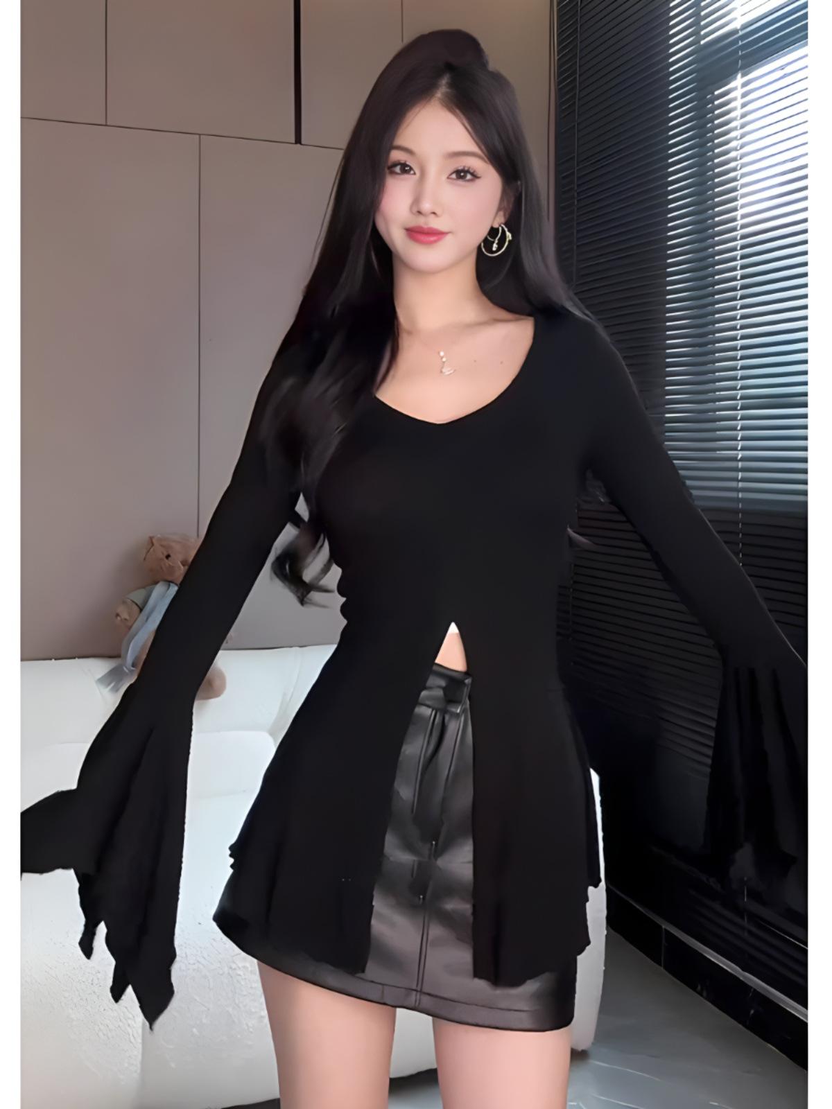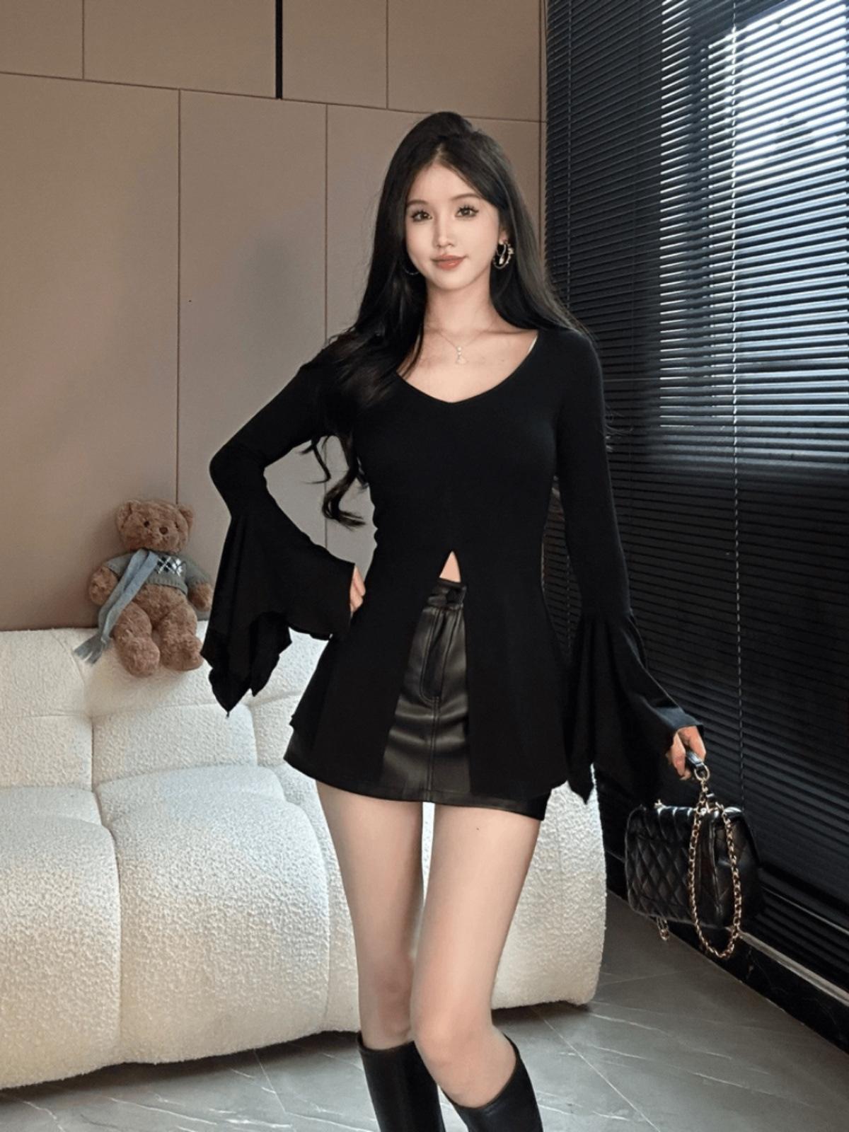 Camiseta de Manga Larga con Cuello en V y Manga Acampanada para Mujer, Estilo Americano, Otoño, Ajustada, Diseño Adelgazante, Abertura, Negra, Versátil