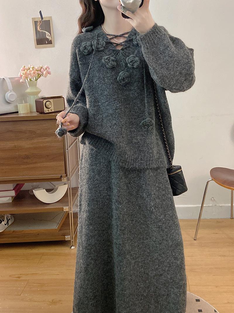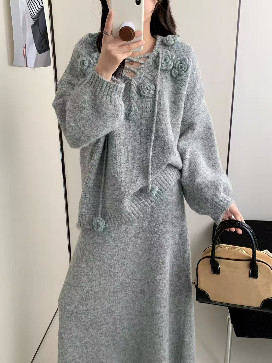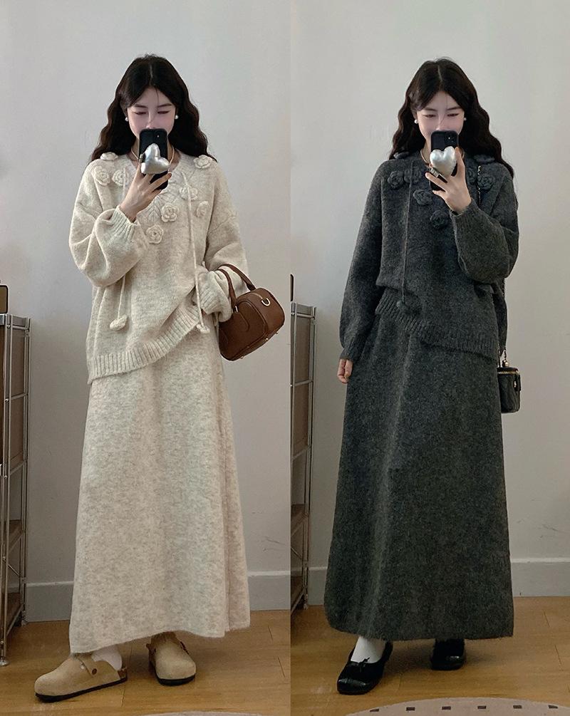 Conjunto Talla Grande 2025 Otoño/Invierno Nuevo Dulce Francés Diseño Floral Sentido Suéter Tejido Falda Conjunto de Dos Piezas