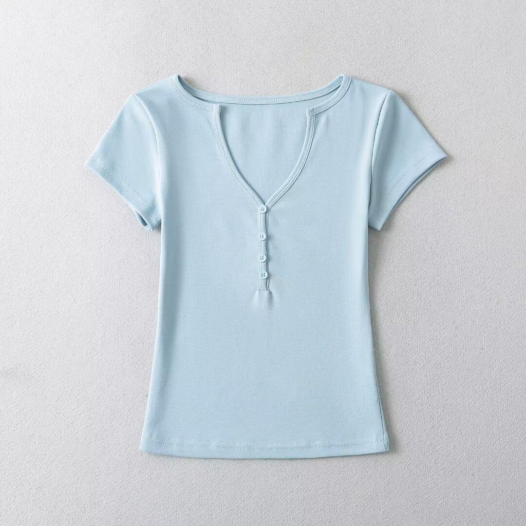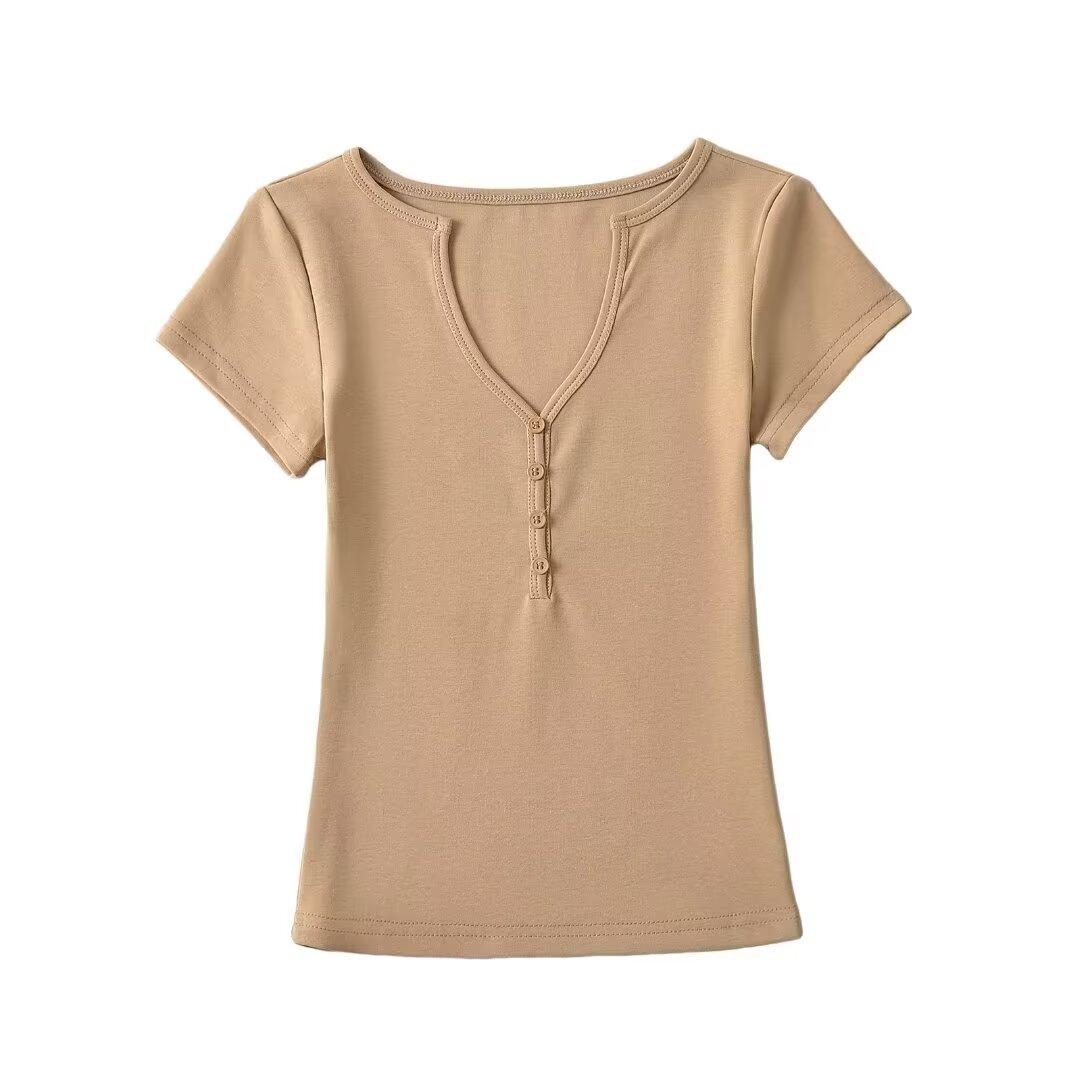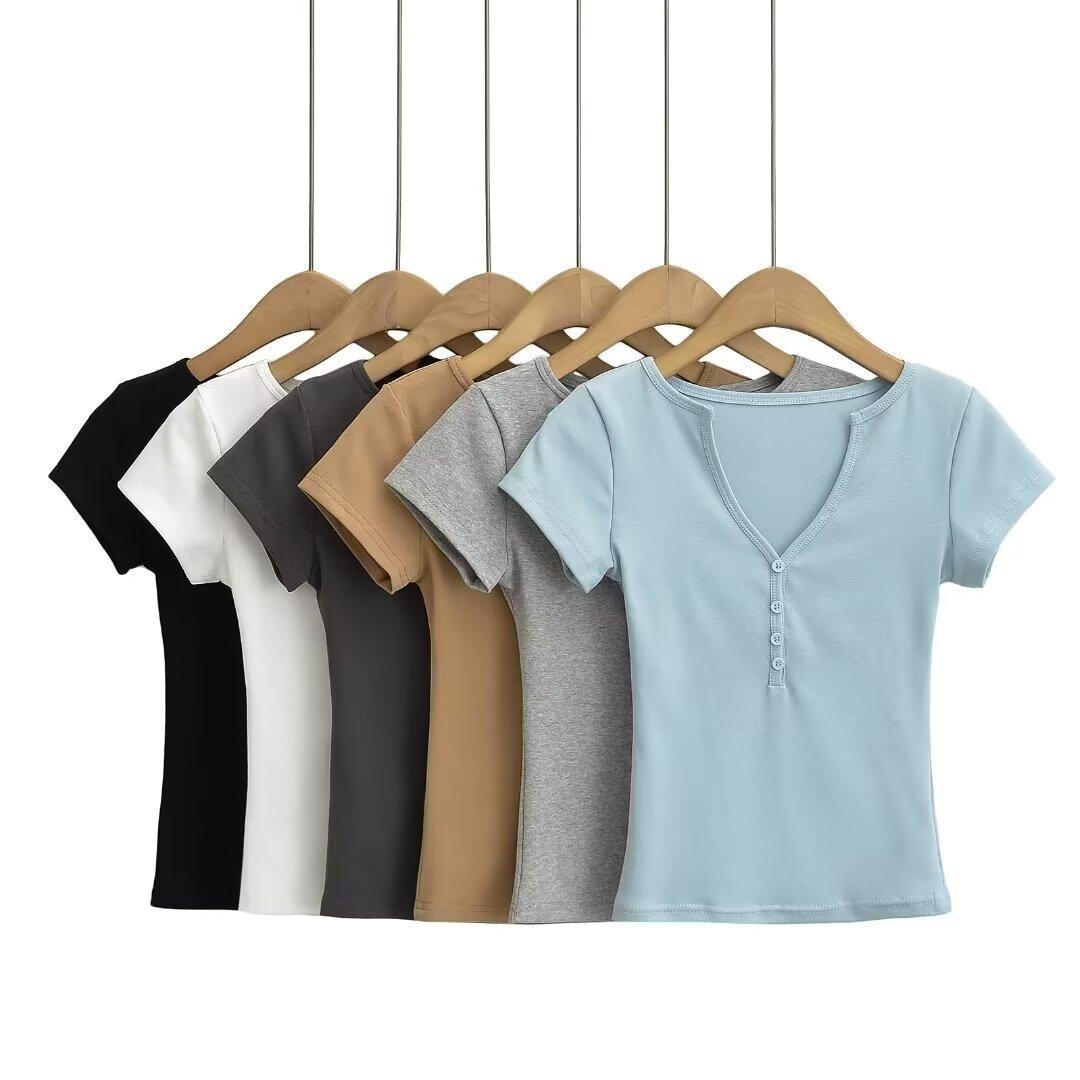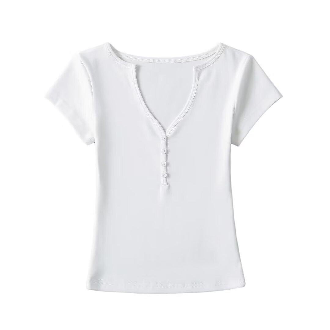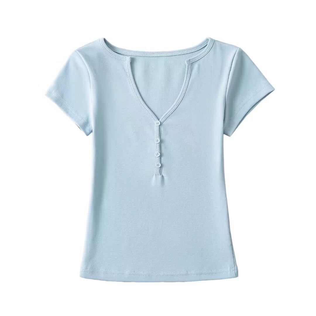 Camiseta de Manga Corta con Cuello en V para Chica Caliente Estilo Americano para Mujer Verano Sentido del Diseño Ajustada Adelgazante Color Sólido Top de Hombro