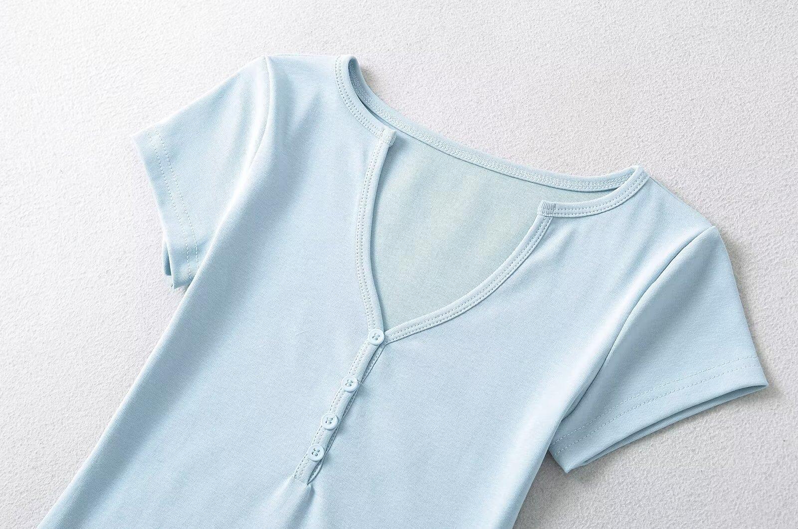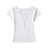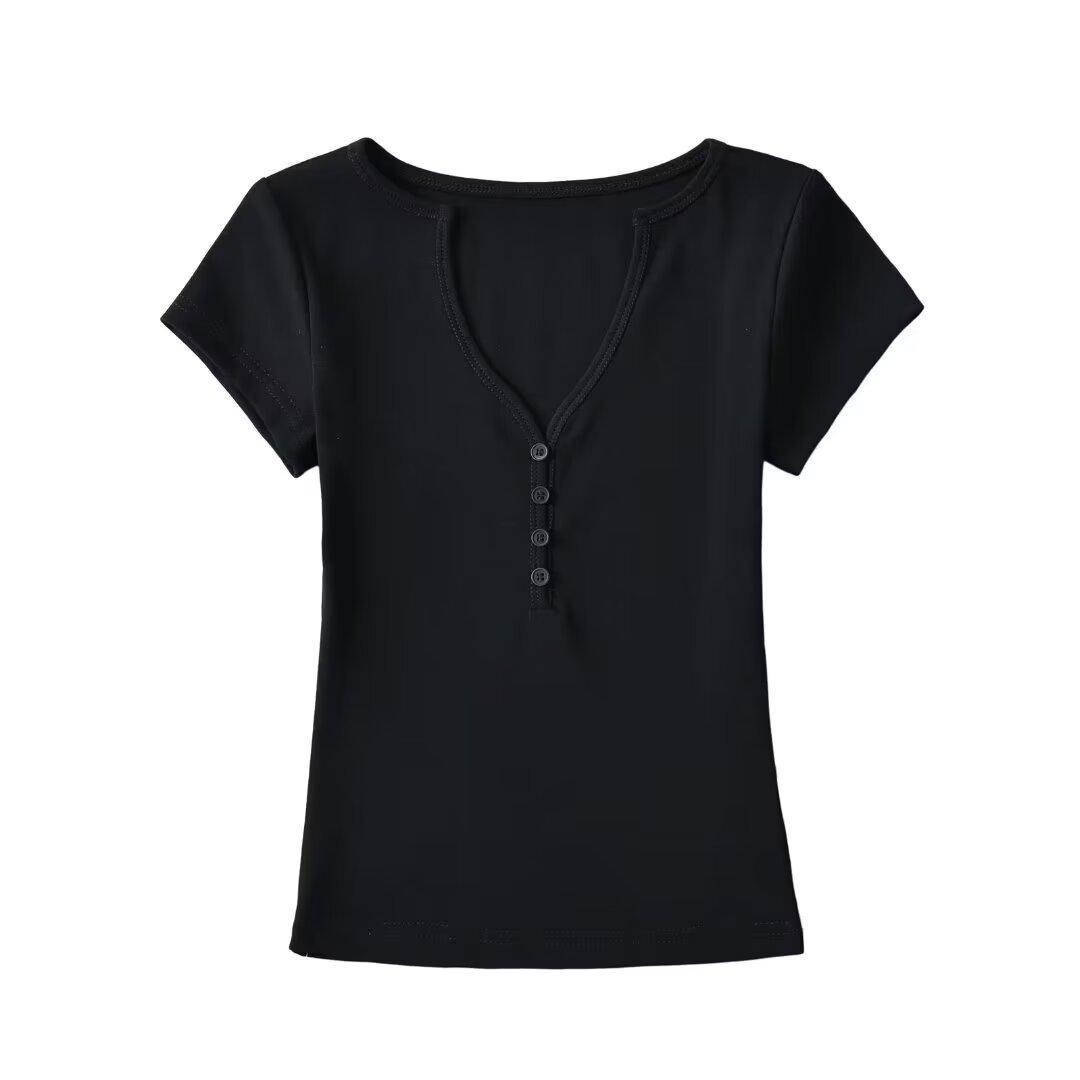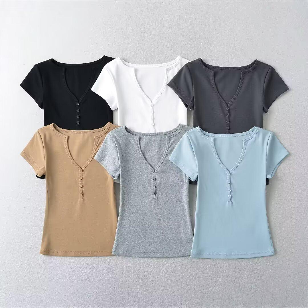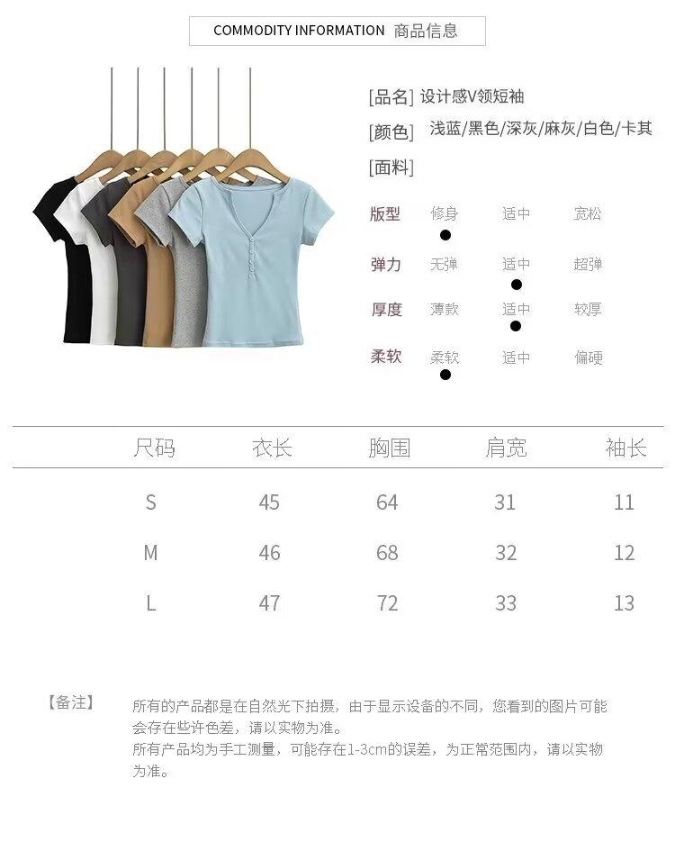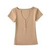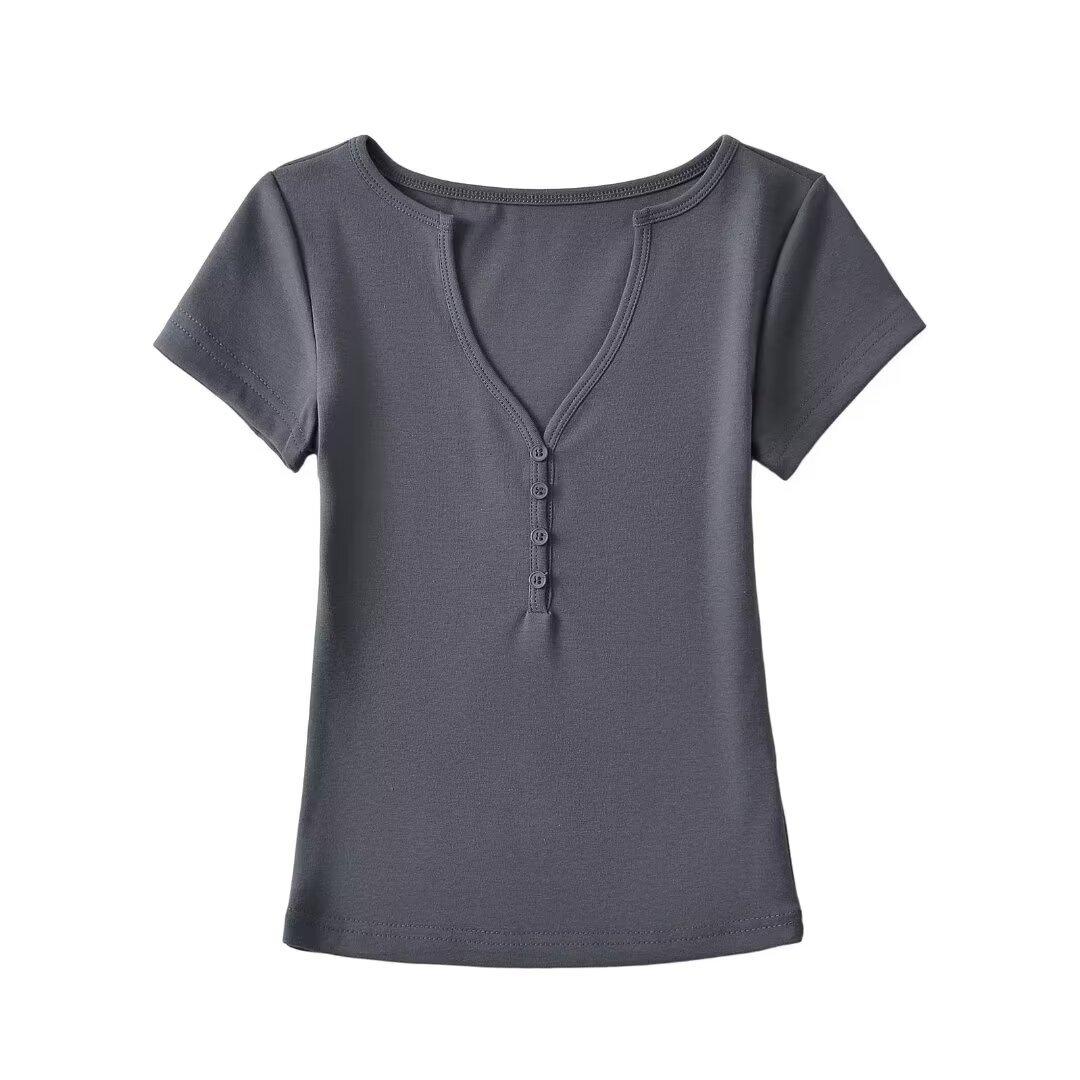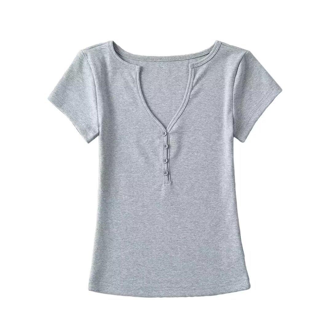 Camiseta de Manga Corta con Cuello en V para Chica Caliente Estilo Americano para Mujer Verano Sentido del Diseño Ajustada Adelgazante Color Sólido Top de Hombro