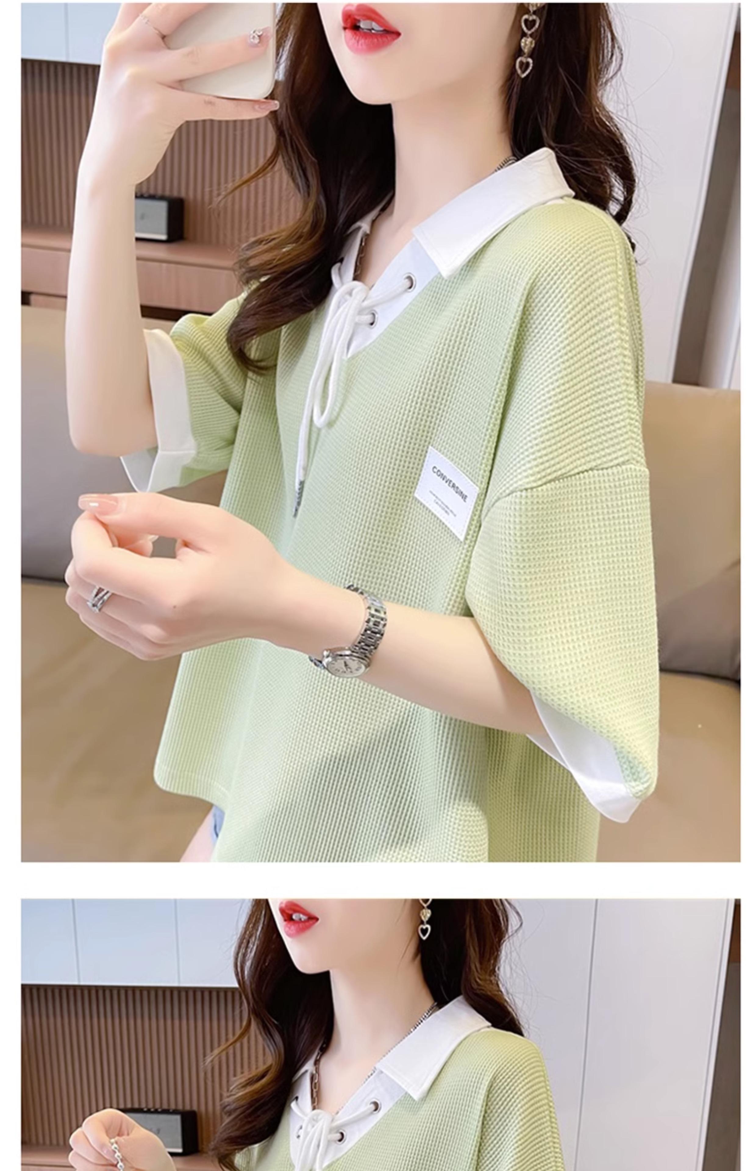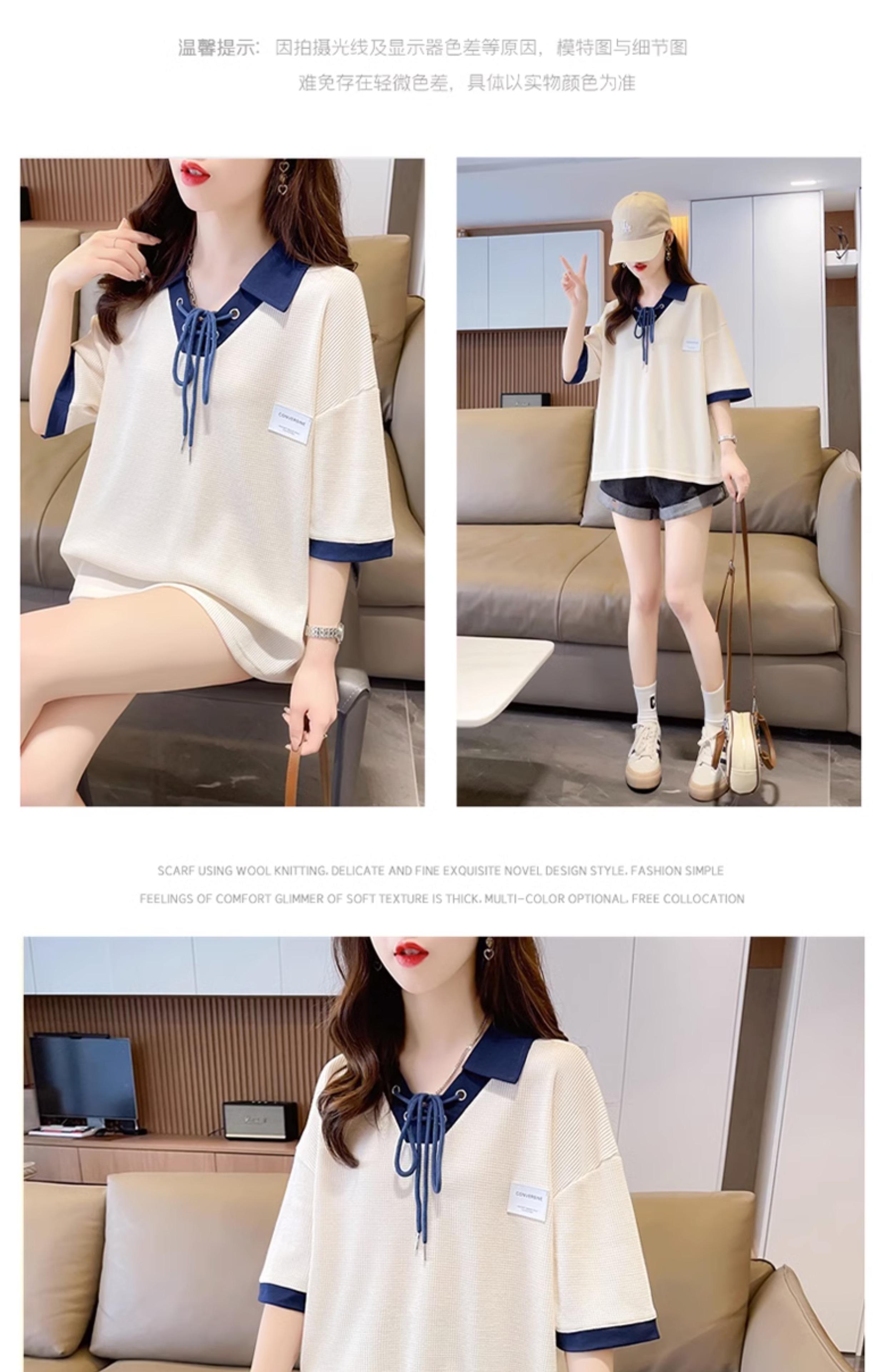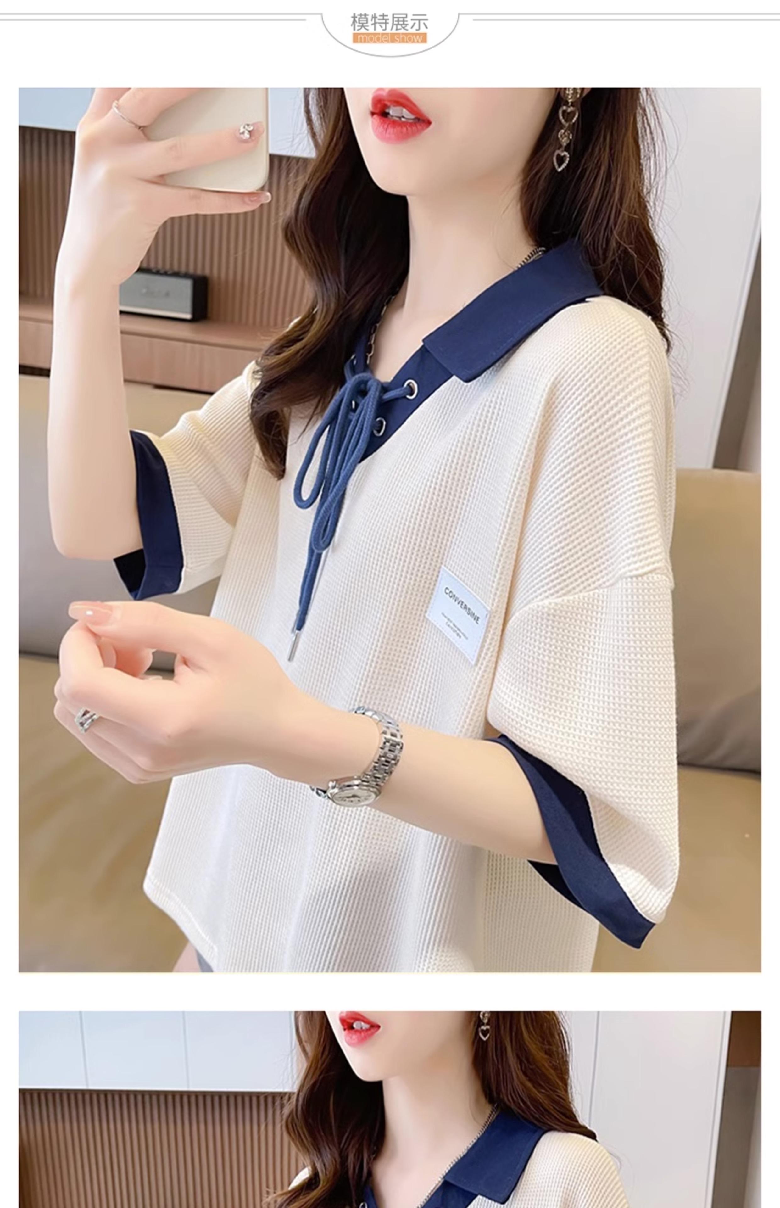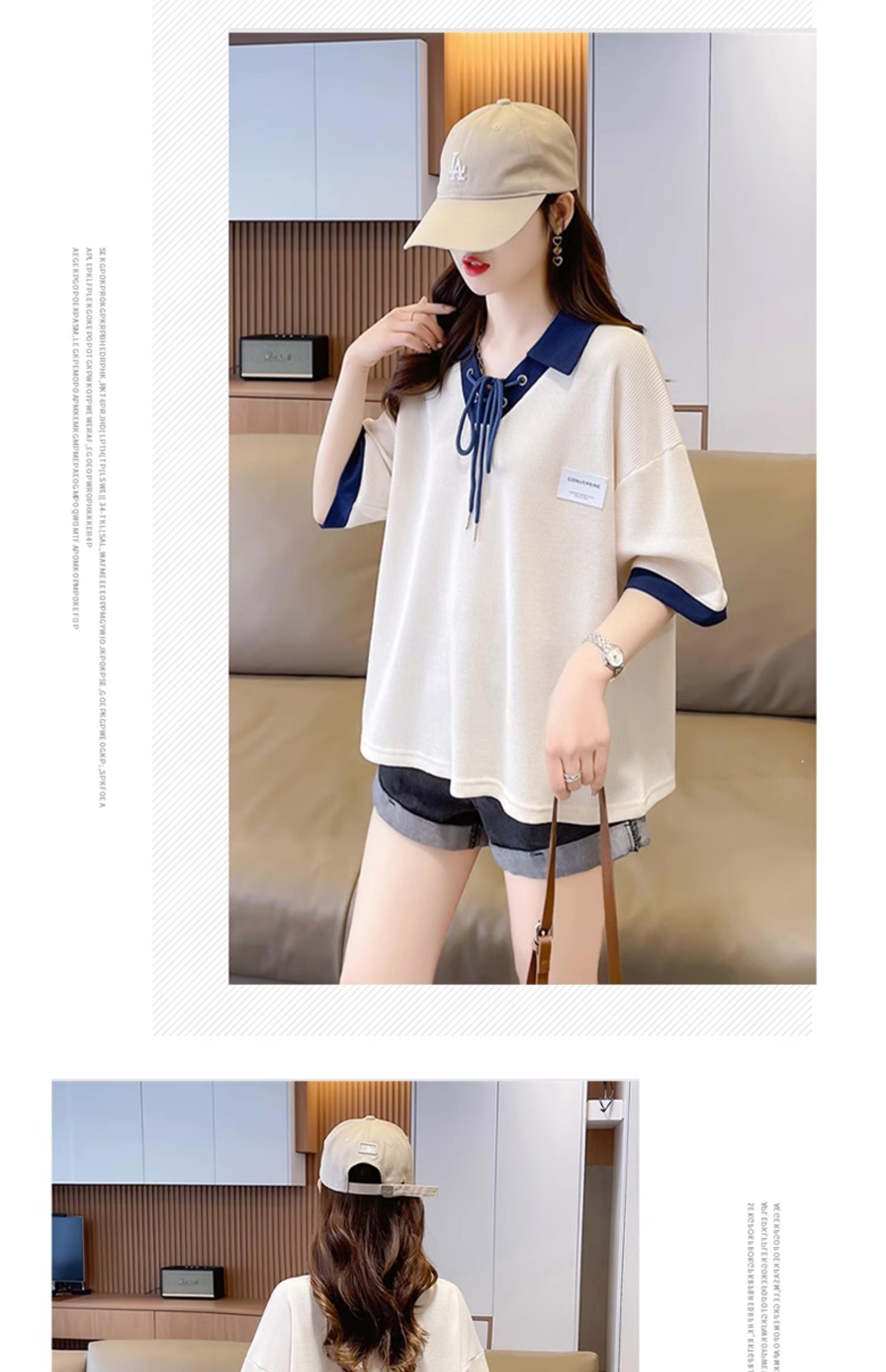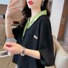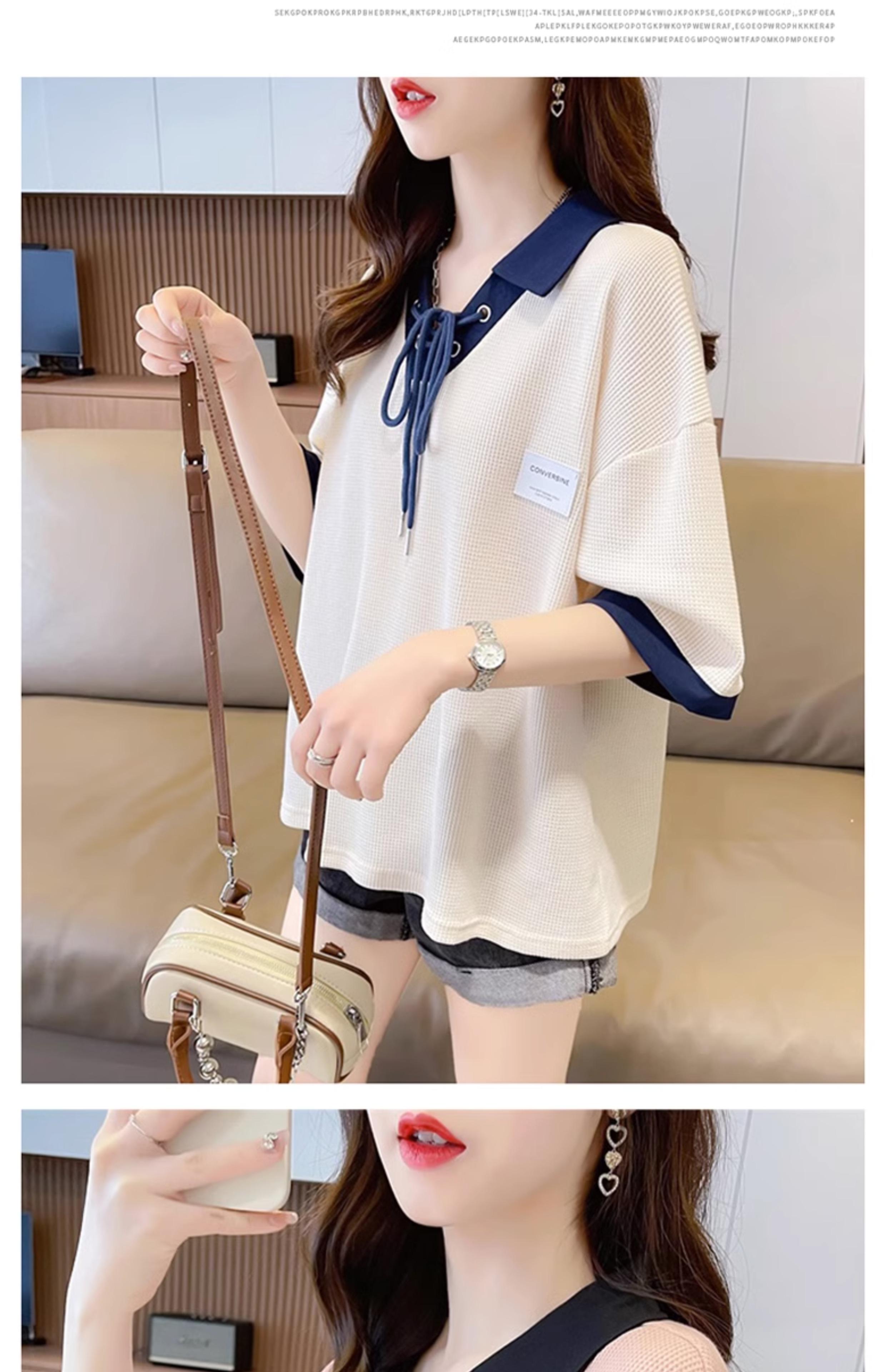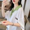 Playera de Manga Corta con Cuello Polo y Empalme para Mujer Verano 2025 Nuevo Top de Diseño Pequeño y Elegante de Estilo Coreano Holgado