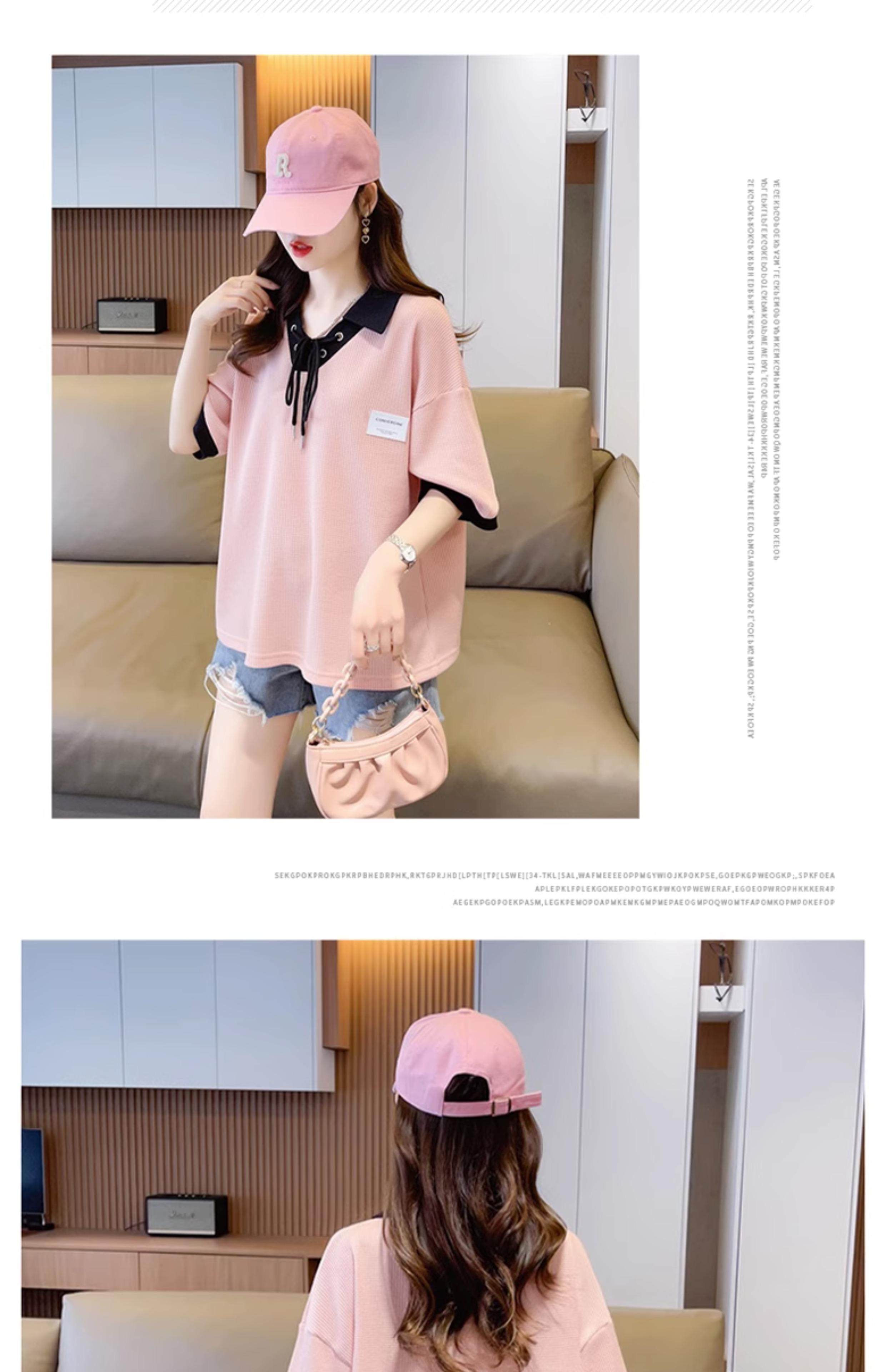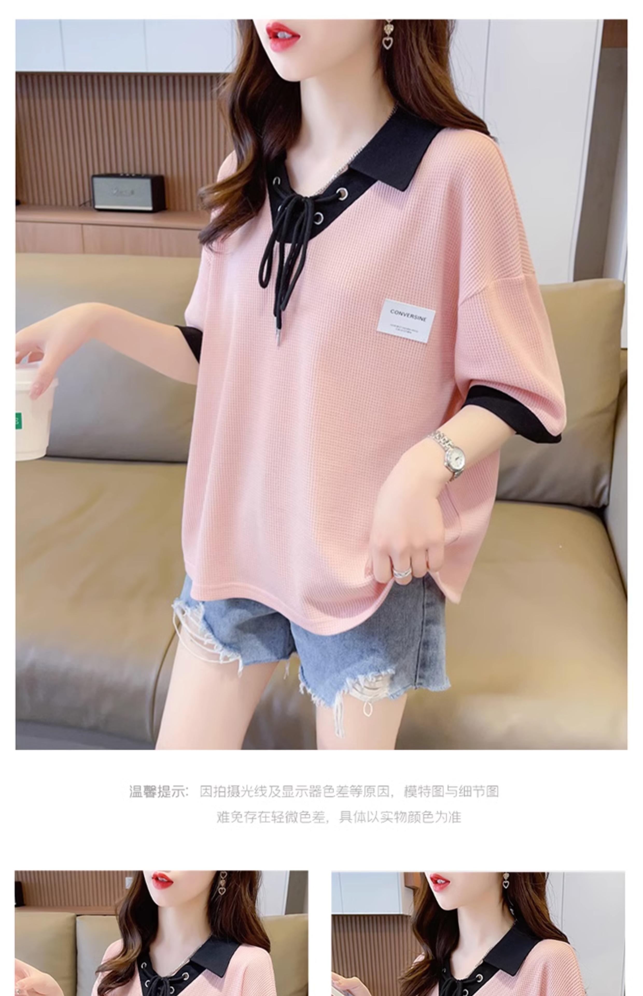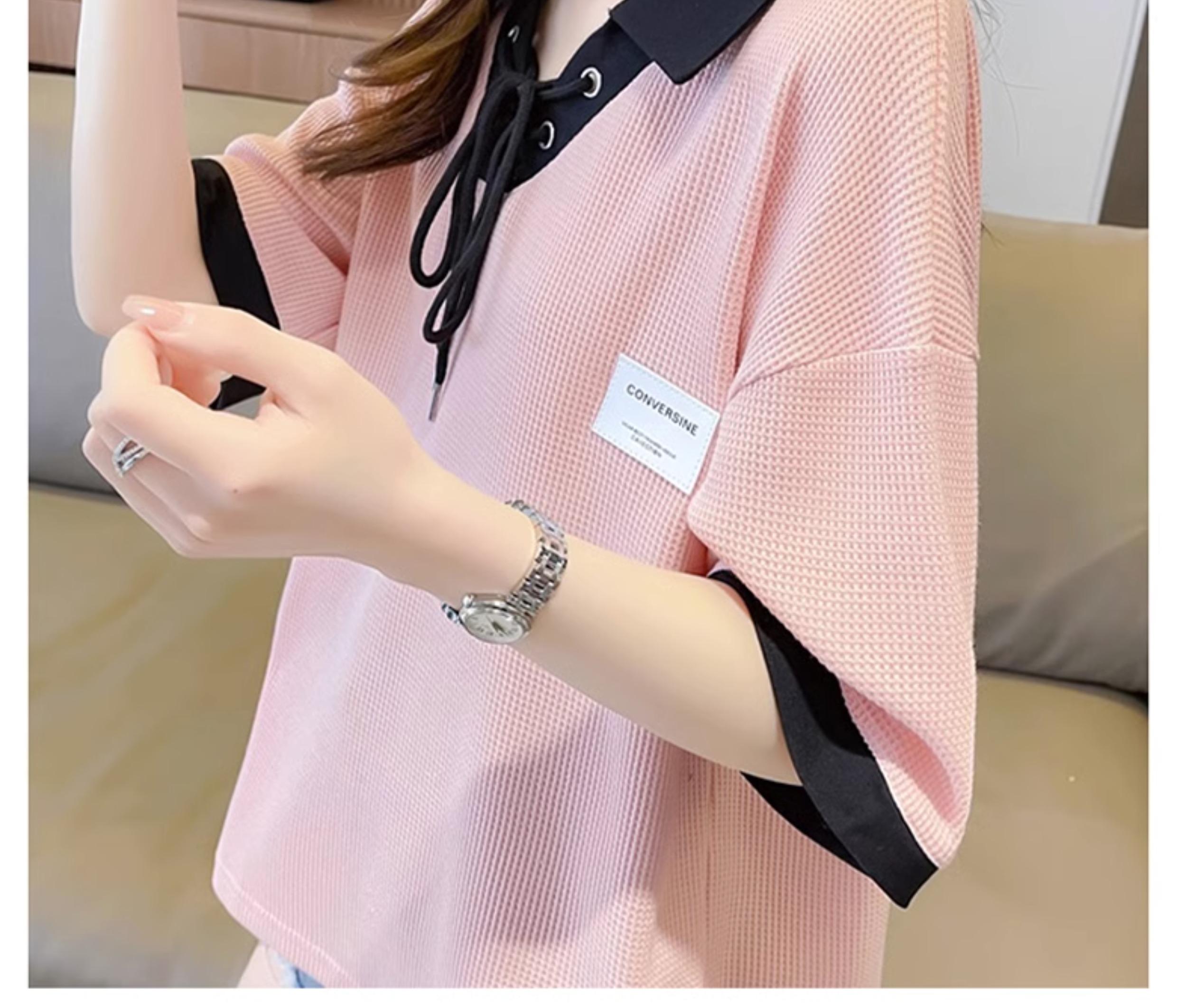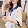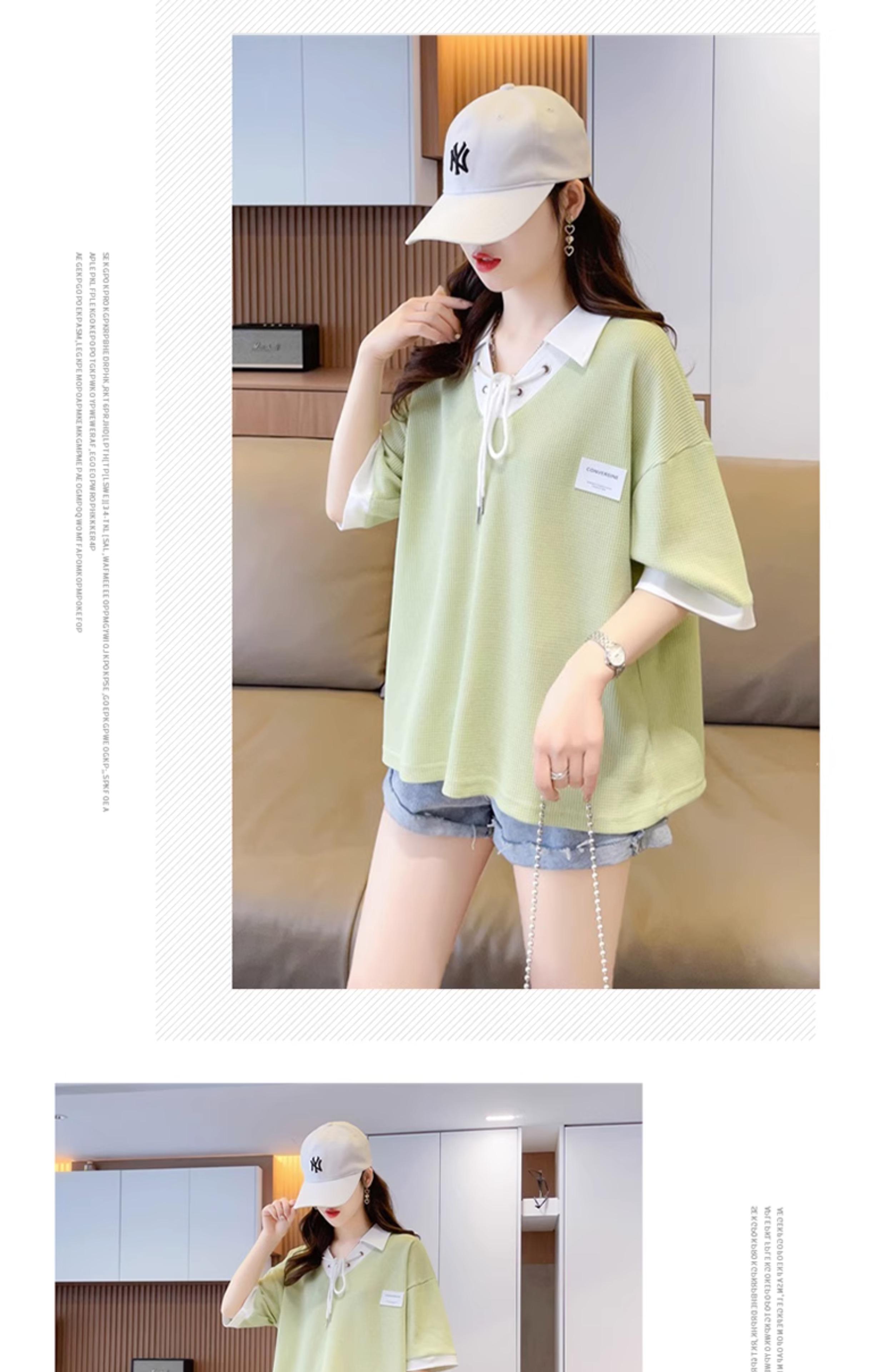 Playera de Manga Corta con Cuello Polo y Empalme para Mujer Verano 2025 Nuevo Top de Diseño Pequeño y Elegante de Estilo Coreano Holgado